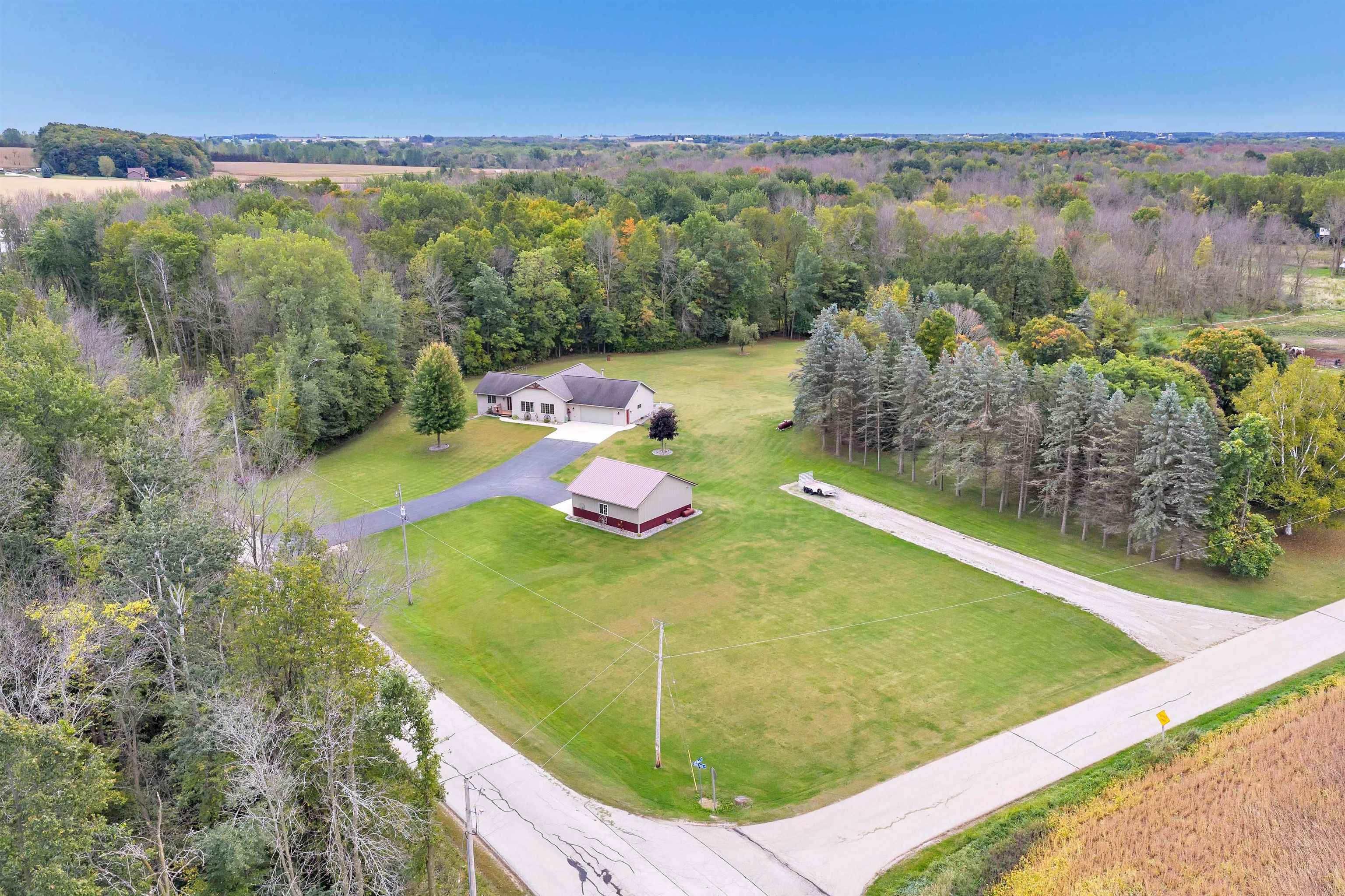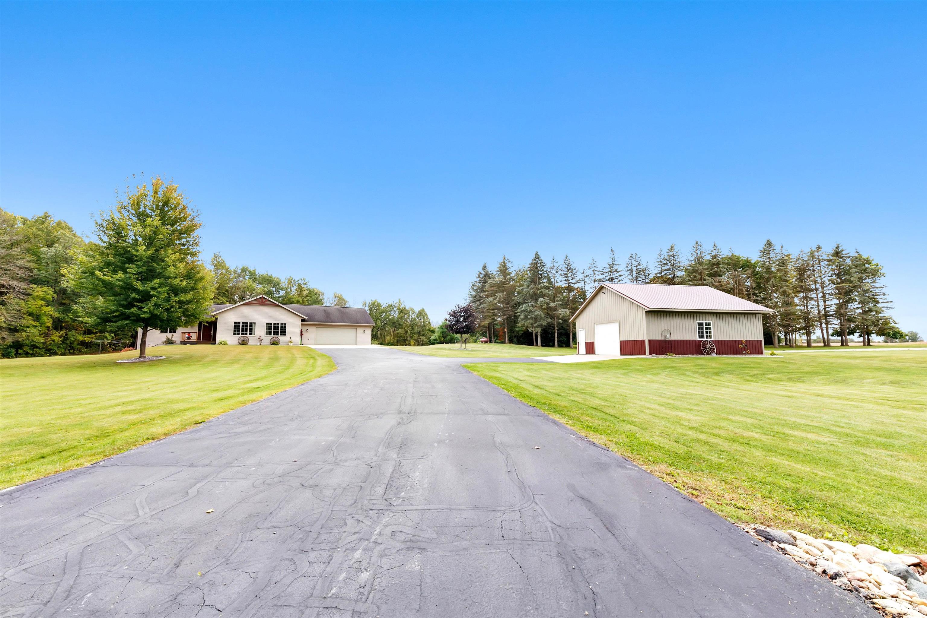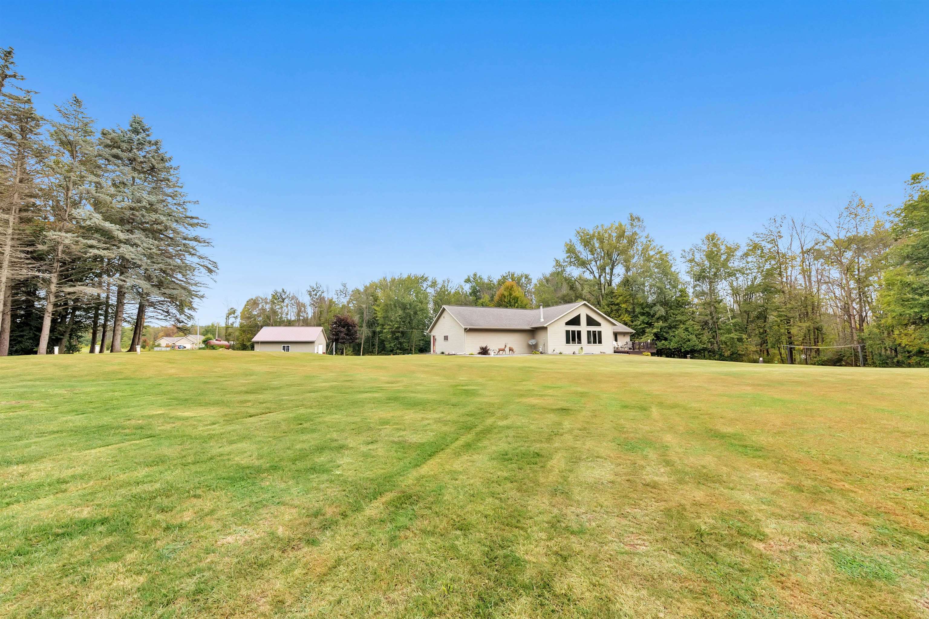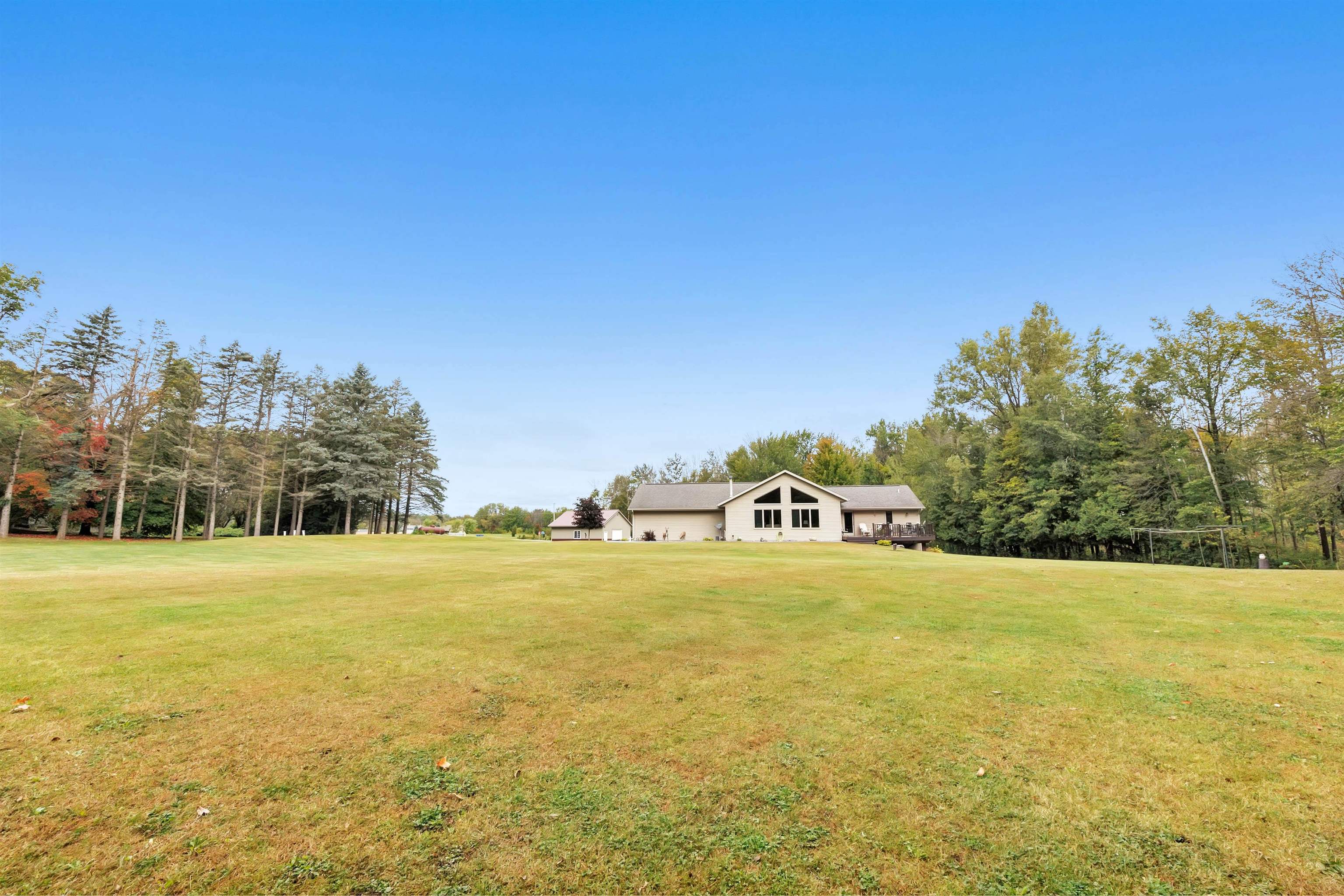 Exceptionally well maintained custom home on beautiful acreage. Property is conveniently located between Appleton, Green Bay, Shawano, and Pulaski. Home features a great open concept floorplan with stunning views of the property throughout. Main floor features a great flex space off the garage, currently being used as an office, 2 bedrooms and 2 full baths. Spacious living, dining, and kitchen area - great for entertaining. Kitchen has gorgeous hickory cabinets. Wood burning fireplace in living room. Lower level rec room features large windows, half bath, and abundant storage. Detached garage ready for your next project! Garage is heated and insulated. Garage has an outlet for welding. Path in woods great for walking! Move-in ready home!