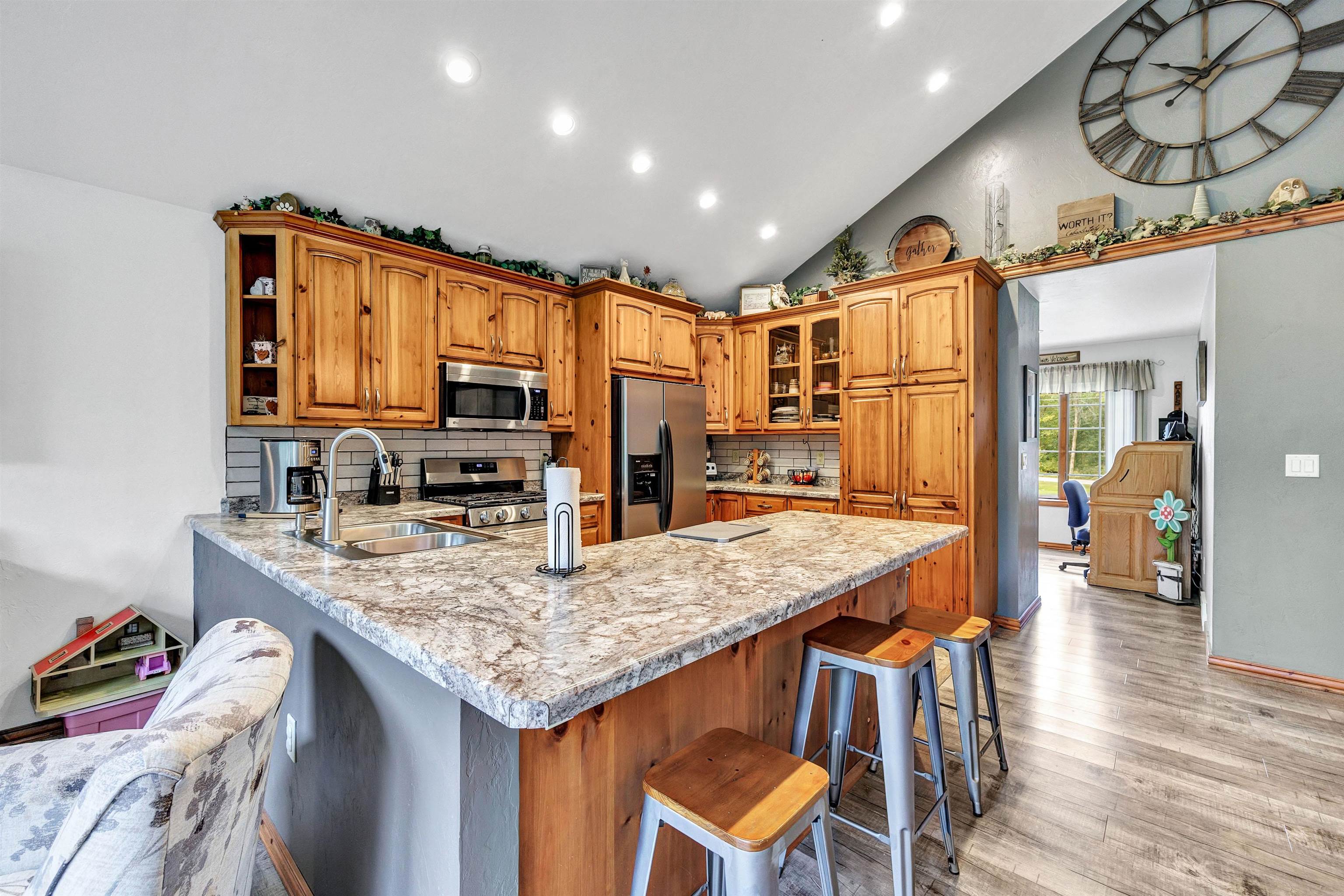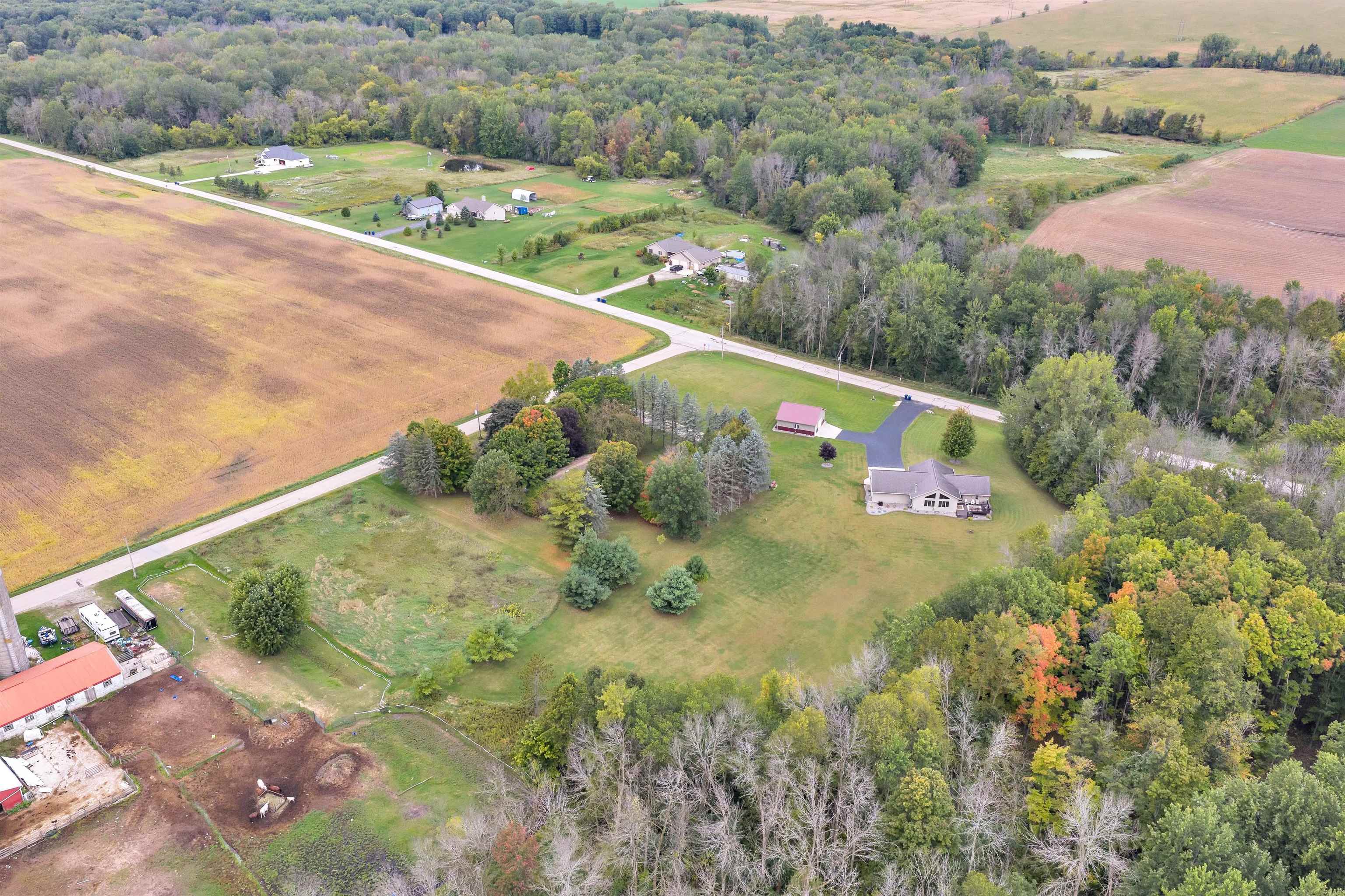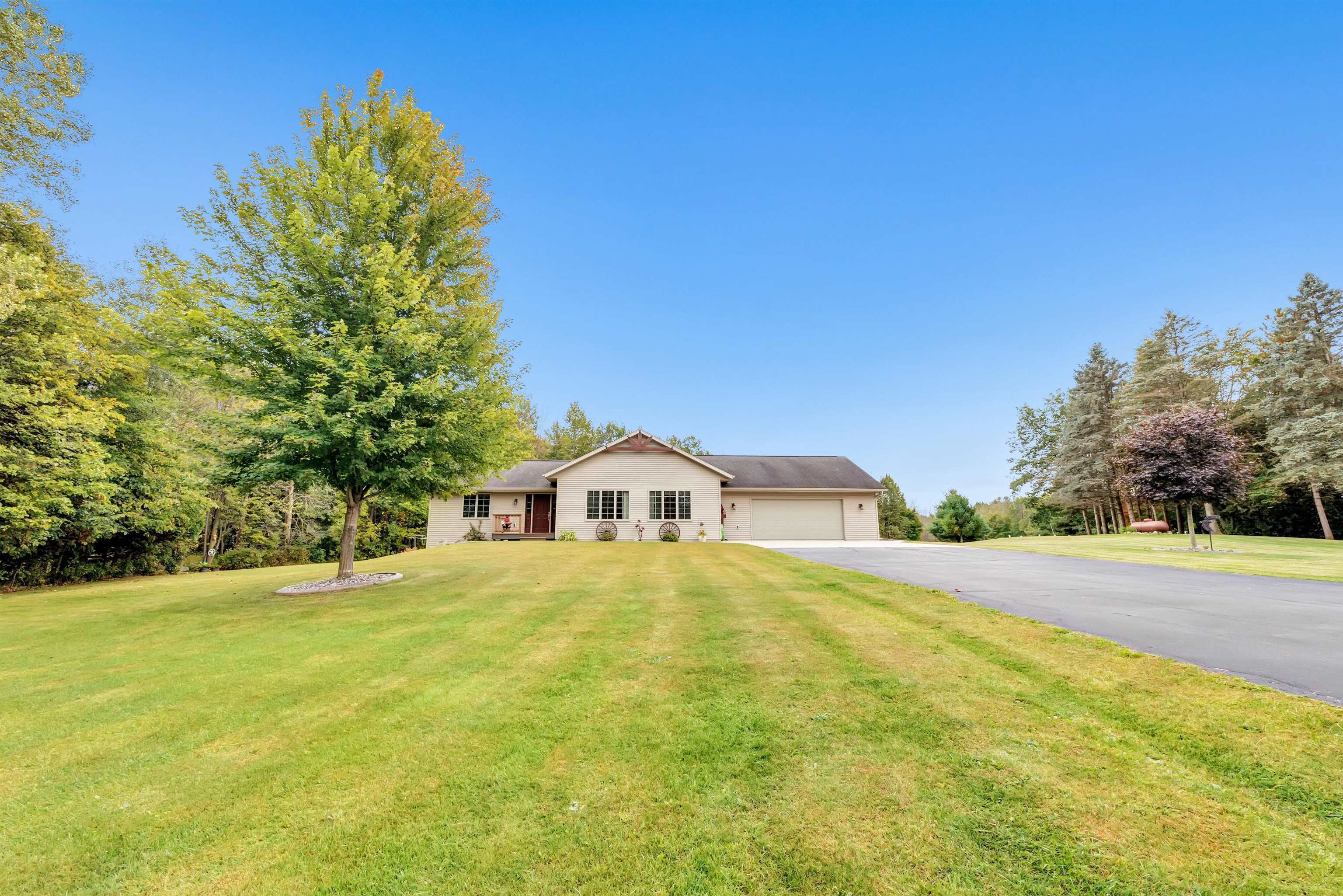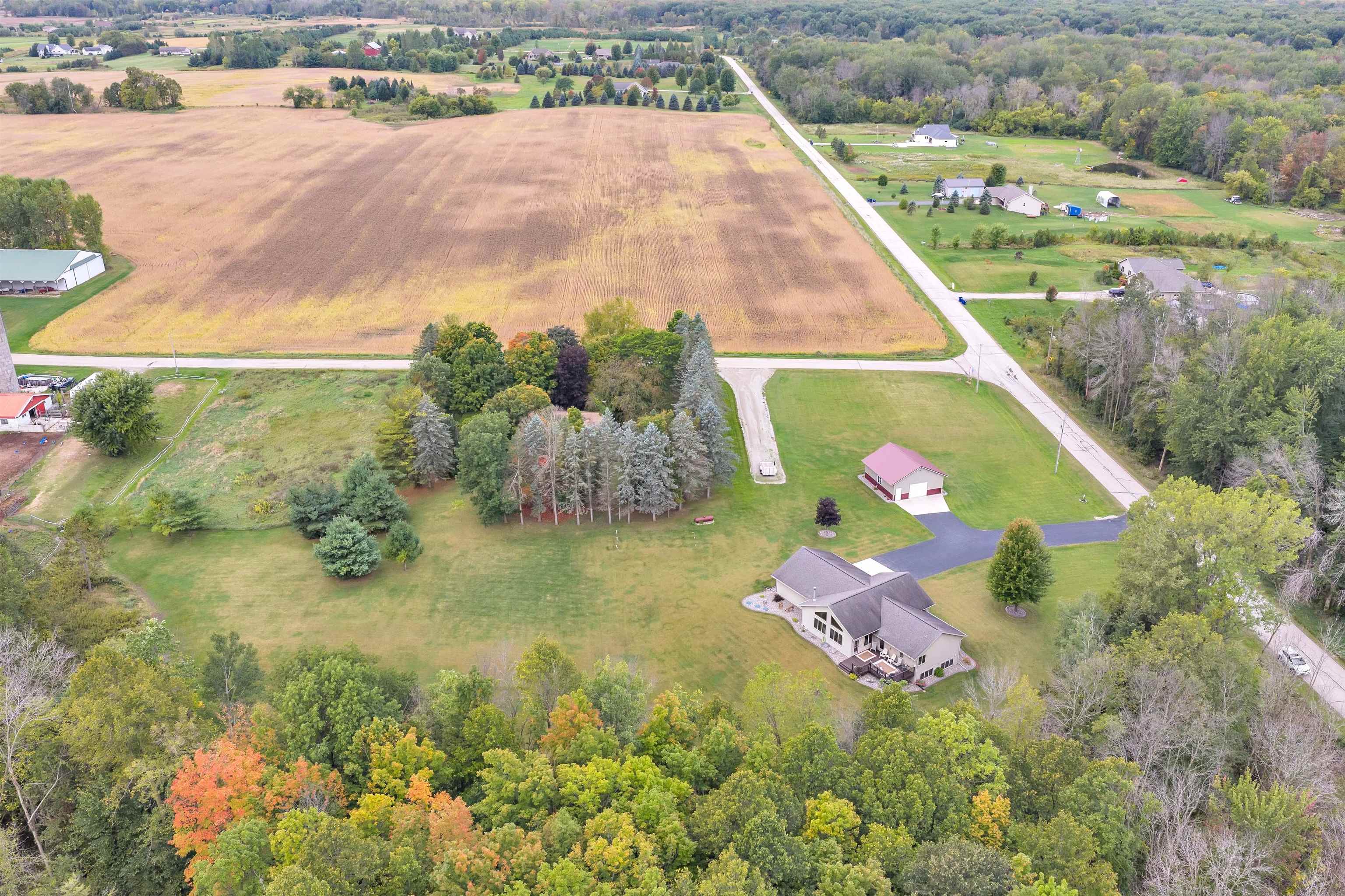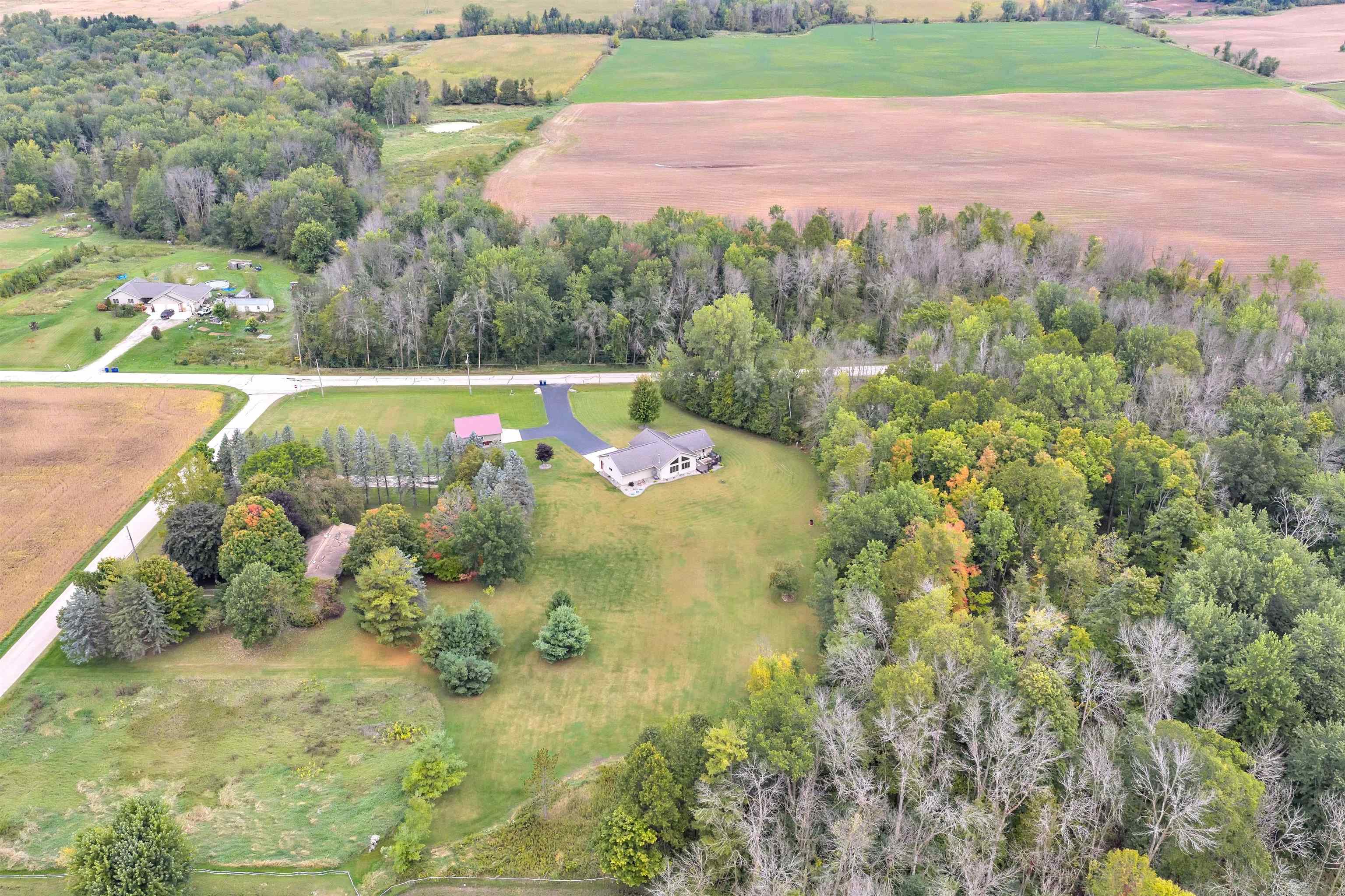 Exceptionally well maintained custom home on beautiful acreage. Property is conveniently located between Appleton, Green Bay, Shawano, and Pulaski. Home features a great open concept floorplan with stunning views of the property throughout. Main floor features a great flex space off the garage, currently being used as an office, 2 bedrooms and 2 full baths. Spacious living, dining, and kitchen area - great for entertaining. Kitchen has gorgeous hickory cabinets. Wood burning fireplace in living room. Lower level rec room features large windows, half bath, and abundant storage. Detached garage ready for your next project! Garage is heated and insulated. Garage has an outlet for welding. Path in woods great for walking! Move-in ready home!
