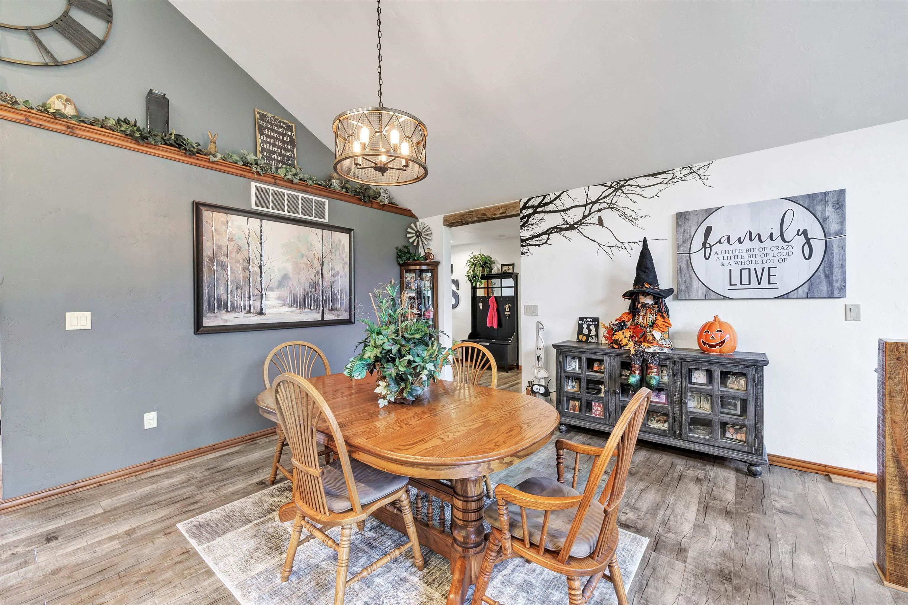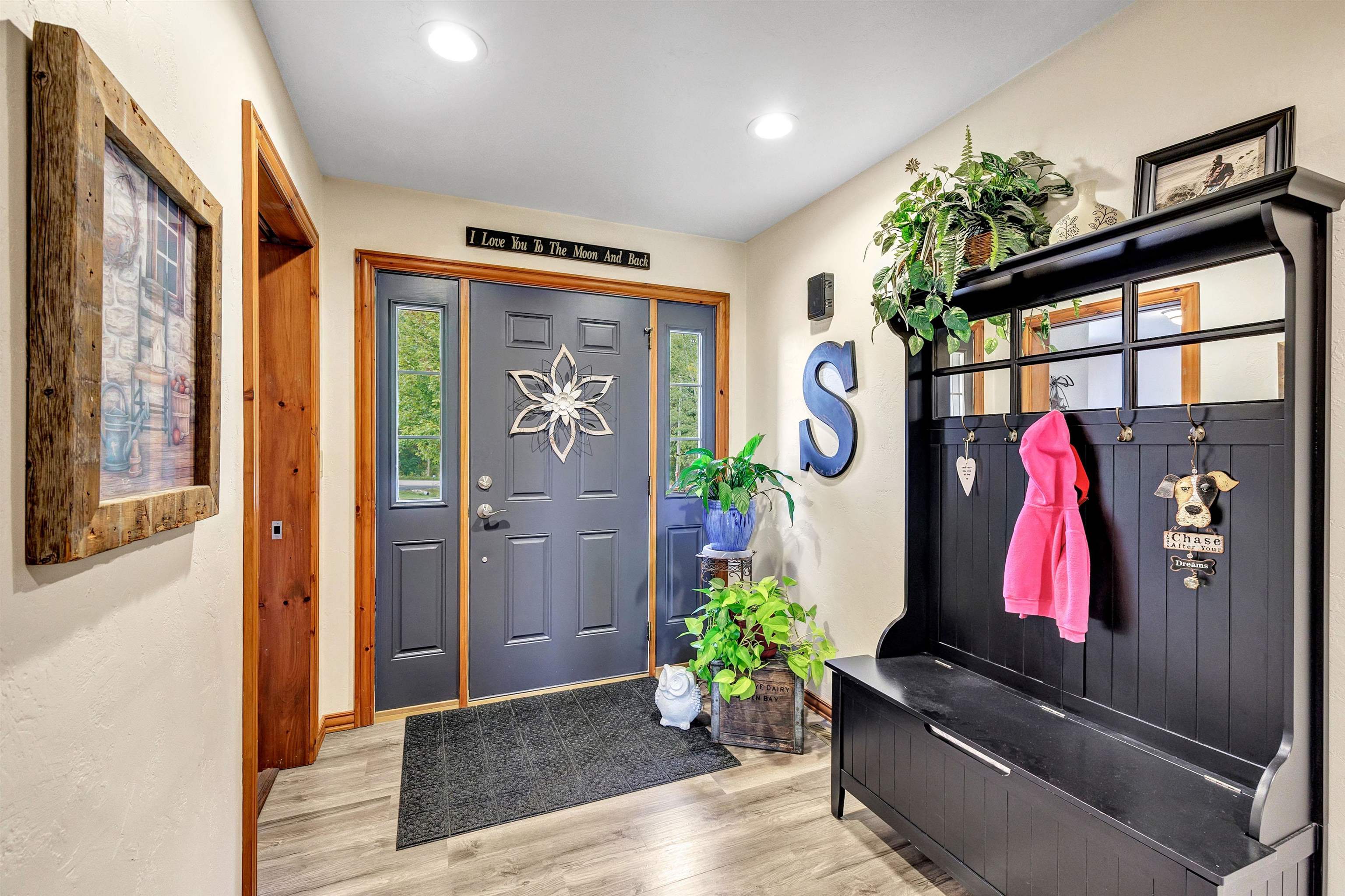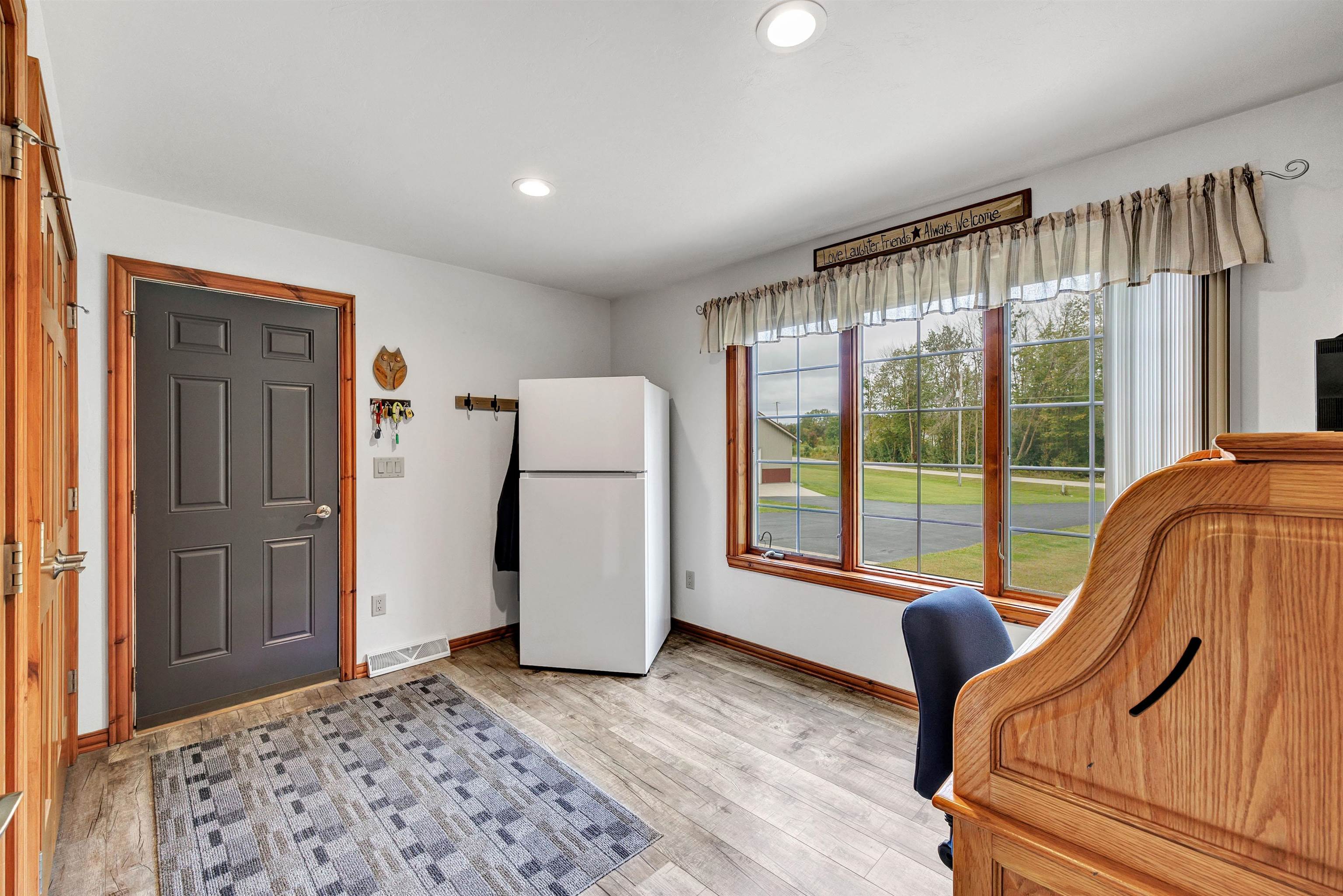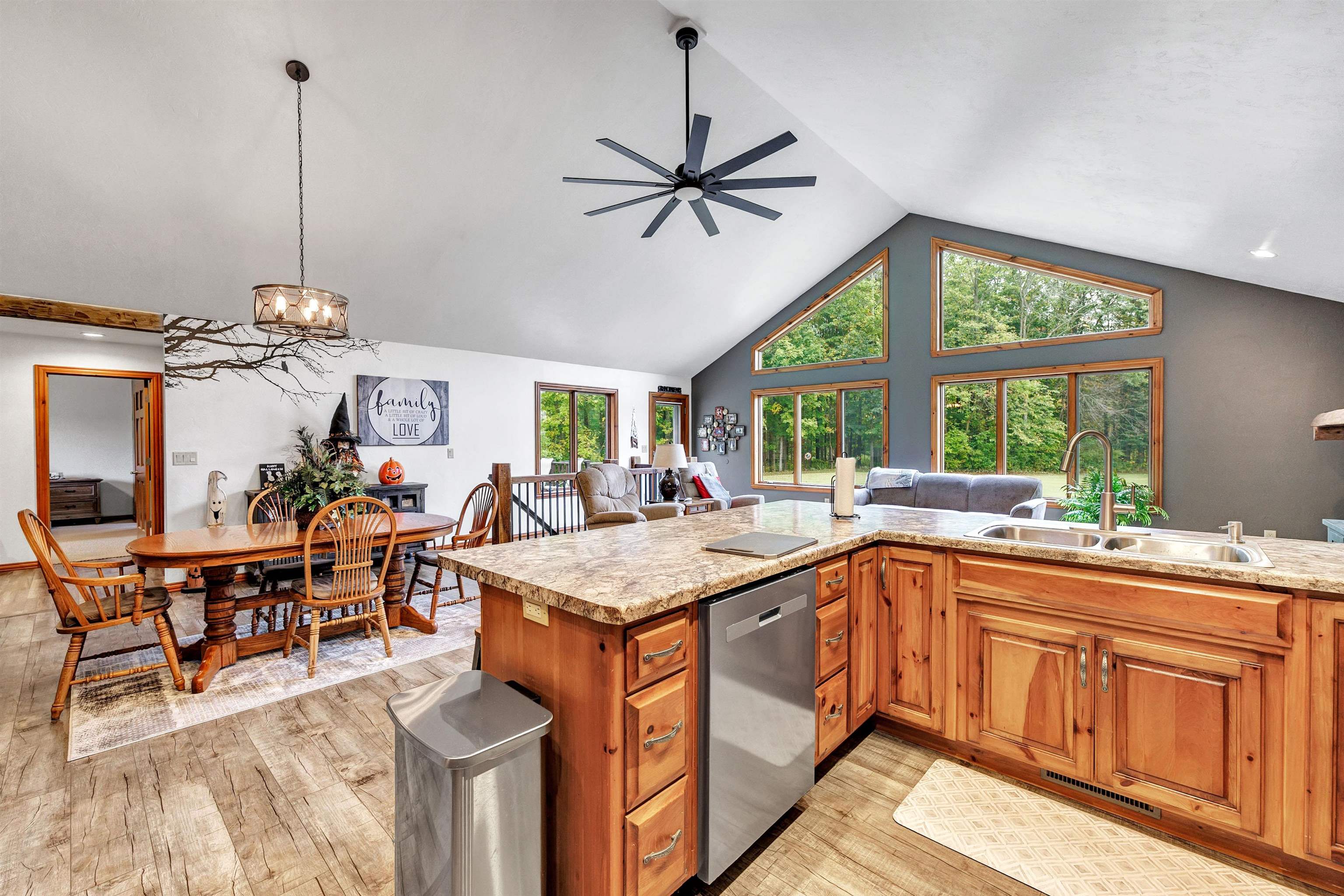 Exceptionally well maintained custom home on beautiful acreage. Property is conveniently located between Appleton, Green Bay, Shawano, and Pulaski. Home features a great open concept floorplan with stunning views of the property throughout. Main floor features a great flex space off the garage, currently being used as an office, 2 bedrooms and 2 full baths. Spacious living, dining, and kitchen area - great for entertaining. Kitchen has gorgeous hickory cabinets. Wood burning fireplace in living room. Lower level rec room features large windows, half bath, and abundant storage. Detached garage ready for your next project! Garage is heated and insulated. Garage has an outlet for welding. Path in woods great for walking! Move-in ready home!