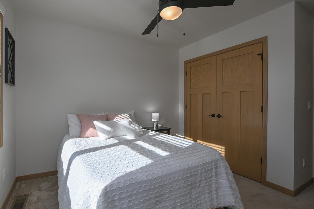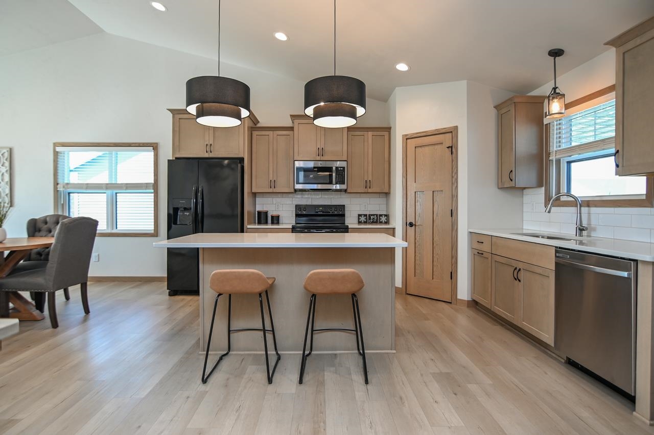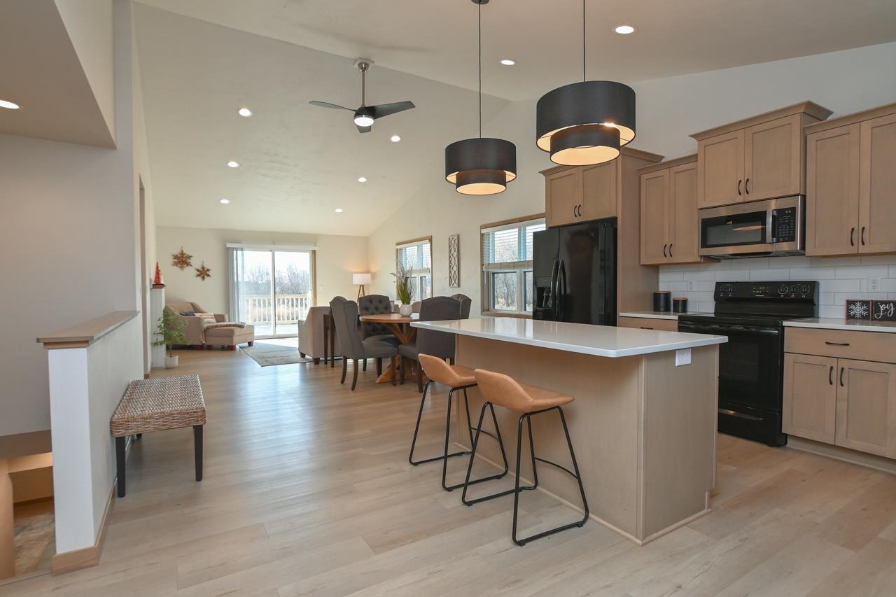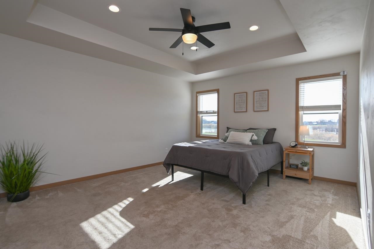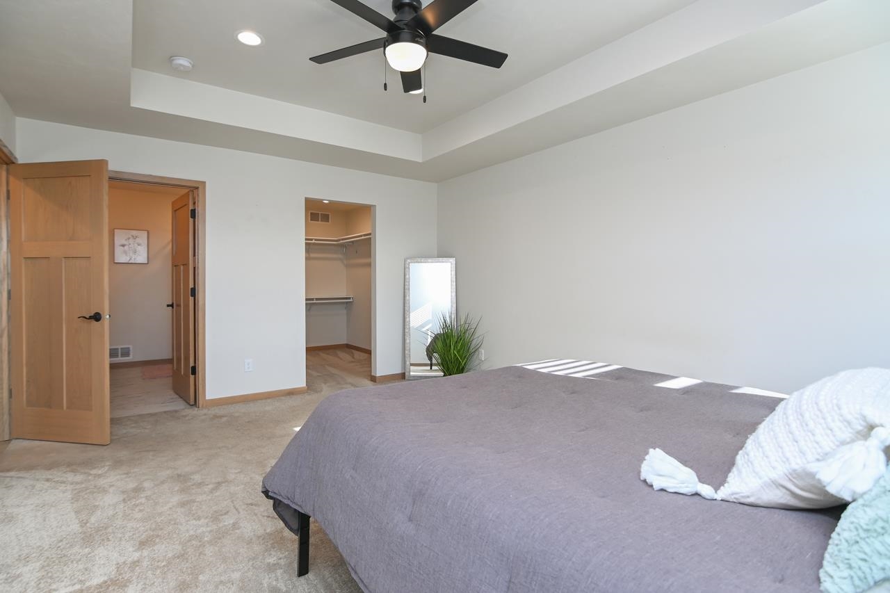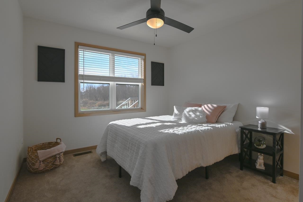 Stunning zero entry ranch home w/ zero lot line situated on a generous sized lot, backing up to a pond & walking trails. Open concept layout w/ cathedral ceilings & cozy built-in fireplace. Gourmet kitchen w/center island, granite countertops, walk-in pantry & appliance pkg. Primary bedroom suite w/tray ceiling, WIC & private full bath. Add'l bedroom plus 2nd full bath is down the hall. Drop all area & FF laundry complete main floor. Full LL w/daylight windows make the spacious rec room & 3rd bedroom light, bright & airy. Unfinished area for storage, stubbed for 3rd bath. 2 car attached garage w/ openers. Relax on the deck as you enjoy a little peace & quiet w/ no neighbors behind you. Edge of town location w/ hwy access for easy commute. Schedule your showing today! 48 hr BA requested.