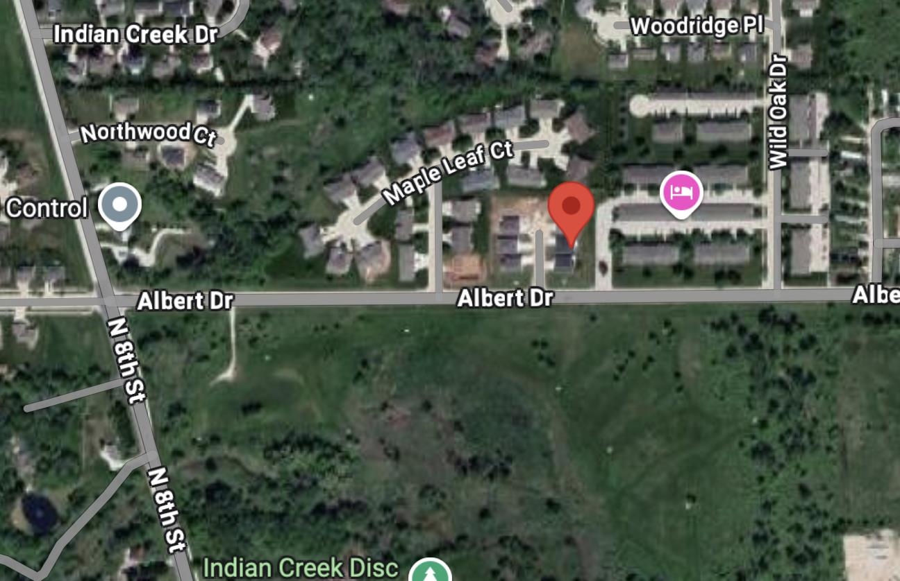 N 8th St to East on Albert Dr to Creekwood Ct. Creekwood is third street on the left, heading East off the intersection of Albert and 8th.