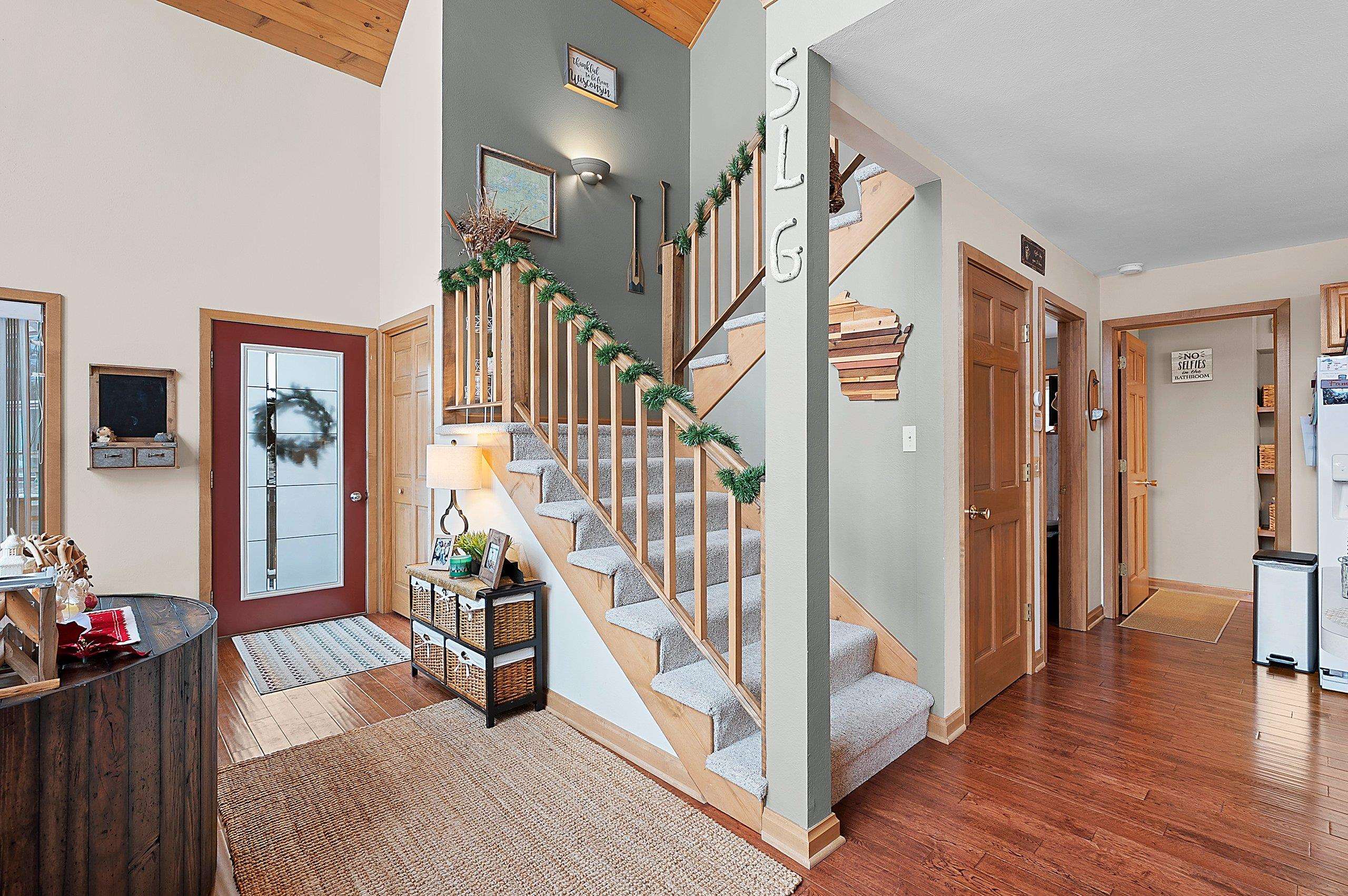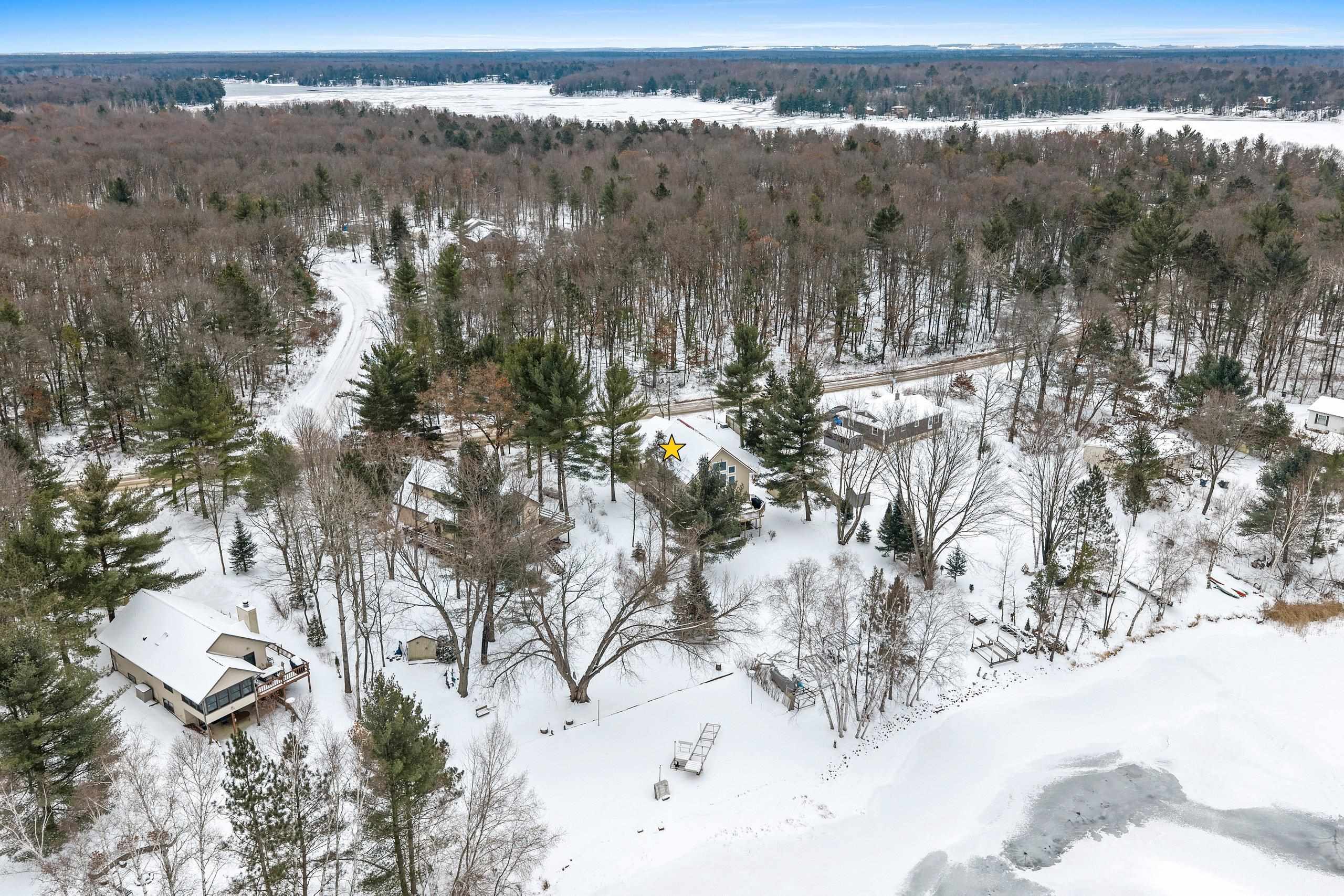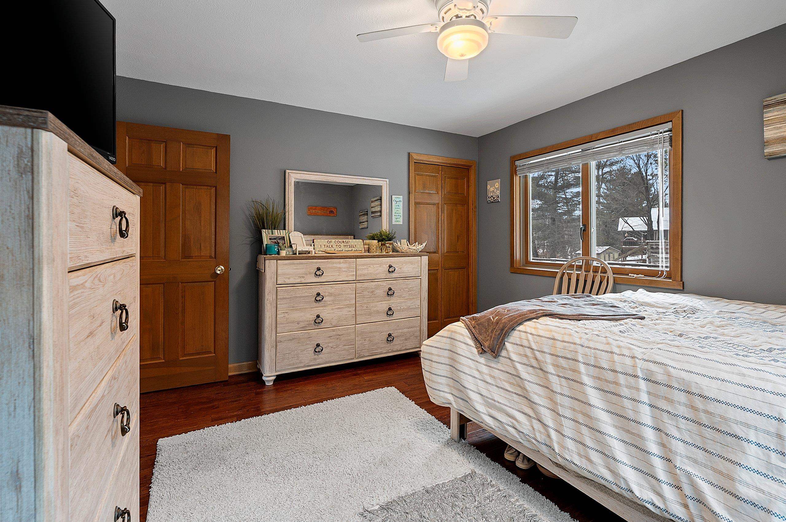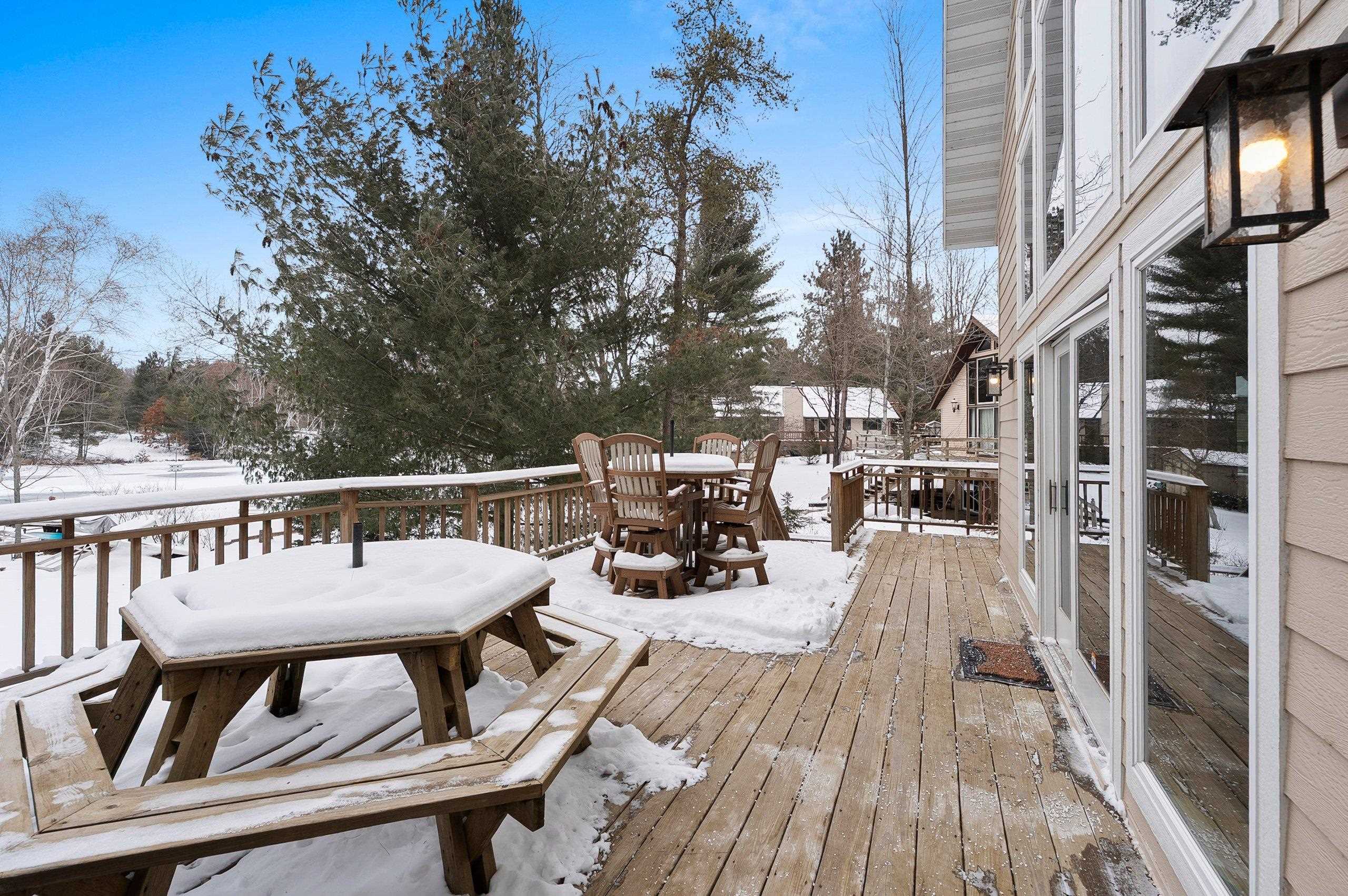 Enjoy this inviting 4-bedroom, 2.5-bath waterfront home just steps from the sandy beach. The open-concept living area features cathedral ceiling, a cozy fireplace, and hickory kitchen cabinetry. Relax or entertain on the wraparound deck while taking in stunning westerly sunsets. The walk-out lower-level family room provides flexible living space, with convenient laundry located in the lower-level bath. A drilled well installed in 2017 offers added peace of mind. A 34'×30' heated and finished garage with walk-up storage, built in 2020, provides ample room for vehicles, storage, or hobbies. A perfect waterfront getaway!