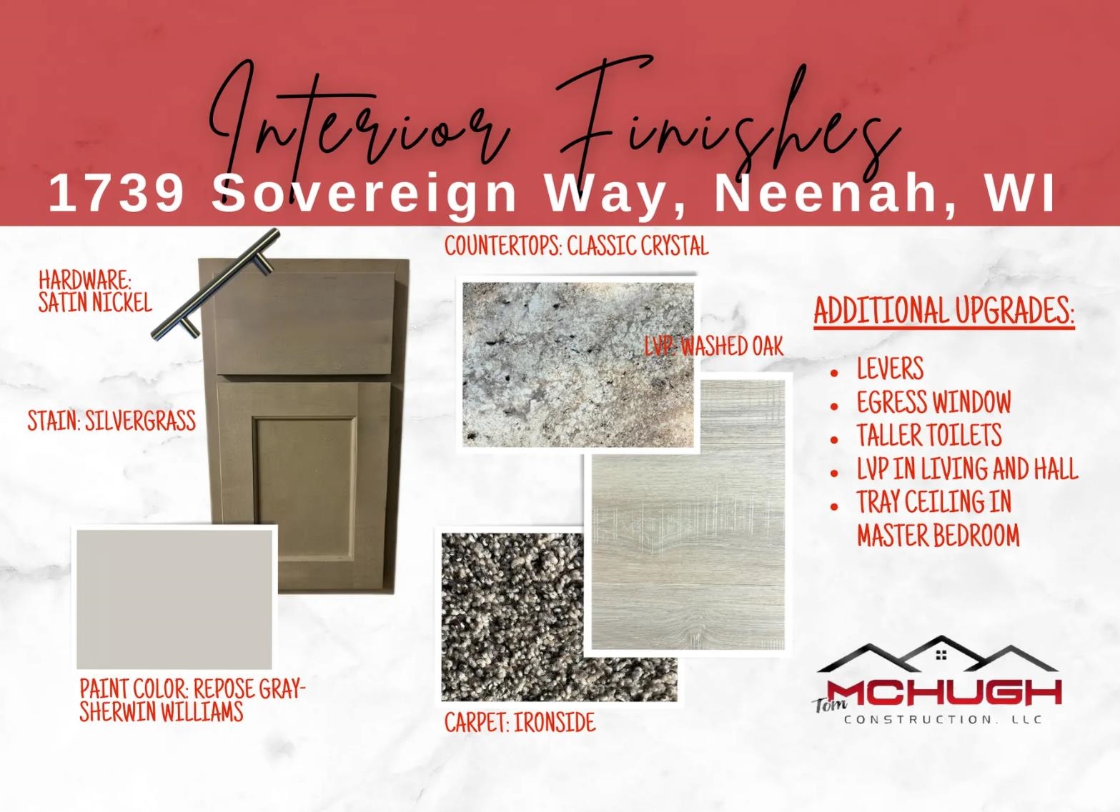 Welcome home from Tom McHugh Construction! This home is under construction!!! The 1343-CE floor plan from our CE collection, a 3 bedroom (split), 2 full bath ranch design. Standard features include LVP throughout the main living areas, insulated garage doors, fiberglass exterior doors, 2 panel interior doors, 1 egress window, central AC, basement stubbed for a future bath. Photo is computer generated. Open Houses will be held at the Model at 1501 Liberty Ave, Neenah on Saturdays from 11-12 Freedom Meadows subdivision includes sidewalks.