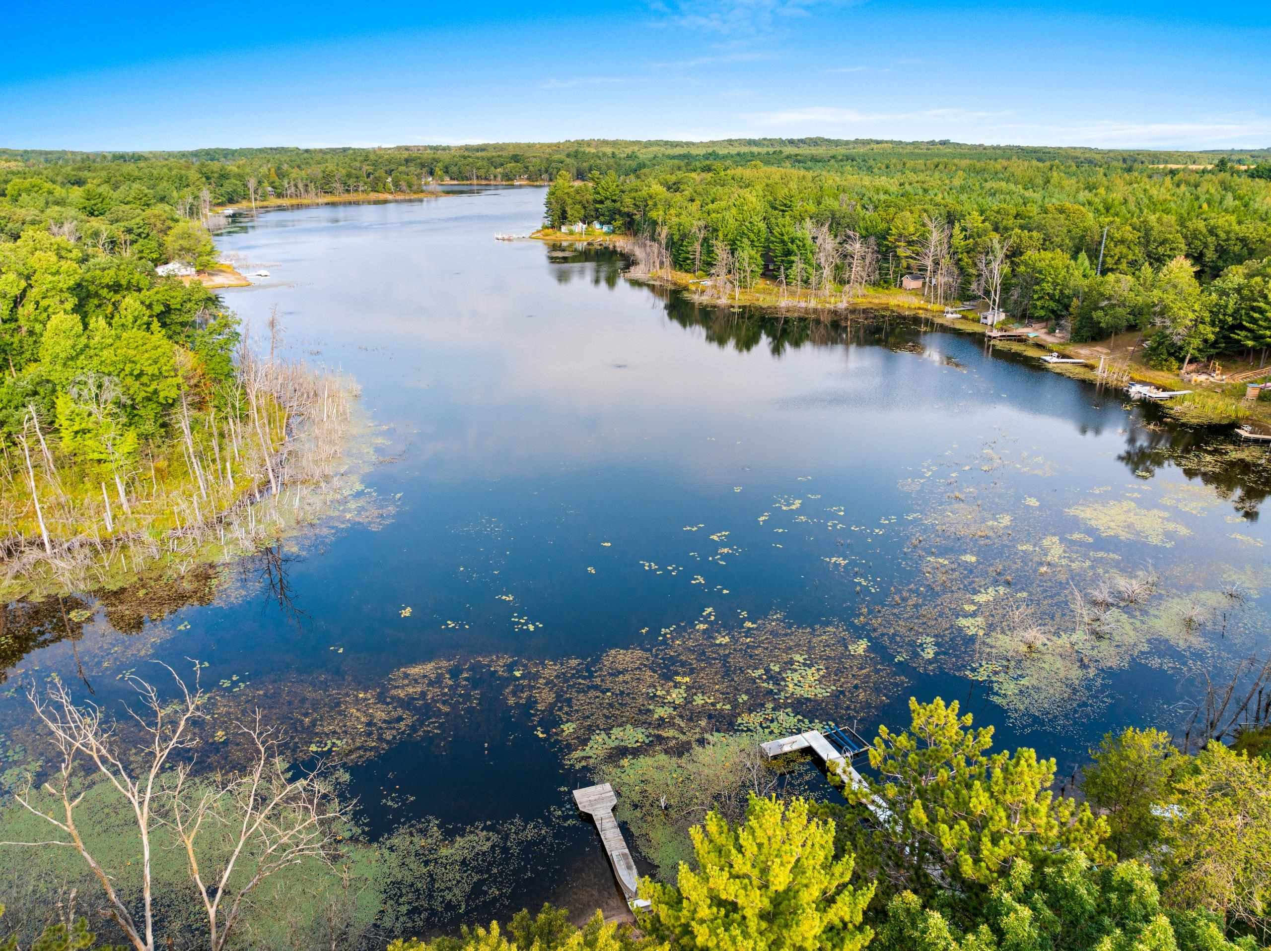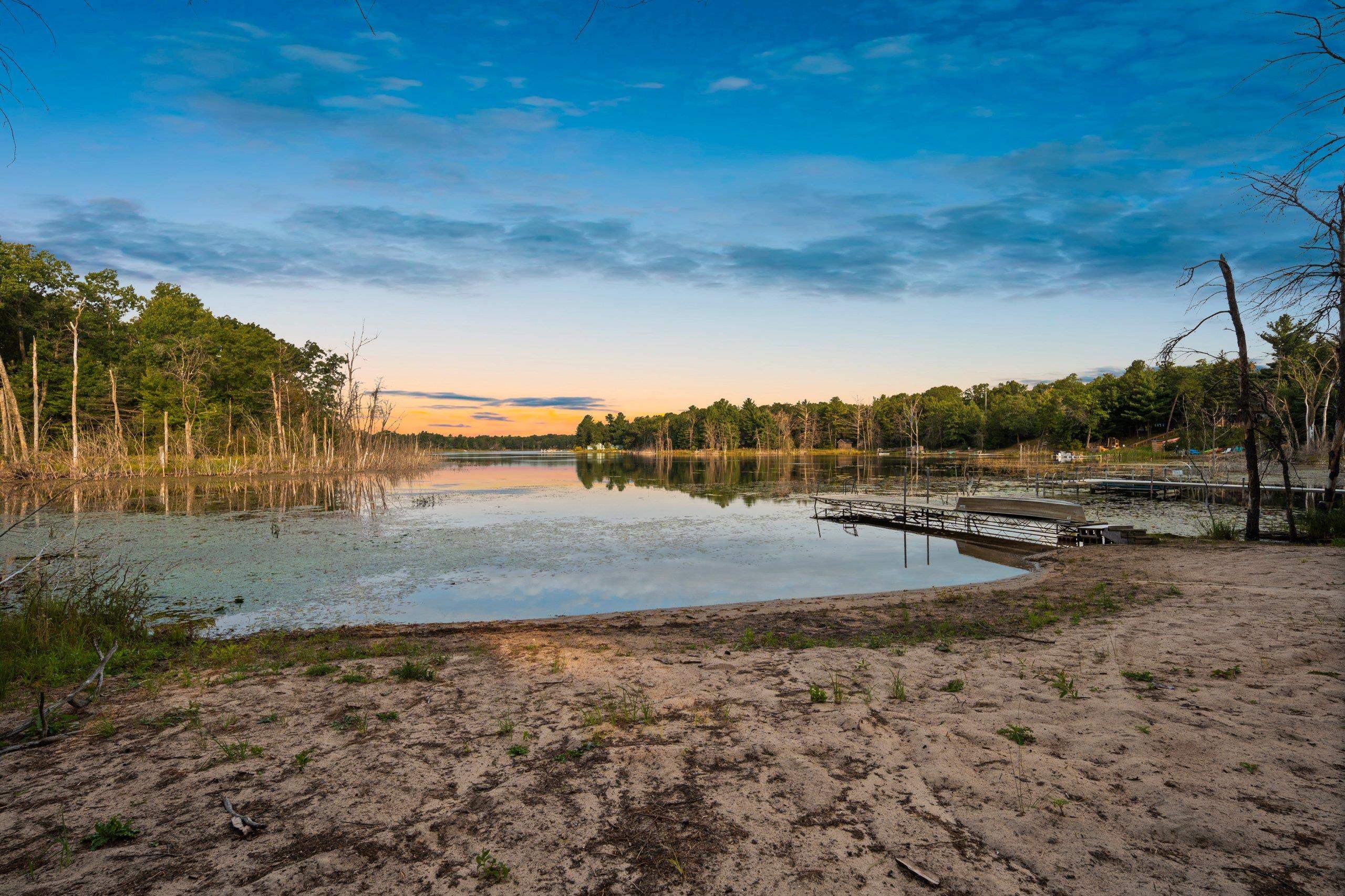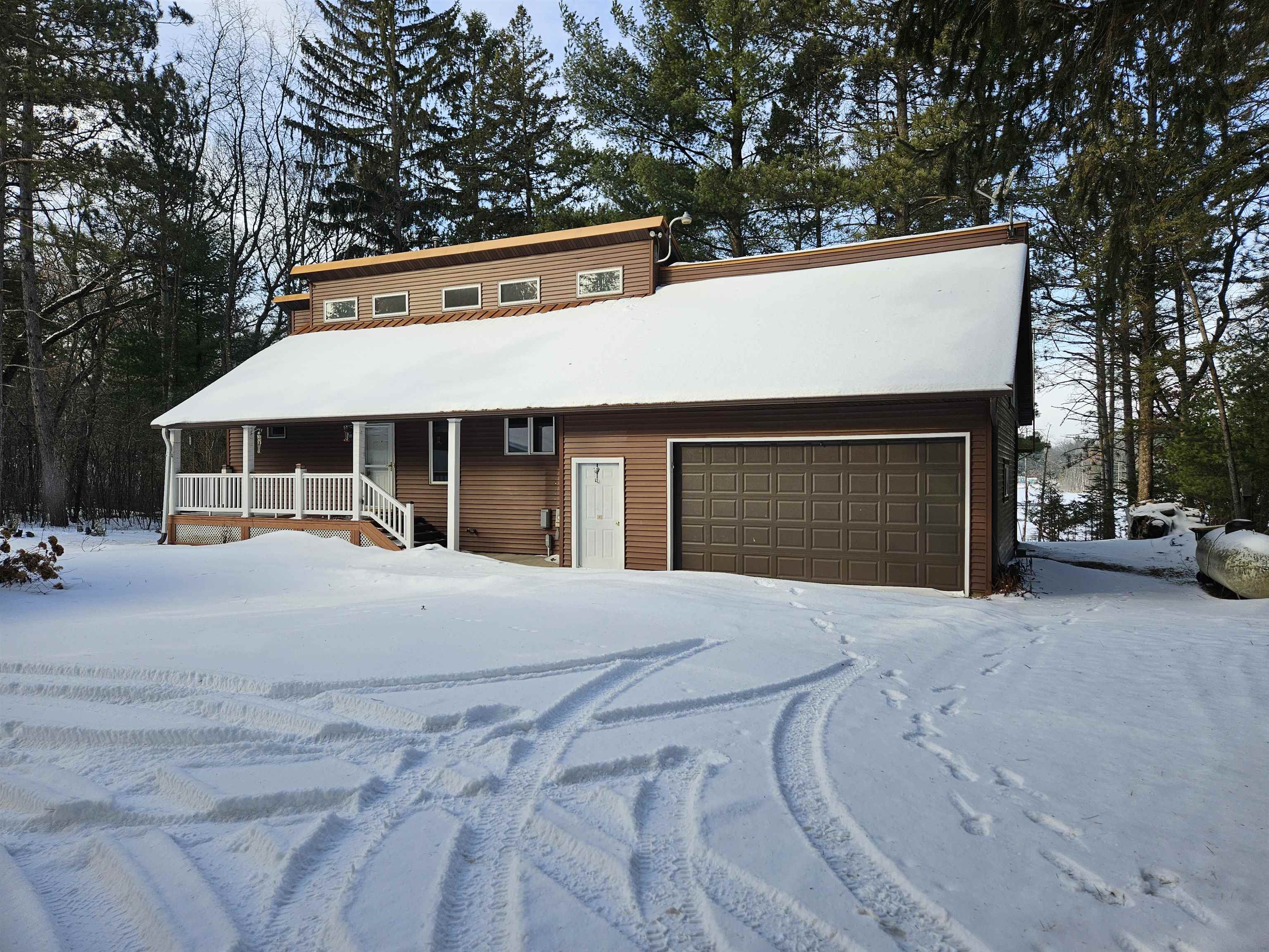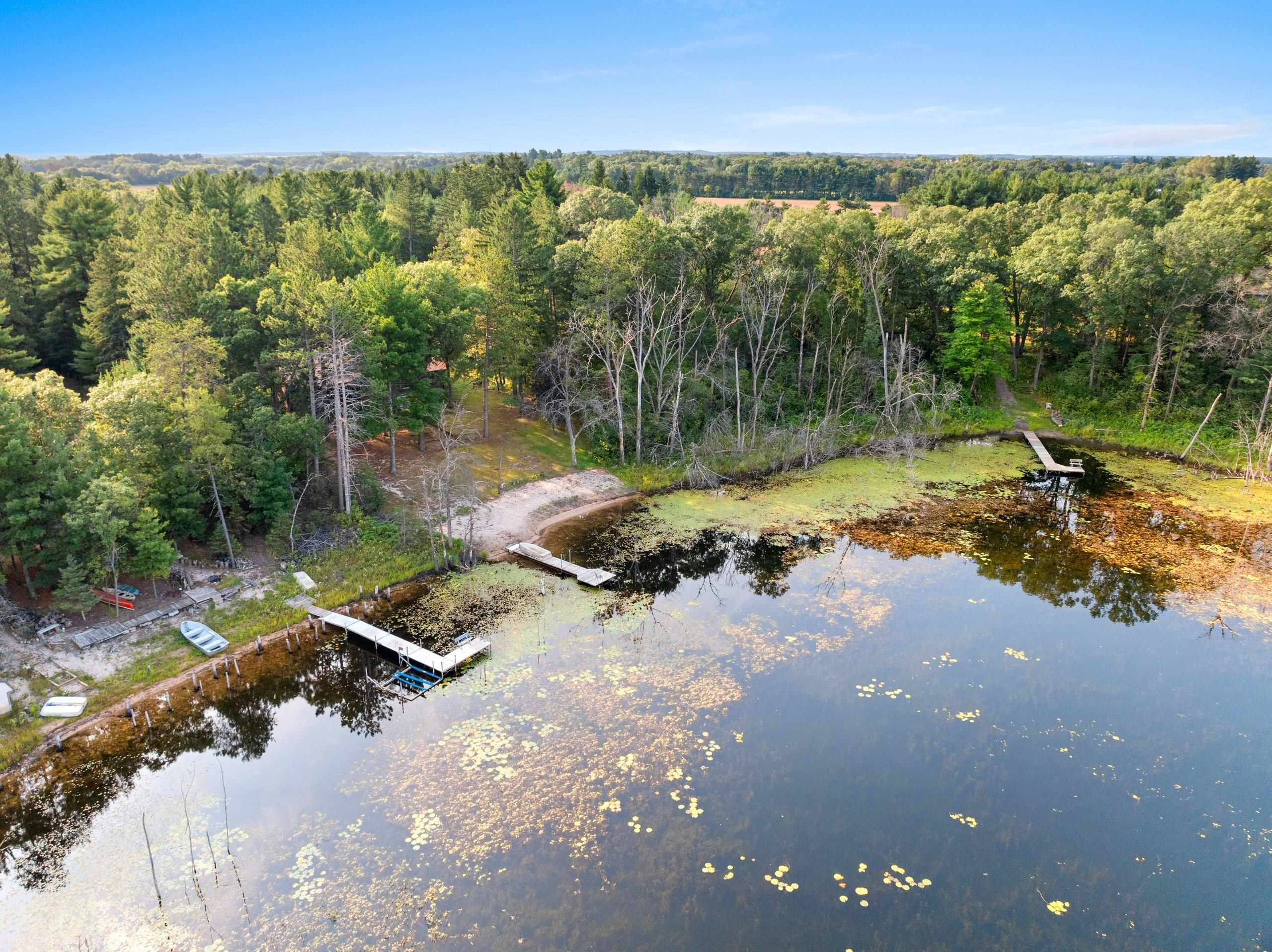Head into spring with year-round lake living on 5.8 private acres with approximately 236 feet of Long Lake frontage, including a sandy beach area. Enjoy mornings on the covered porch, afternoons on the patio, and sunsets over the water. The upper-level loft serves as a bunkhouse or bedroom, while the walkout lower level offers a bedroom or office with walk-in closet, full bath, and rec room for guests. The kitchen features hickory cabinetry and opens to dining and living areas with lake views. Secondary access off Aniwa Lane offers future building flexibility. Includes attached garage with 220-volt outlet, 26x26 shed/garage, and 50-amp RV hookup. Some images virtually staged.