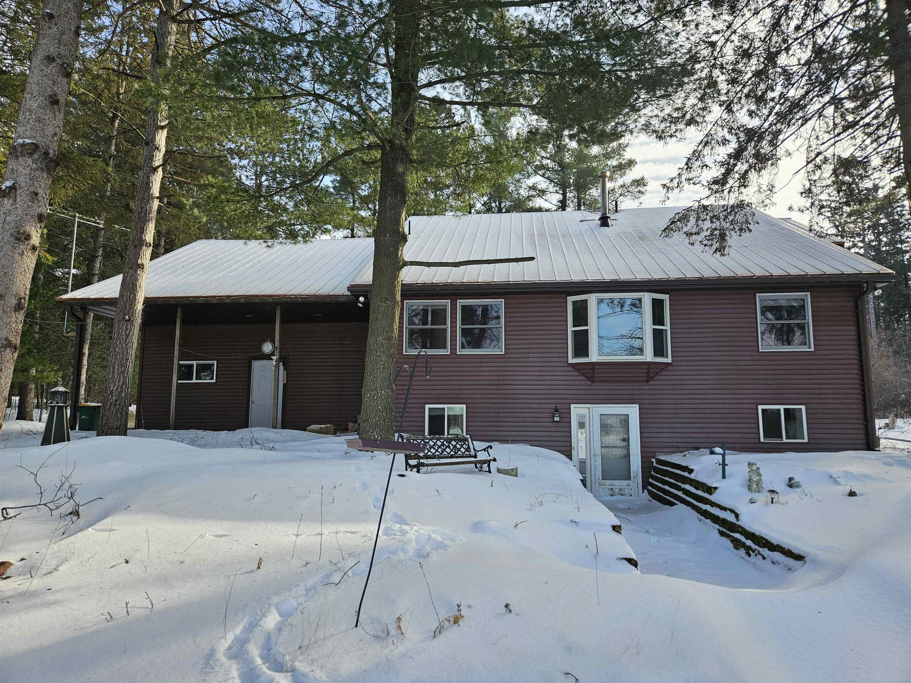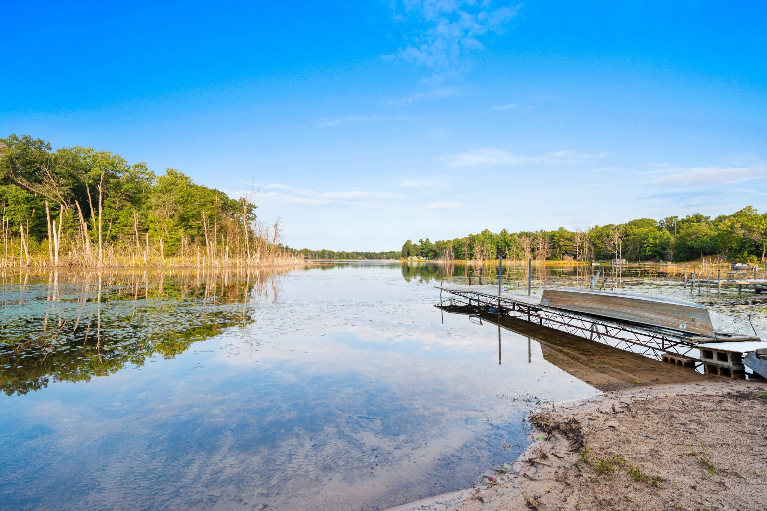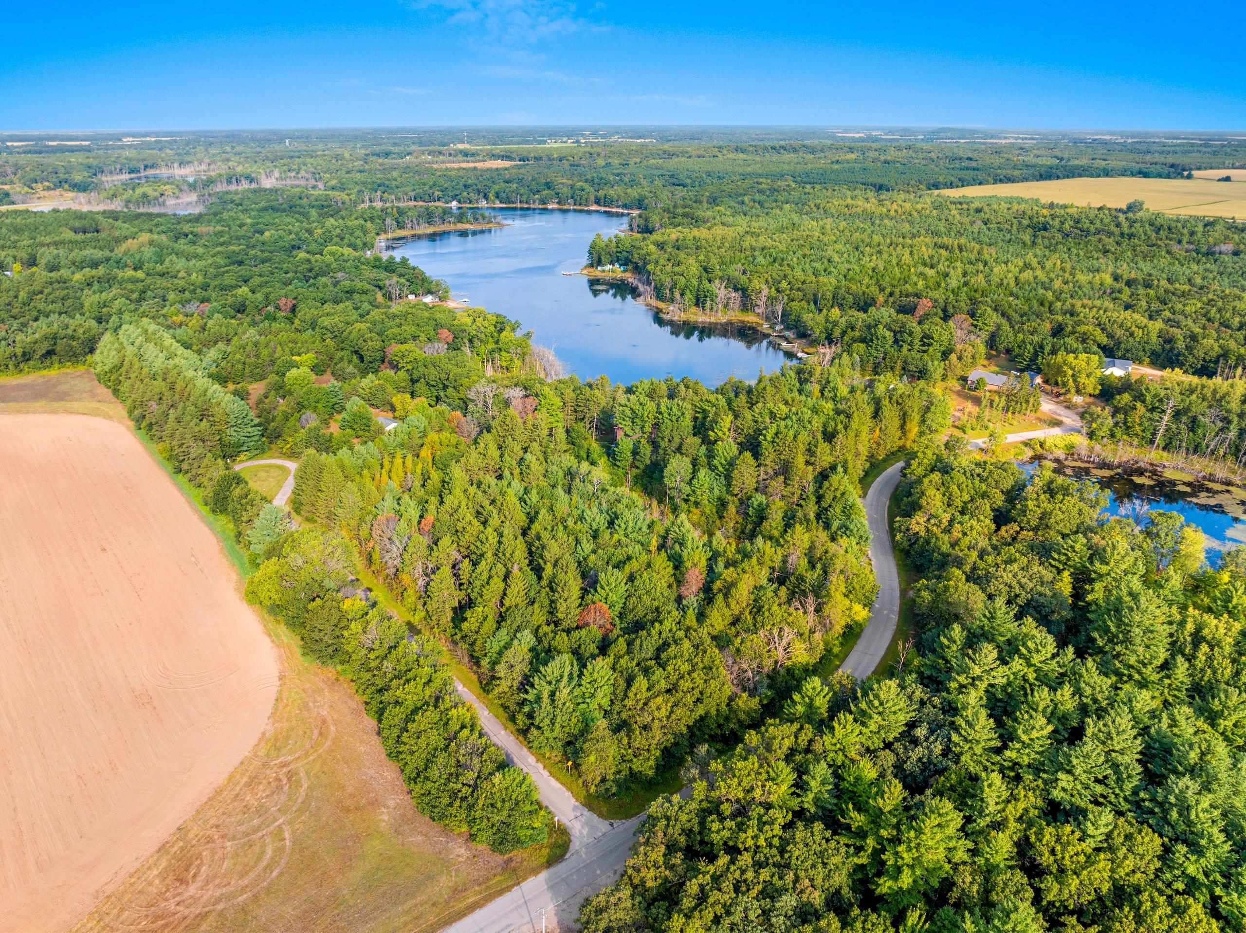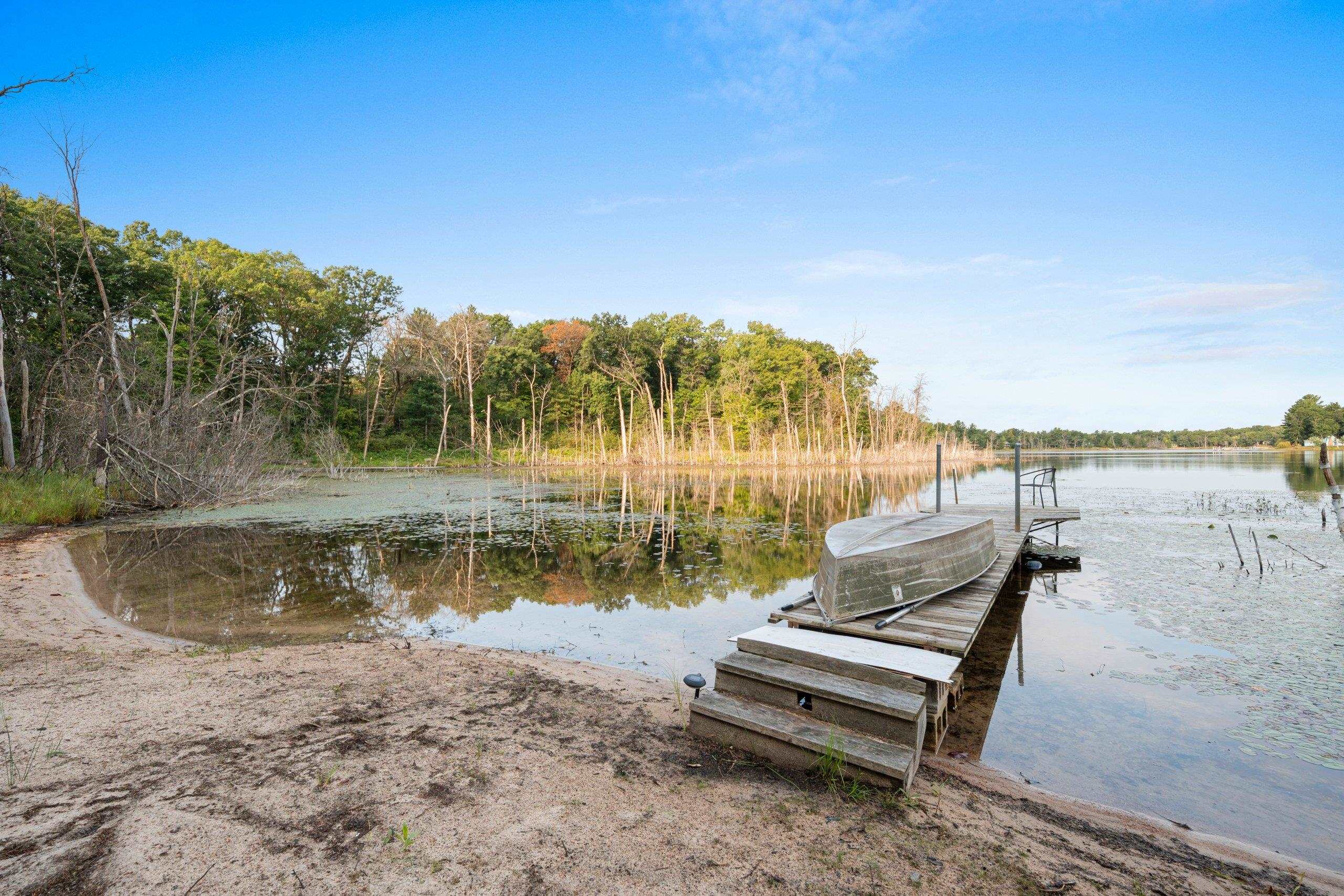 Head into spring with year-round lake living on 5.8 private acres with approximately 236 feet of Long Lake frontage, including a sandy beach area. Enjoy mornings on the covered porch, afternoons on the patio, and sunsets over the water. The upper-level loft serves as a bunkhouse or bedroom, while the walkout lower level offers a bedroom or office with walk-in closet, full bath, and rec room for guests. The kitchen features hickory cabinetry and opens to dining and living areas with lake views. Secondary access off Aniwa Lane offers future building flexibility. Includes attached garage with 220-volt outlet, 26x26 shed/garage, and 50-amp RV hookup. Some images virtually staged.