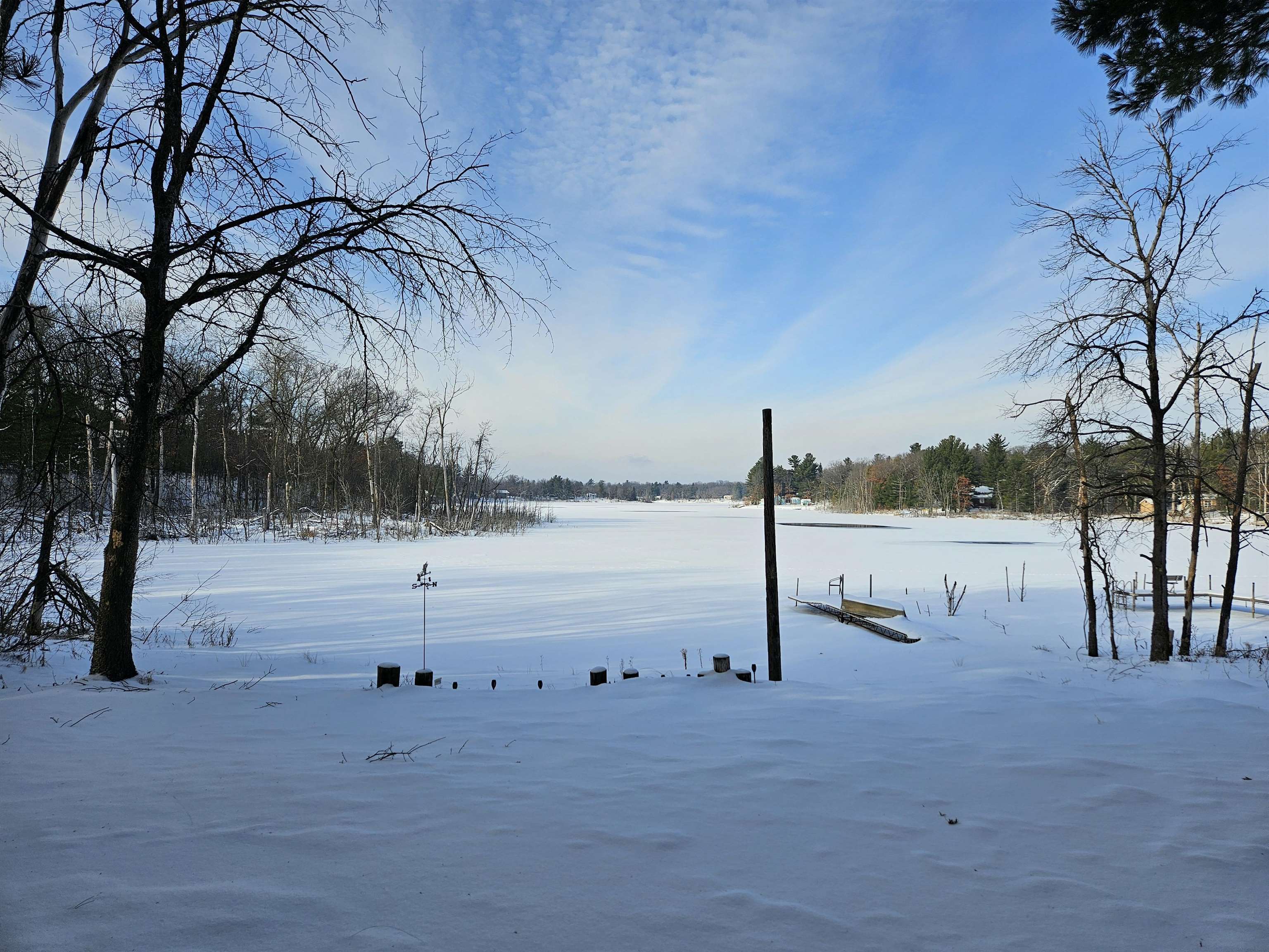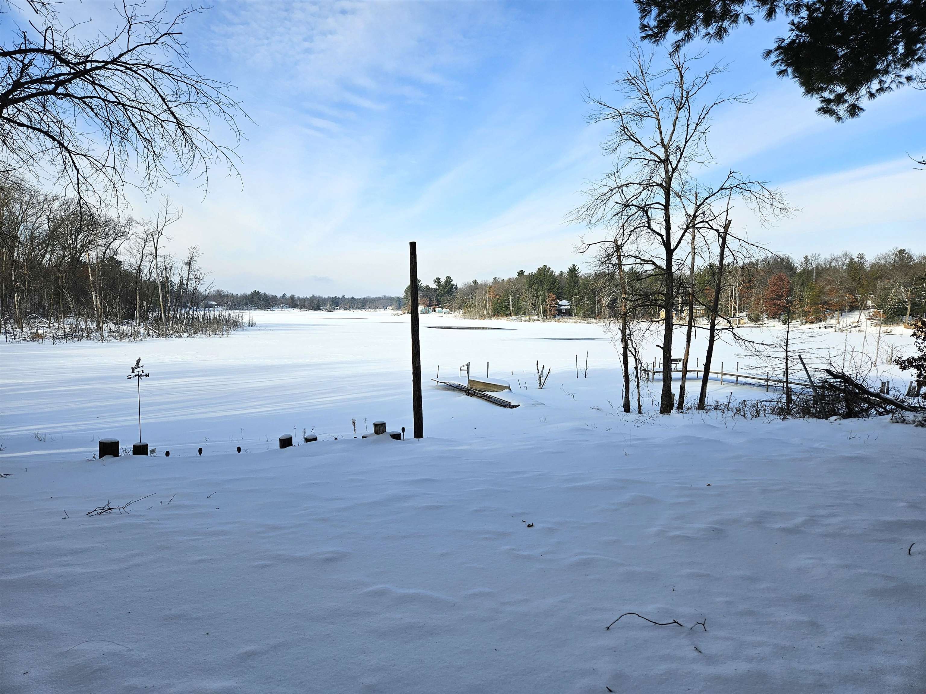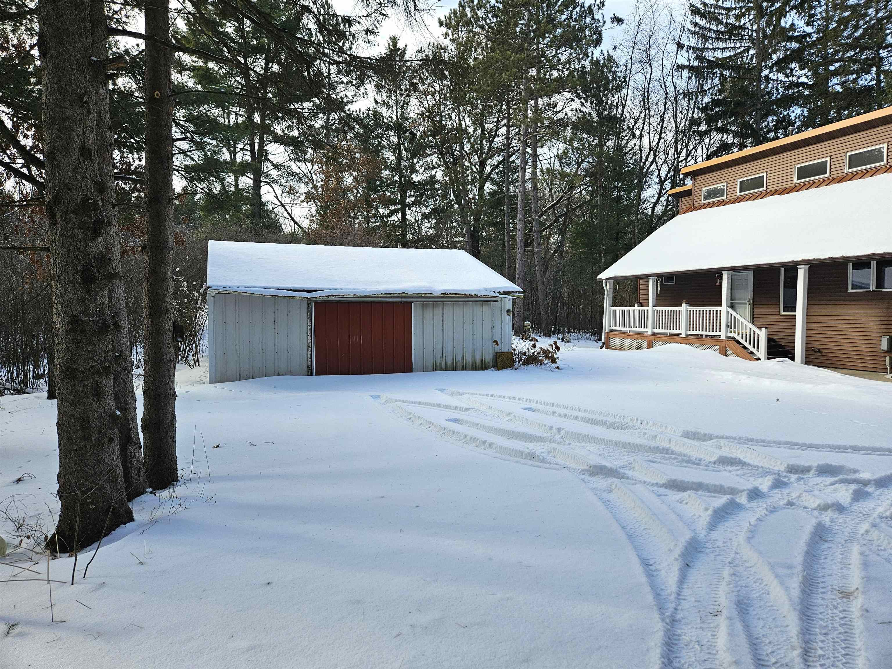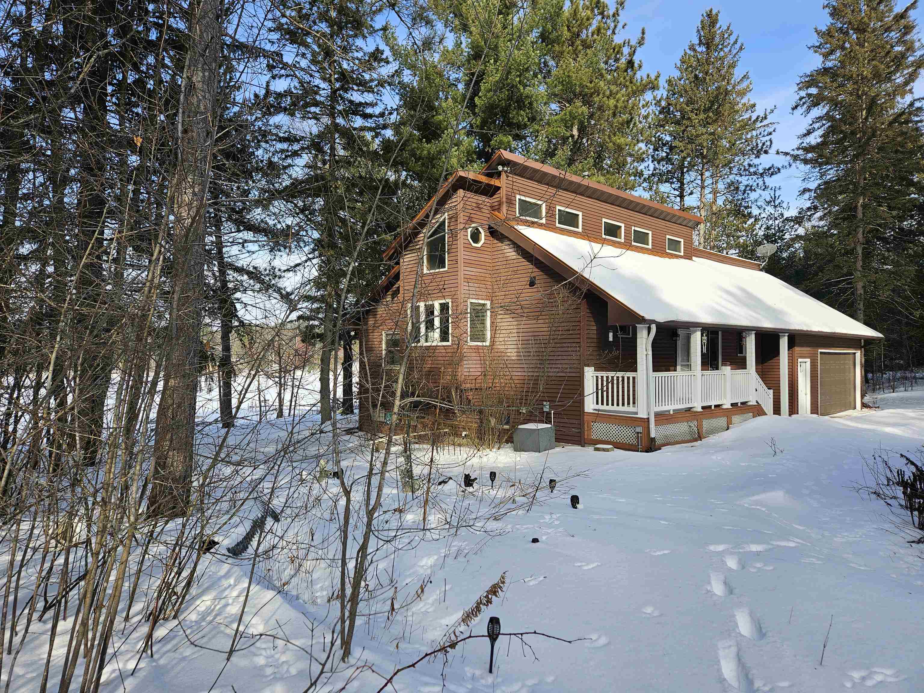 Head into spring with year-round lake living on 5.8 private acres with approximately 236 feet of Long Lake frontage, including a sandy beach area. Enjoy mornings on the covered porch, afternoons on the patio, and sunsets over the water. The upper-level loft serves as a bunkhouse or bedroom, while the walkout lower level offers a bedroom or office with walk-in closet, full bath, and rec room for guests. The kitchen features hickory cabinetry and opens to dining and living areas with lake views. Secondary access off Aniwa Lane offers future building flexibility. Includes attached garage with 220-volt outlet, 26x26 shed/garage, and 50-amp RV hookup. Some images virtually staged.
