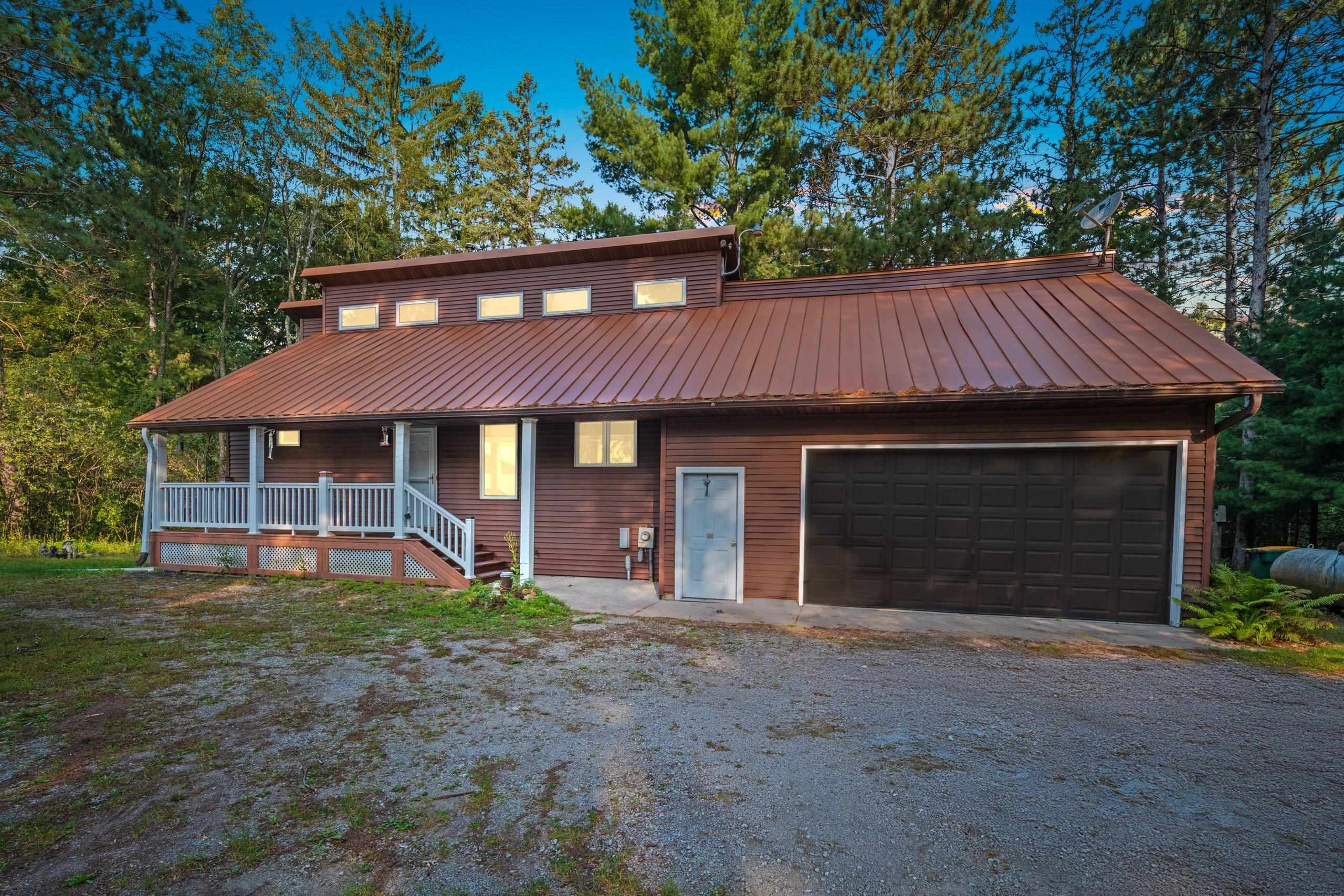 Experience year-round lake living on 5.8 private acres with approximately 236 feet of Long Lake frontage, including a sandy beach area. Spend mornings on the covered porch, afternoons on the patio, and evenings watching the sunset over the water. The upper-level loft serves as a bunkhouse/bedroom, while the walkout lower level offers a bedroom or office with walk-in closet, full bath, and rec room for guests. The kitchen with hickory cabinetry flows into dining and living areas with lake views. A secondary access off Aniwa Lane provides flexibility for future building plans. Features include an attached garage with 220-volt outlet, 26x26 shed/garage, and 50-amp RV hookup. This lakeside retreat offers year-round enjoyment, privacy, and a peaceful setting. Some virtually staged images.