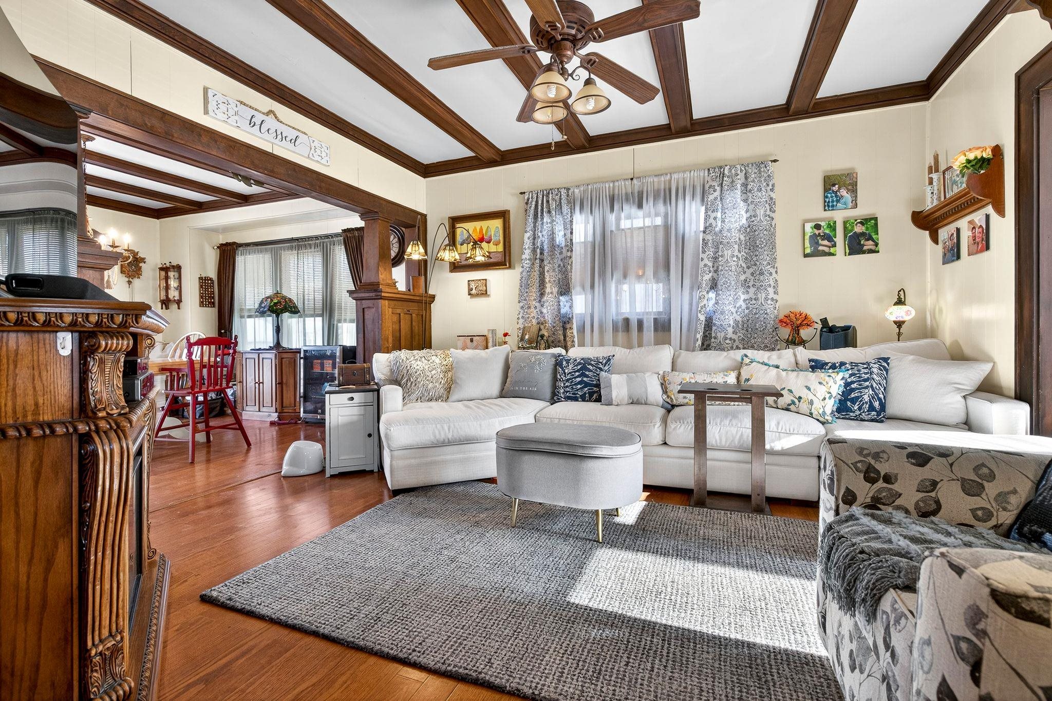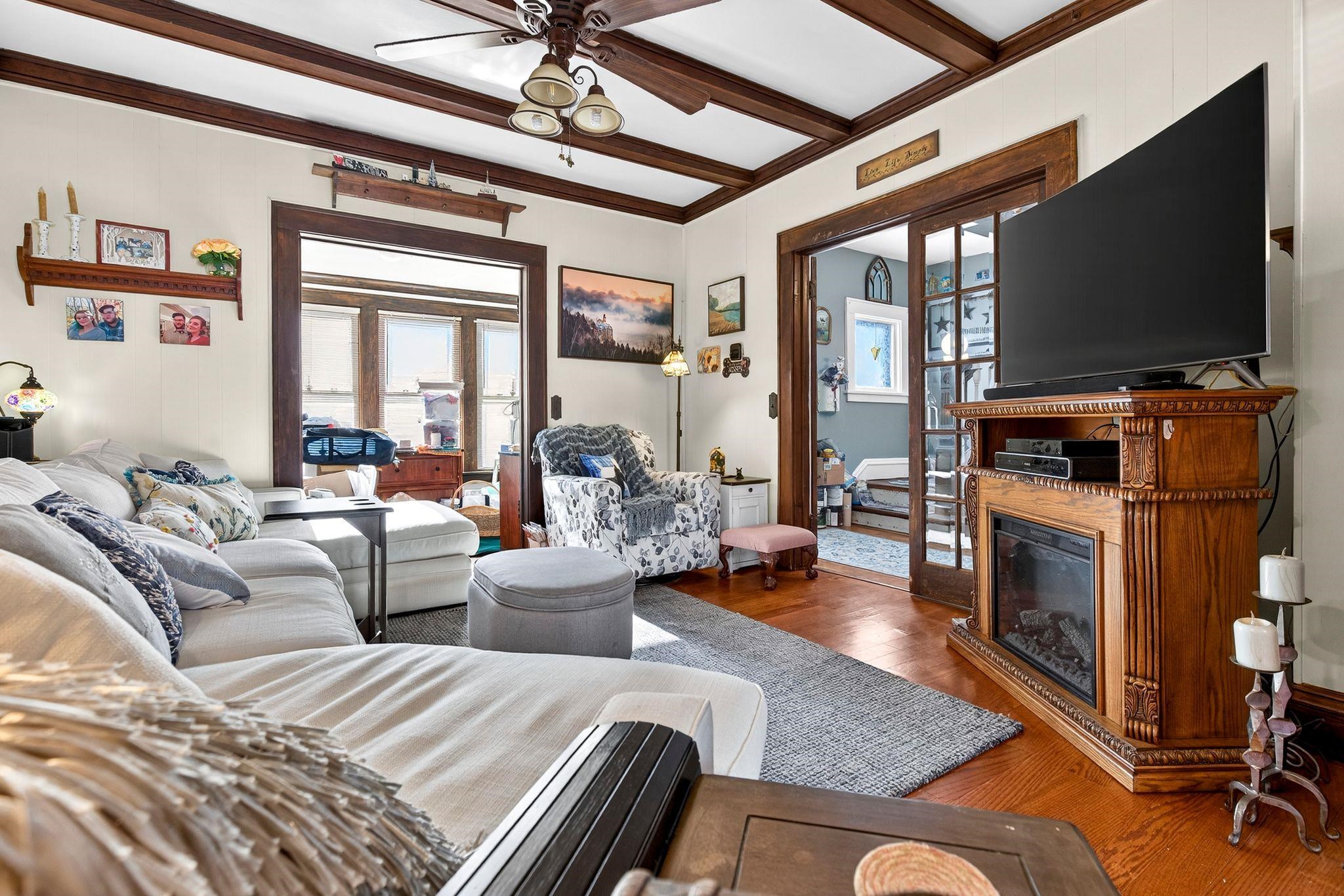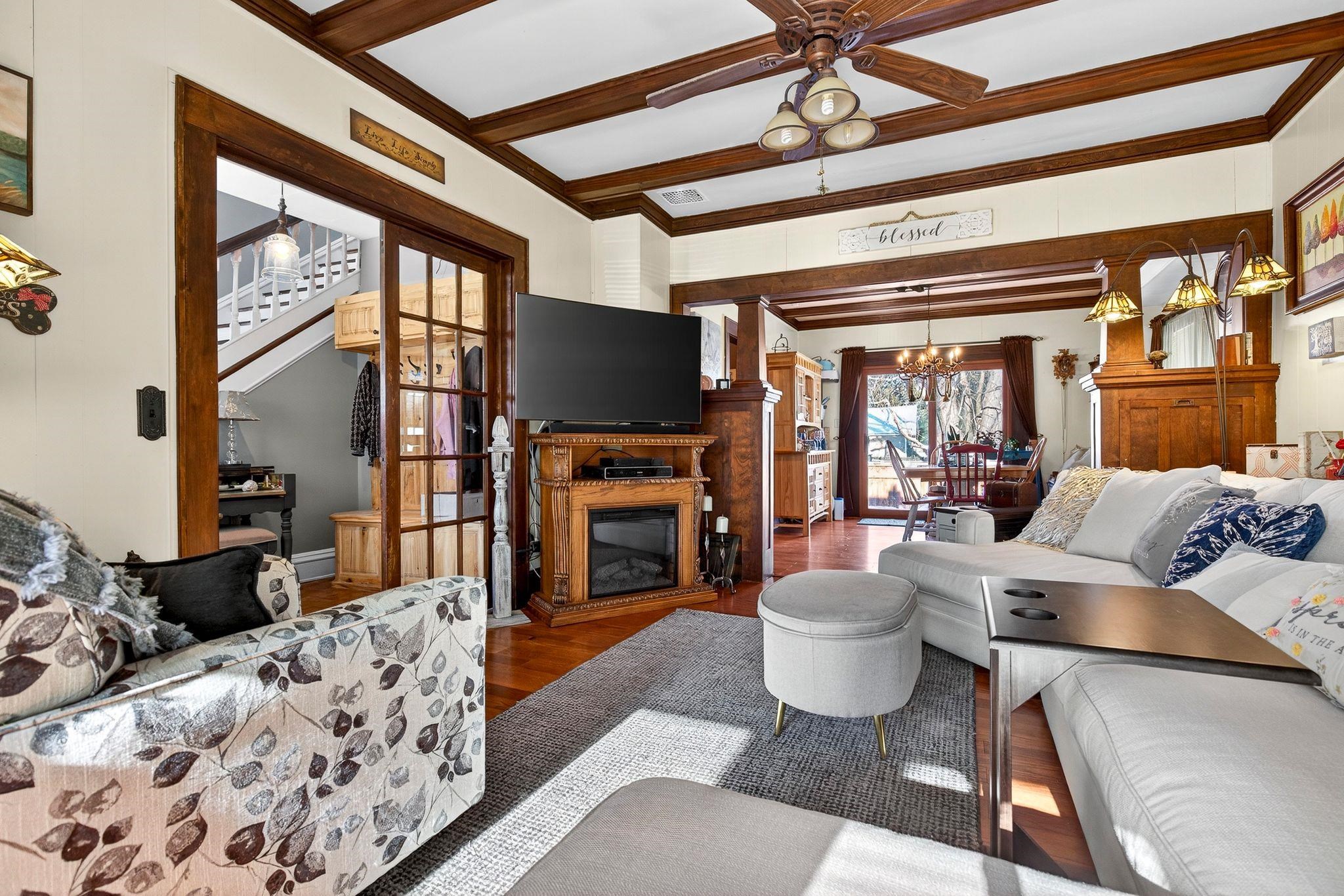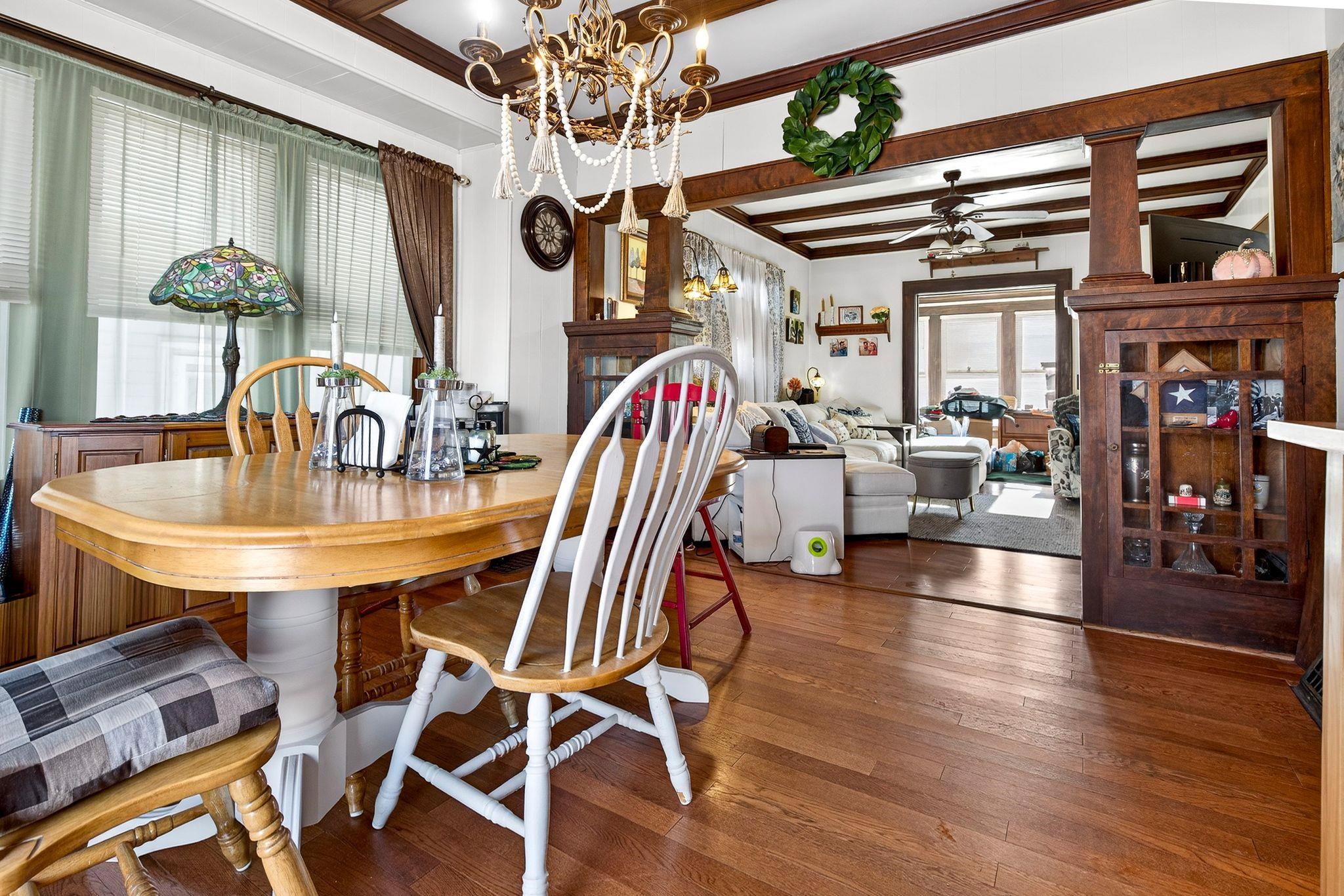 Fall in love with this beautiful 1.5-story home overflowing with charm and updates. The welcoming front porch leads to a home filled with standout features, including a stunning staircase, French doors, and wood ceiling beams in both the living room and formal dining room. The dining also features classic built-ins! Enjoy extra living space year-round in the enclosed porch. The stunning kitchen, remodeled in 2013, gives this home some serious style. The bathroom was updated in 2014, and an electrical upgrade was completed in 2013, offering peace of mind and convenience. A patio door leads to the fenced-in backyard, featuring a cedar fence and a beautiful stone patio. The property is rounded out by a 1.5-car detached garage. Come see it for yourself! Please allow 48 hrs binding acceptance.