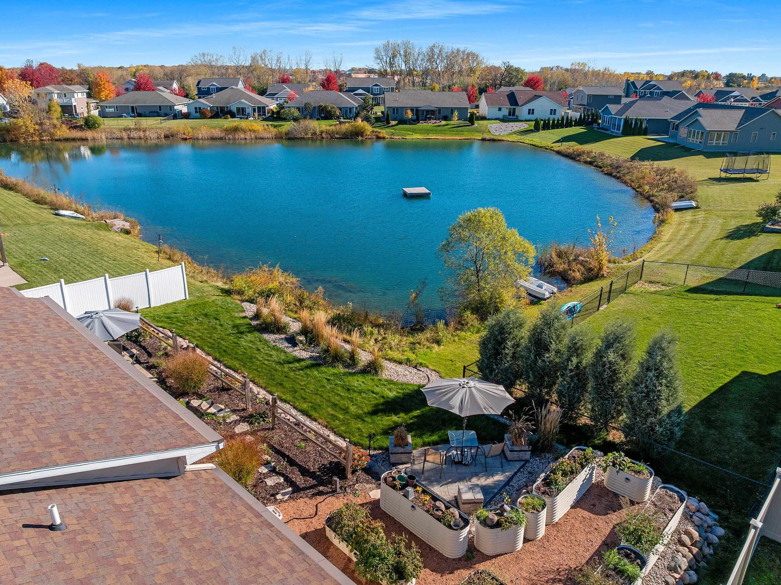Impressive space and stunning pond views await in this custom home. Anchored by a freestanding 2-sided fireplace, the living room wraps effortlessly with vaulted ceilings and built-in cabinetry. A full wall of windows leads into a 4-seasons room overflowing with natural light. A massive island highlights the kitchen, surrounded by hardwood cabinets and sprawling countertops perfect for entertaining. Outside, the private oasis offers multiple patio areas, raised garden beds, and nature’s best scenery. Designed for effortless living, this wheelchair friendly home features 1st-floor laundry, zero-step entry, and countless ADA amenities. With thoughtful upgrades throughout, this home shines with pride and attention to detail.