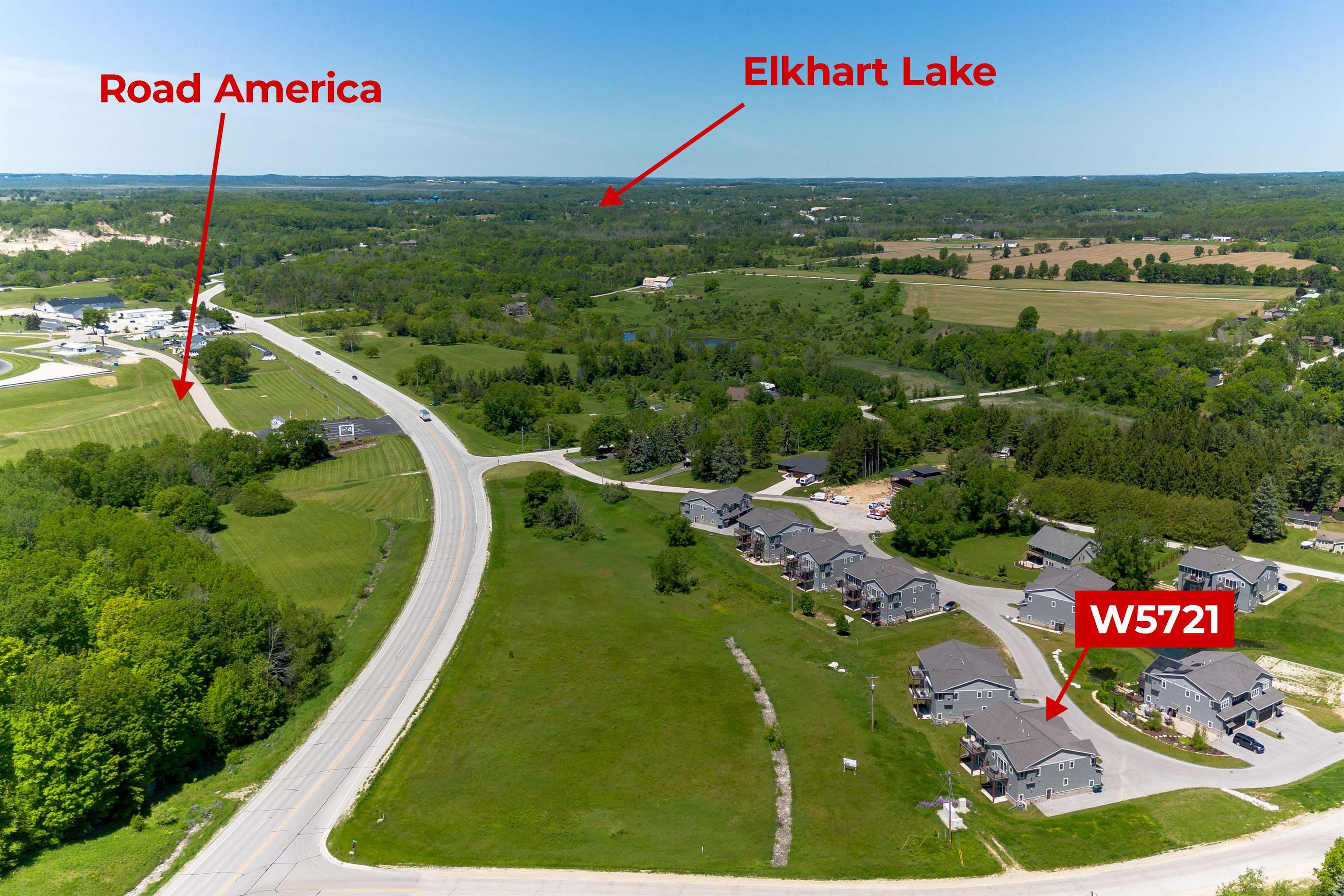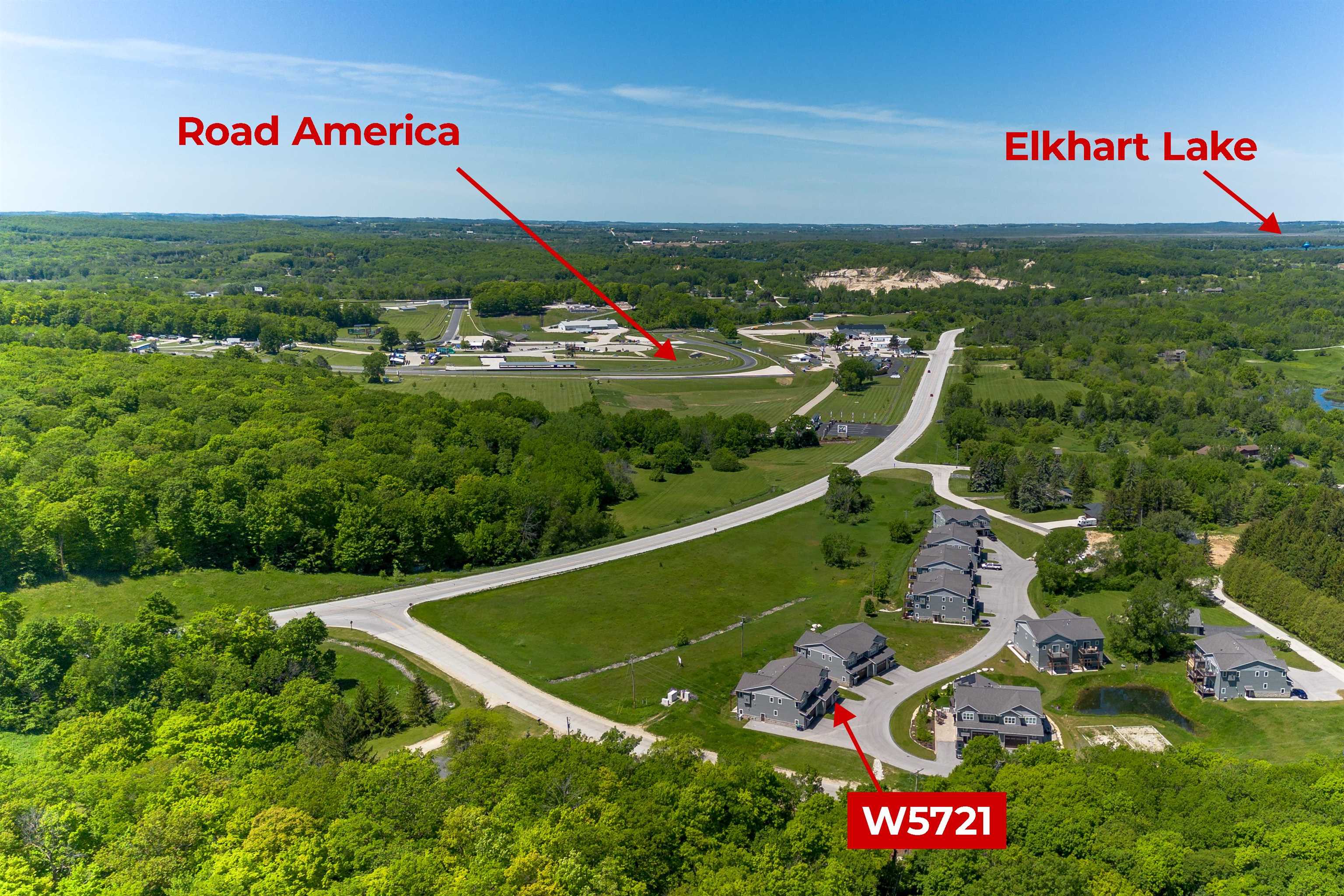LOCATION! LOCATION! LOCATION! Elkhart Lake area. Across the street & views of the main entrance for Road America! CALLING all racing fans, come & check out this professional designed condo w/everything you could need & want. Enjoy a 30x56 garage w/in-floor radiant heat, floor drain, 12' ceilings, and features a FULL bath. Modern flair while you tour the upstairs, whic is the main living area w/super-sized kitchen/dining/living room open area, vaulted ceiling, floor to ceiling stone, gas fireplace along w/expansive kitchen hosting granite countertops, island & endless counter & cabinet space...WALK-IN PANTRY too! Primary suite w/floor to ceiling tile, walk-in shower + walk-in closet & not to mention vauled ceiling. Laundry room. Extremely well maintained. Condo fee is $255/month