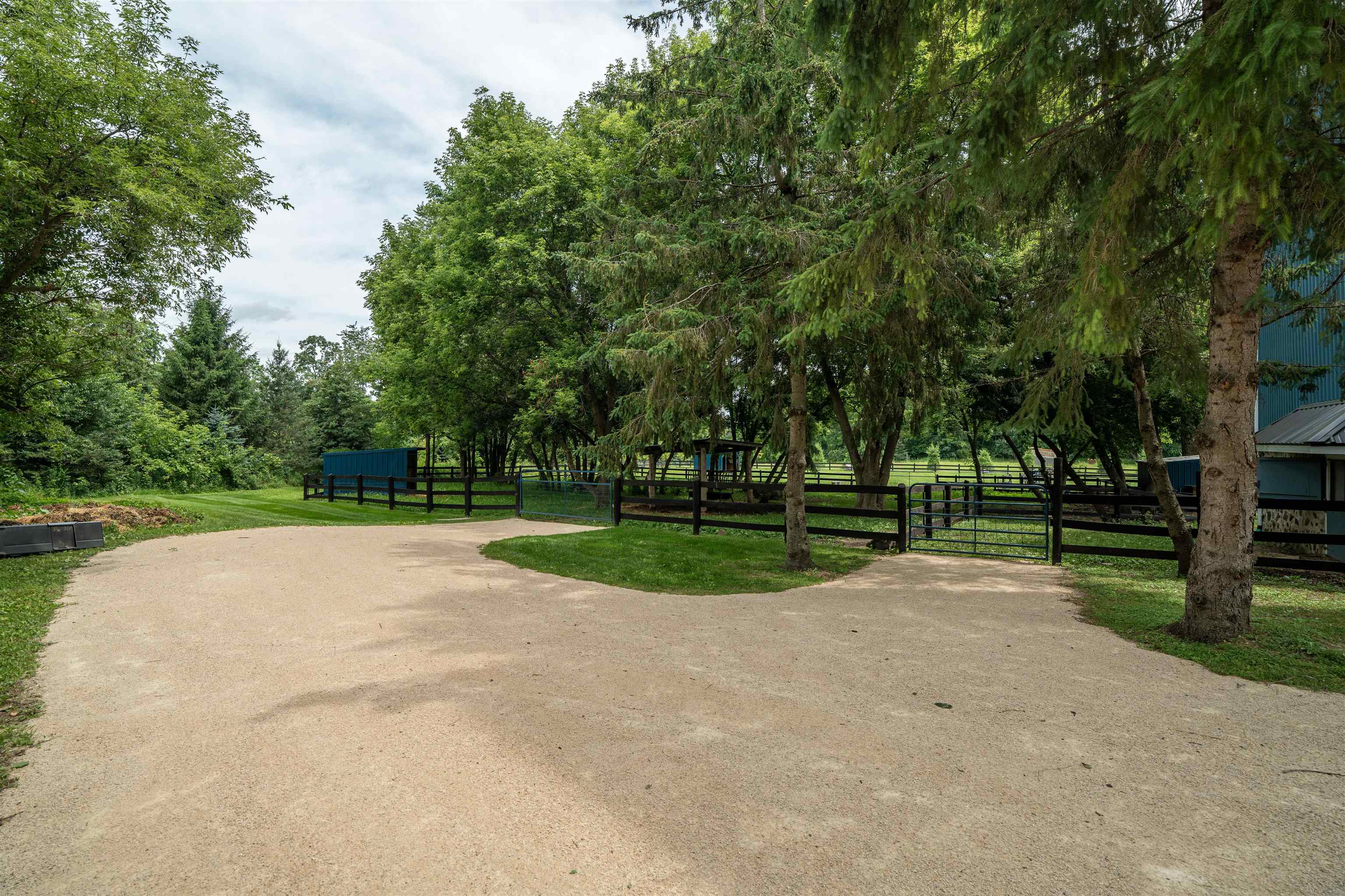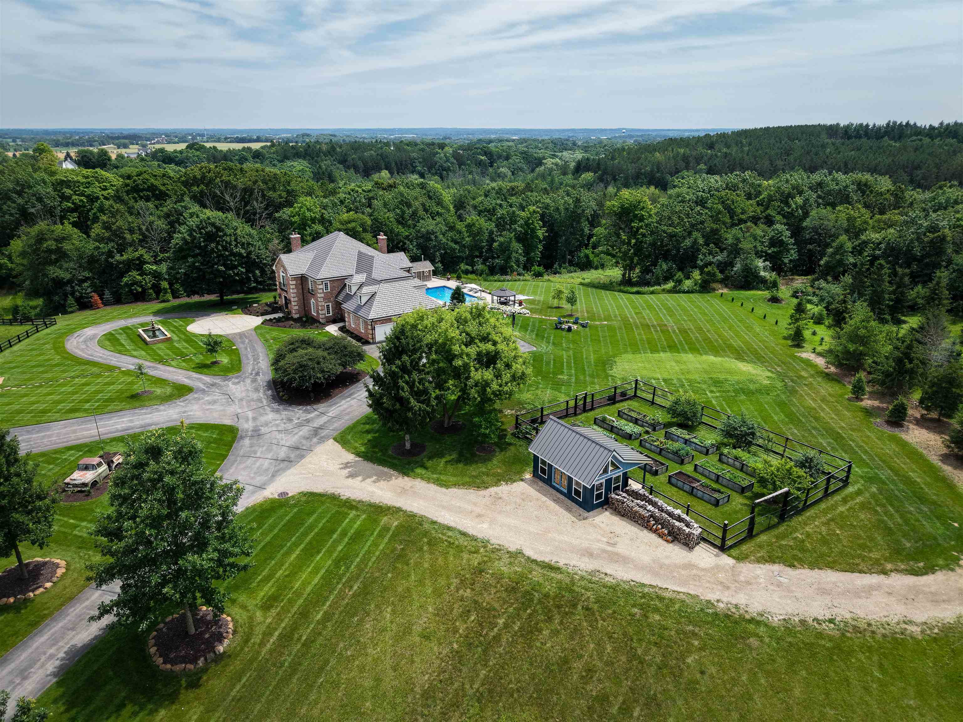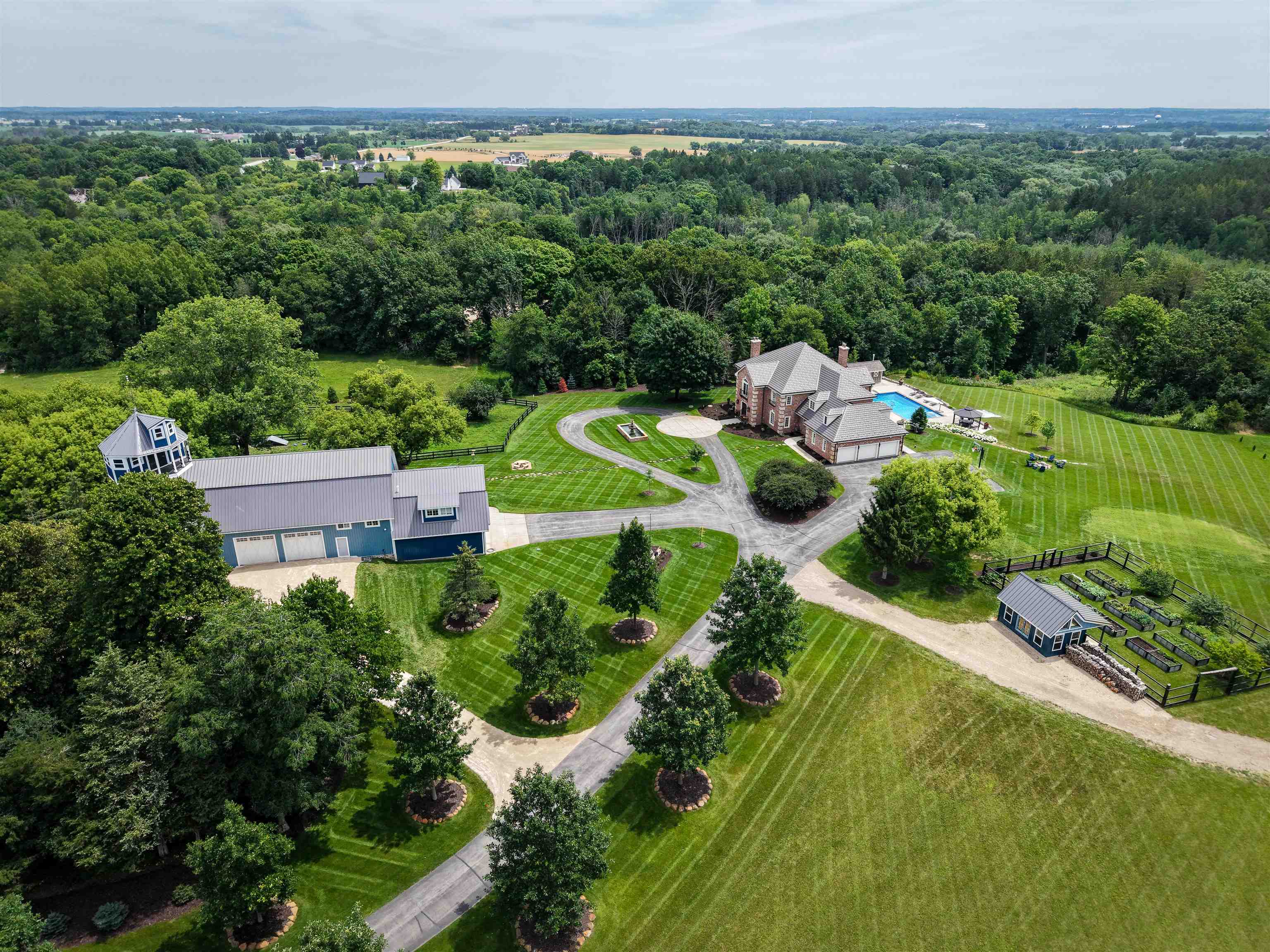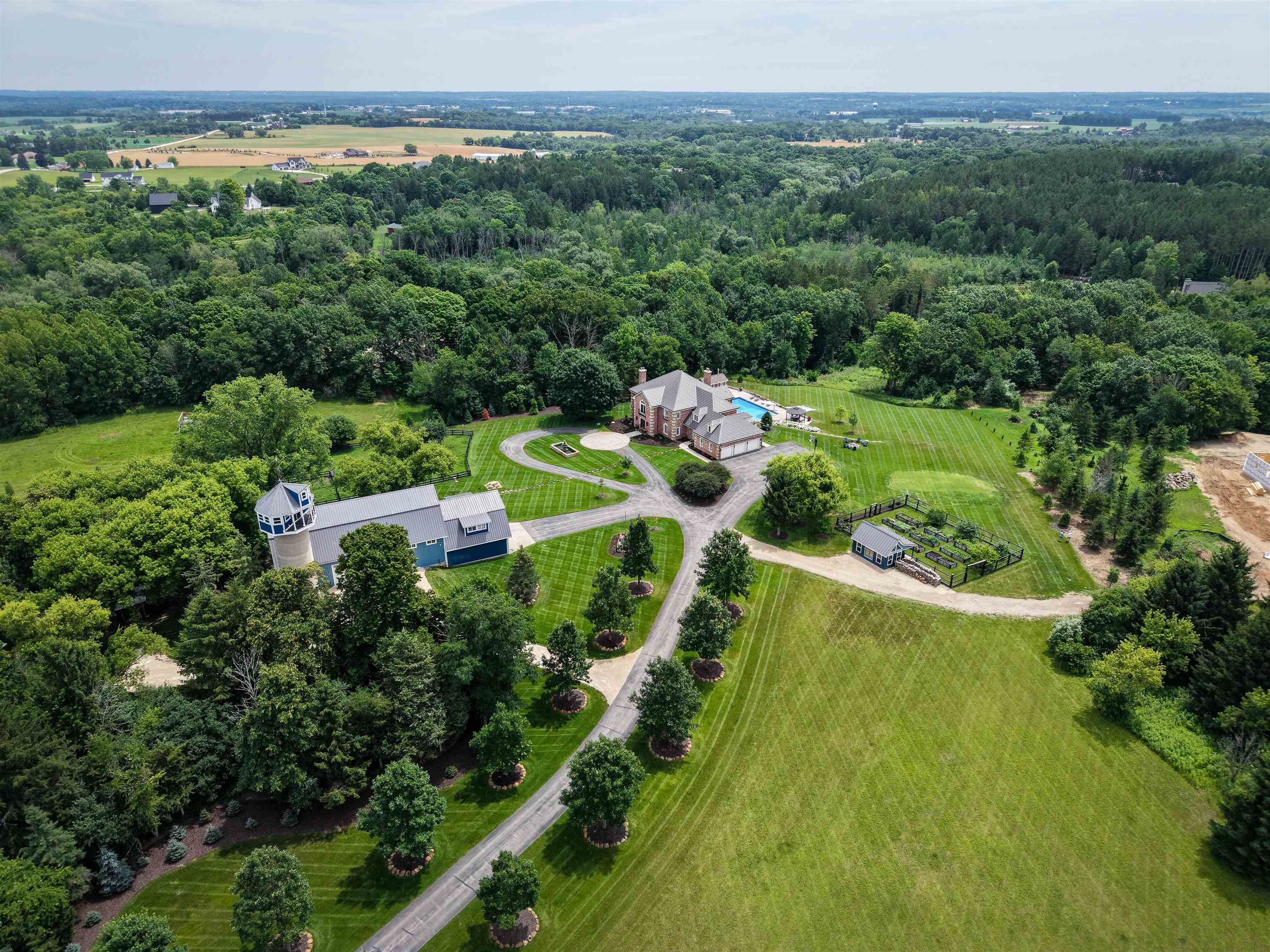 Experience luxury country living in this exceptional estate located in the Slinger School District. Behind a gated fence, this remarkable property offers 7 bedrooms and 7.5 baths with a sophisticated 5-zone heating and cooling system for year-round comfort. Outdoors, enjoy a resort-style heated salt water pool, a beautifully maintained garden supported by an 18-zone sprinkler system, 3 stalls and open pasture with automatic waterers—perfect for hobby farming or animals. A charming guest house provides private accommodations for visitors, while all-metal roofs ensure long-term durability and low maintenance. With a 6-stall garage and space to spread out, this estate blends elegance with function. Seller relocating—rare opportunity to own a premier property of this caliber.