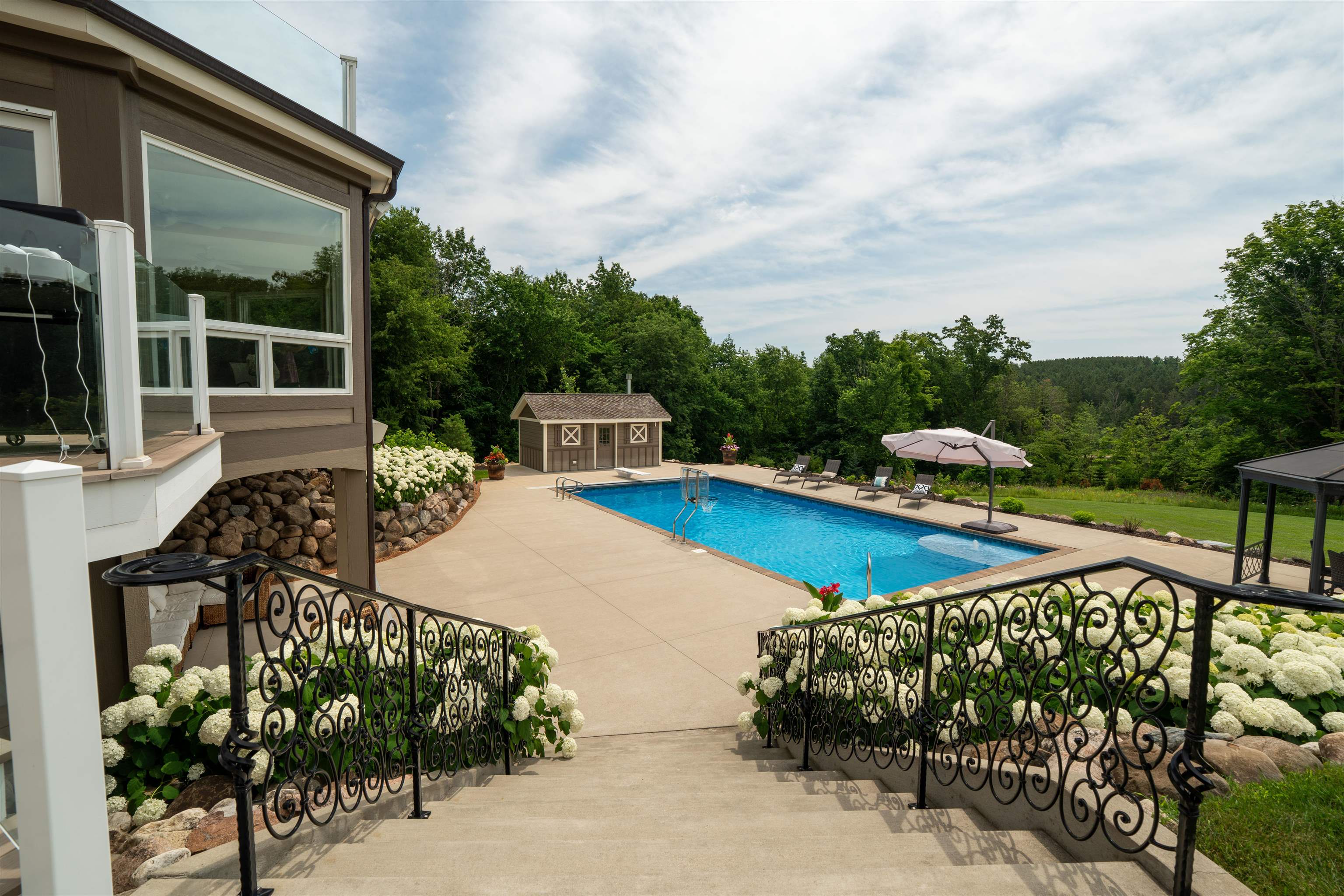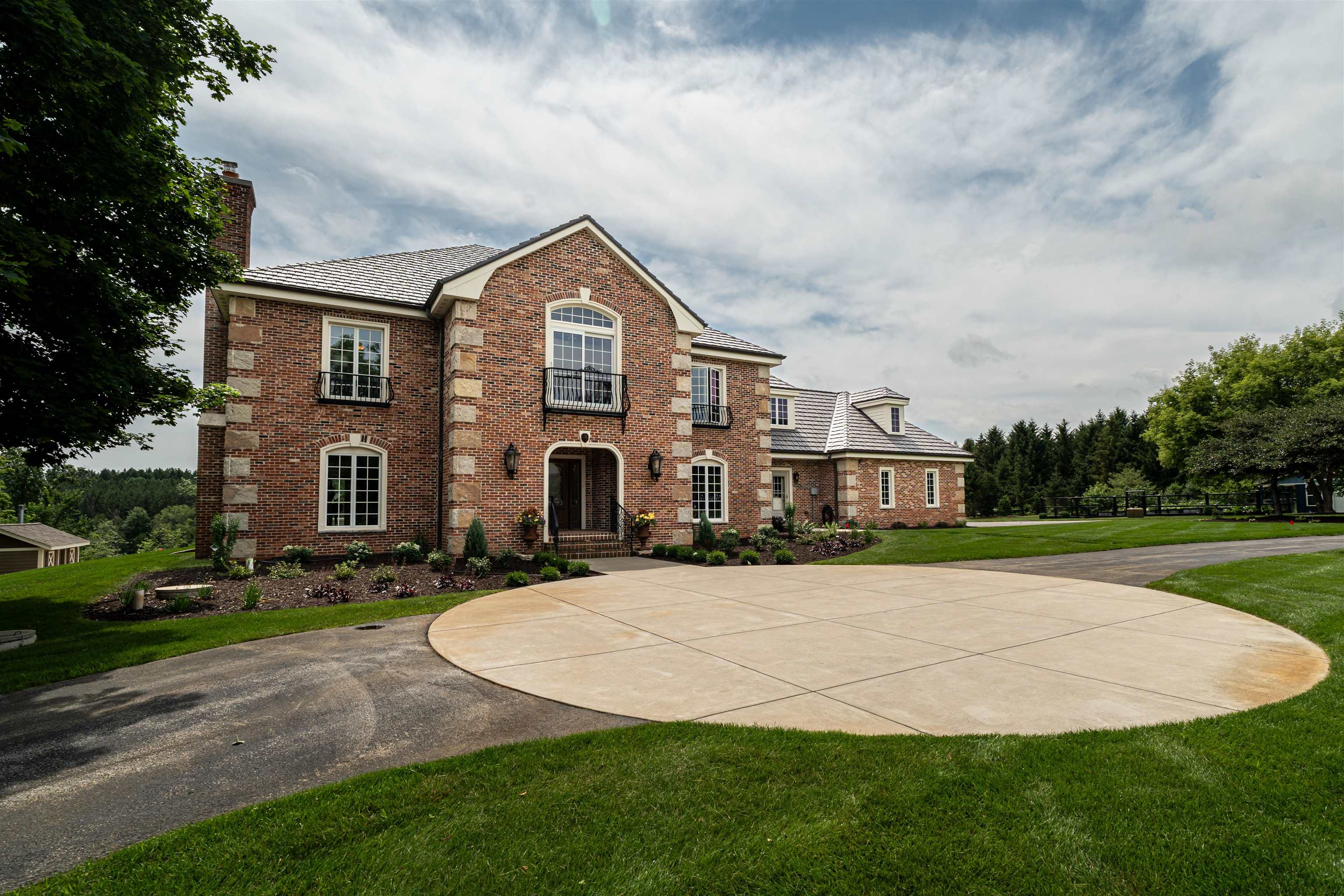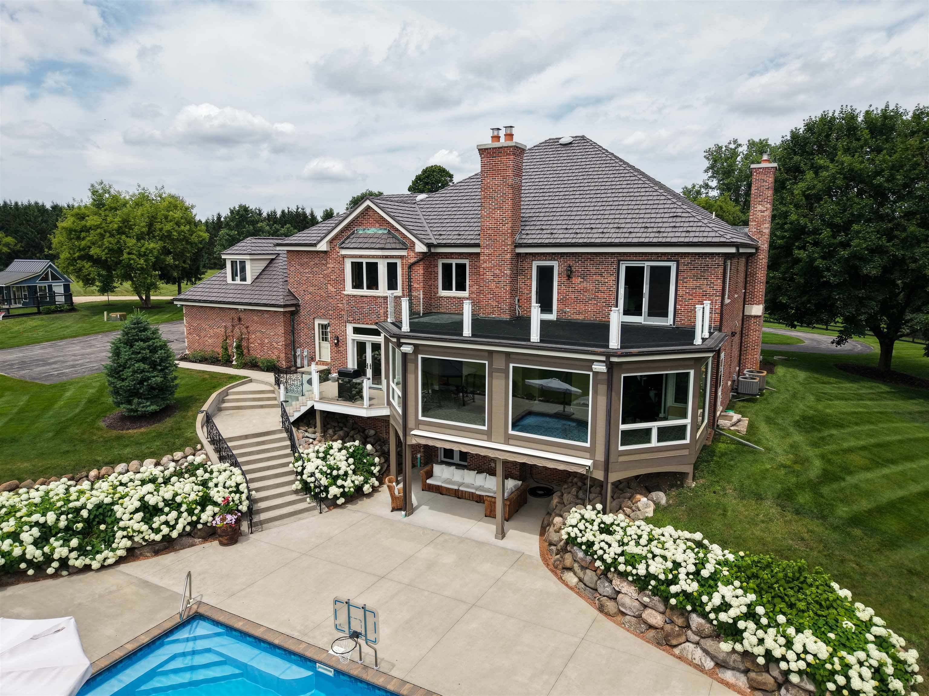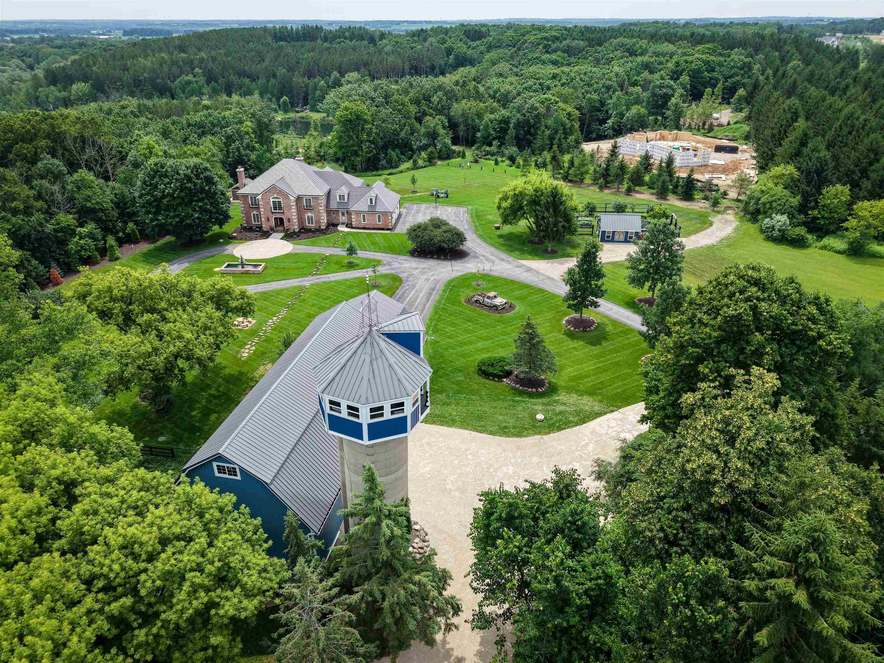 Experience luxury country living in this exceptional estate located in the Slinger School District. Behind a gated fence, this remarkable property offers 7 bedrooms and 7.5 baths with a sophisticated 5-zone heating and cooling system for year-round comfort. Outdoors, enjoy a resort-style heated salt water pool, a beautifully maintained garden supported by an 18-zone sprinkler system, 3 stalls and open pasture with automatic waterers—perfect for hobby farming or animals. A charming guest house provides private accommodations for visitors, while all-metal roofs ensure long-term durability and low maintenance. With a 6-stall garage and space to spread out, this estate blends elegance with function. Seller relocating—rare opportunity to own a premier property of this caliber.