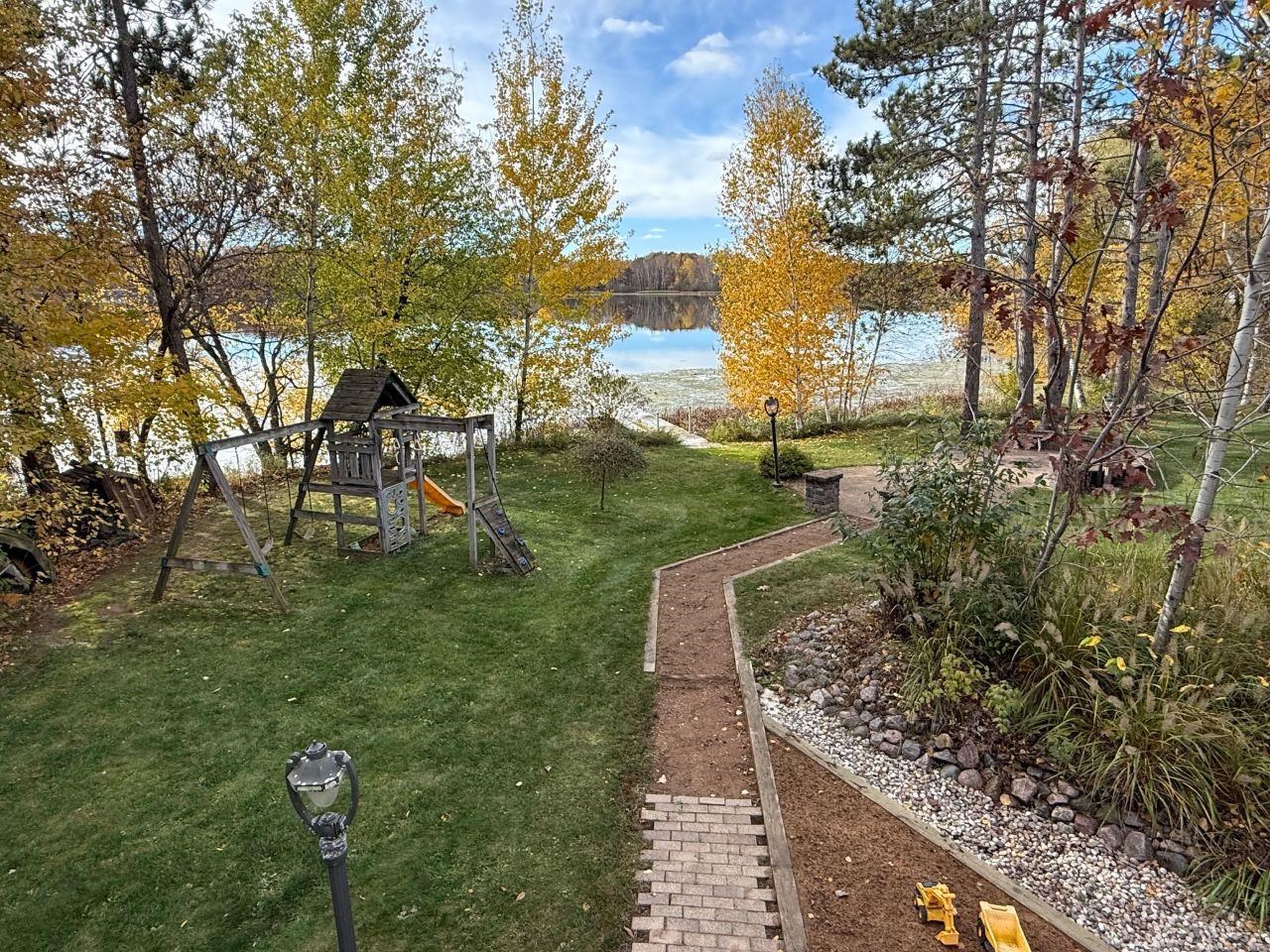 Upper Red Lake gem! This 3-bedroom open-concept ranch offers a finished walk-out lower level and awesome water views. The main floor features a great room with a tongue-and-groove wood ceiling, skylight, and wood-burning fireplace. Patio doors open to a deck overlooking the lake. The kitchen includes an island with a cooktop and built-in oven, while the adjoining dining area has a built-in desk and a set of patio doors. Two bedrooms and a full bath complete the main level. Downstairs, a large family room with a fireplace, wet bar, and walk-out patio make a nice gathering space. The lower level also includes a bedroom with egress window and a full bath with shower. A 2-car garage with heated shop and beautifully landscaped yard complete this property with approx. 129 feet of water frontage.