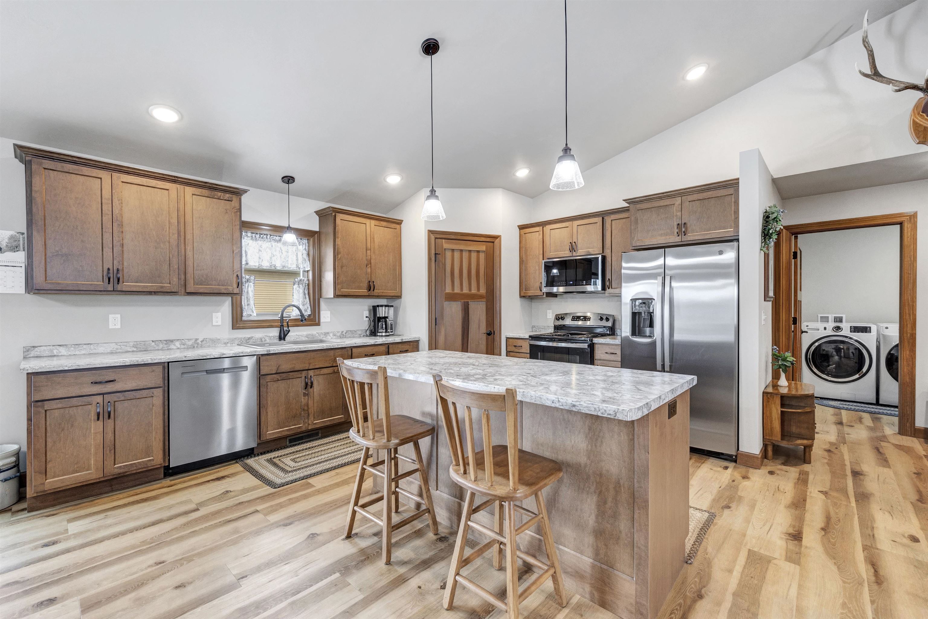 Don't miss this better than new, 2023 custom built ranch home in Seymour w/ 4 car attached garage. This home features a split-bedroom design w/ 3 beds, 2 full baths, a bright open-concept layout w/ vaulted ceilings, tons of natural light & roomy kitchen w/ island, SS appliances, extended counters & big corner pantry. Enjoy the spacious FF laundry w/ xtra freezer & utility sink + drop zone from garage. Primary bedroom has WIC & ensuite bath w/ vanity + built-in seated makeup counter. Dream attached garage boasts extra deep 3rd stall (46 ft long!) for all your storage needs, 2 floor drains, hot & cold water spigot & convenient side door aligned w/ staircase to LL for easy moving. LL awaits your finishes w/ high ceilings & is stubbed for future bath. 12x12 patio out back!