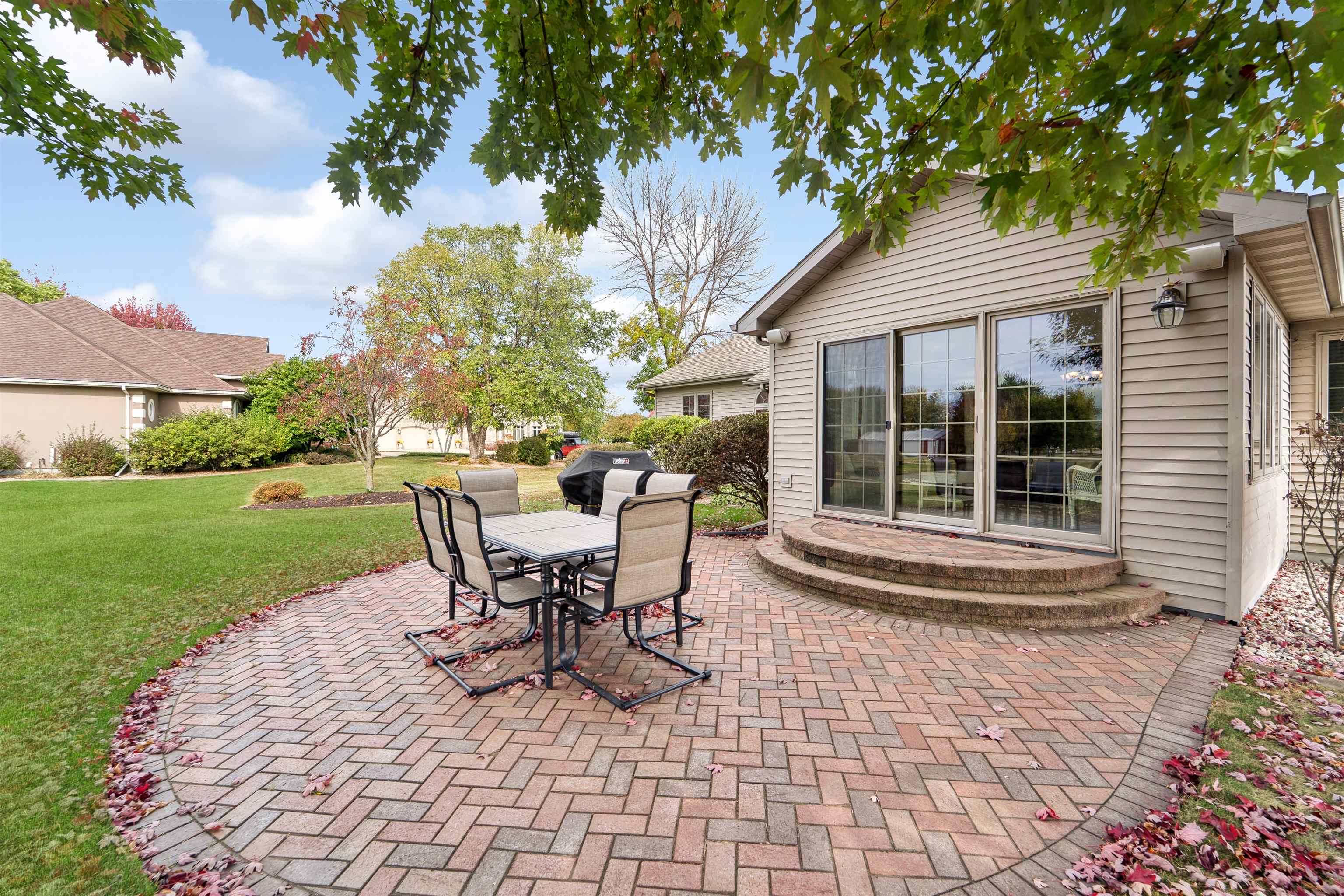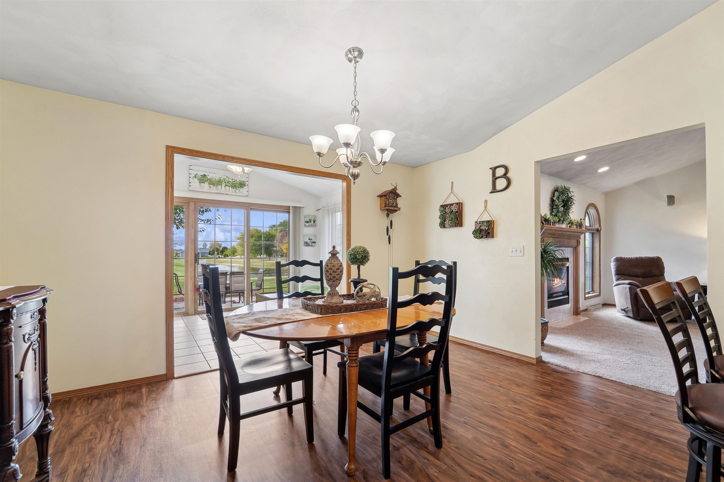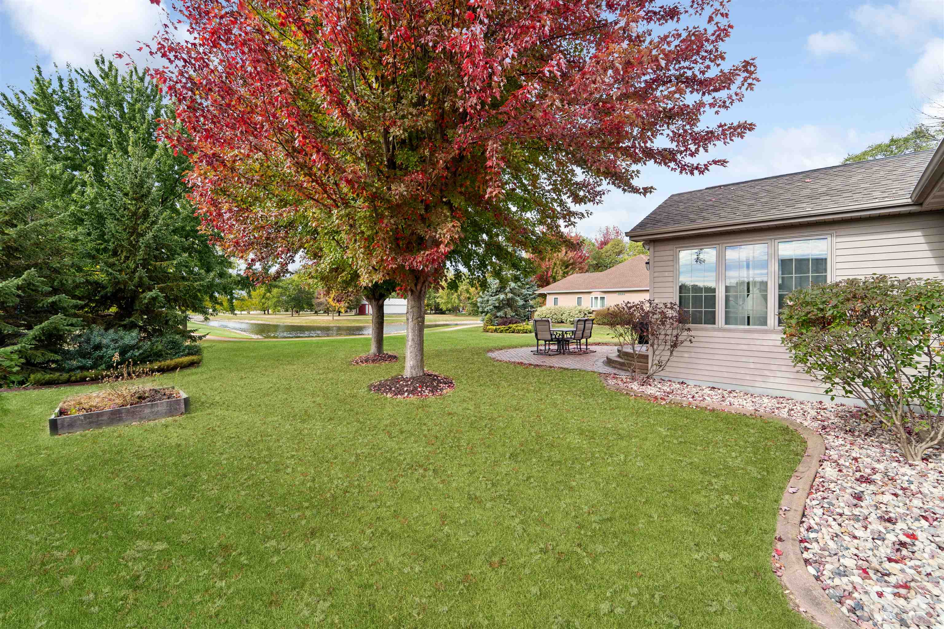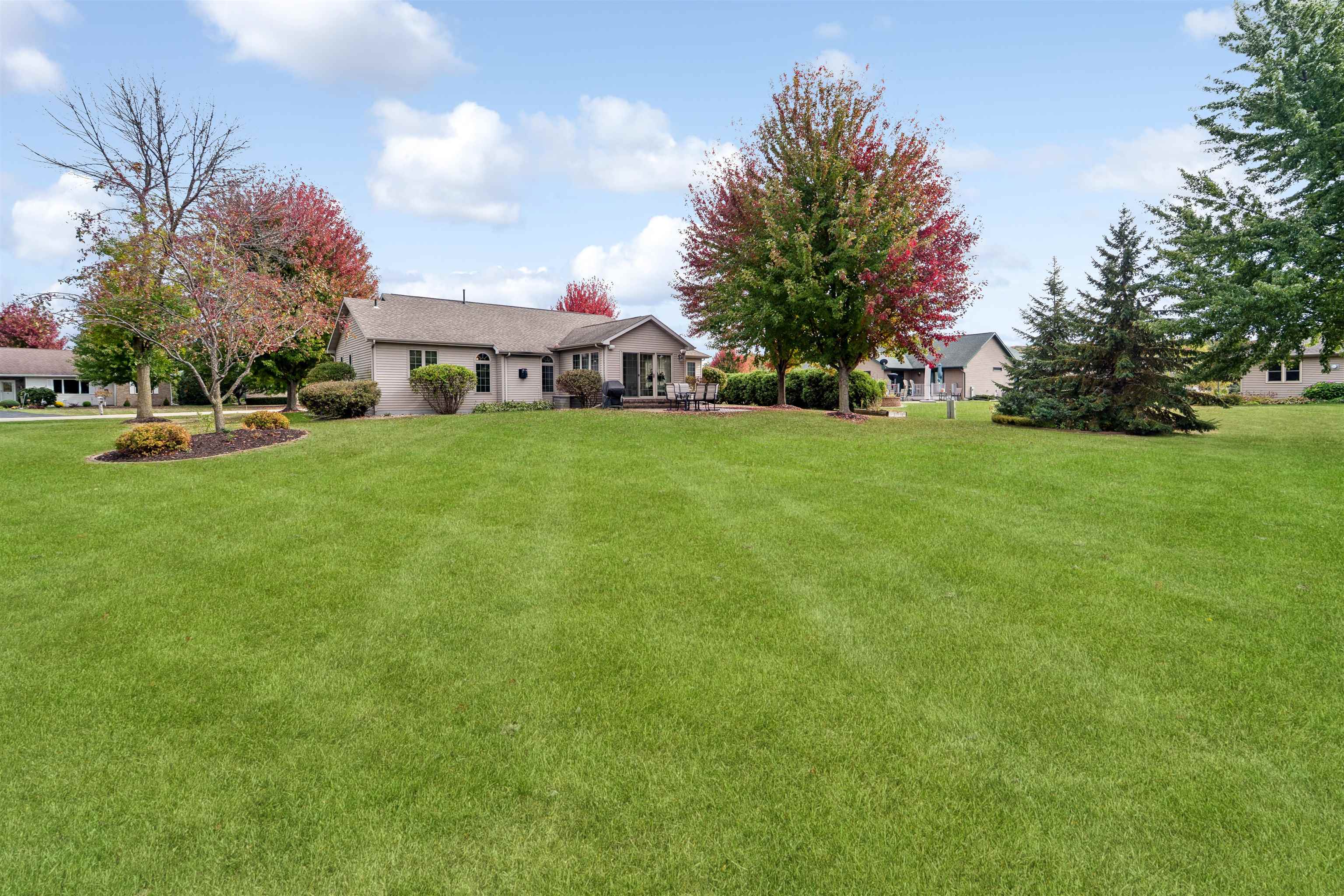 Desirable split-bedroom ranch! As you enter the home, the living room greets you with a cathedral ceiling and a cozy gas fireplace. The open-concept design flows into the kitchen, featuring granite countertops, breakfast bar, and a full appliance package. Adjacent to the kitchen is the dining area with access to your four-season room and concrete patio overlooking the pond — perfect for relaxing or entertaining. The primary bedroom offers a walk-in closet and a private bath with a tile walk-in shower. Two additional bedrooms share the main bathroom. A spacious 3.5 attached garage with generator plug and includes stairs leading down to the basement. Steps away from High Cliff State Park and Lake Winnebago!