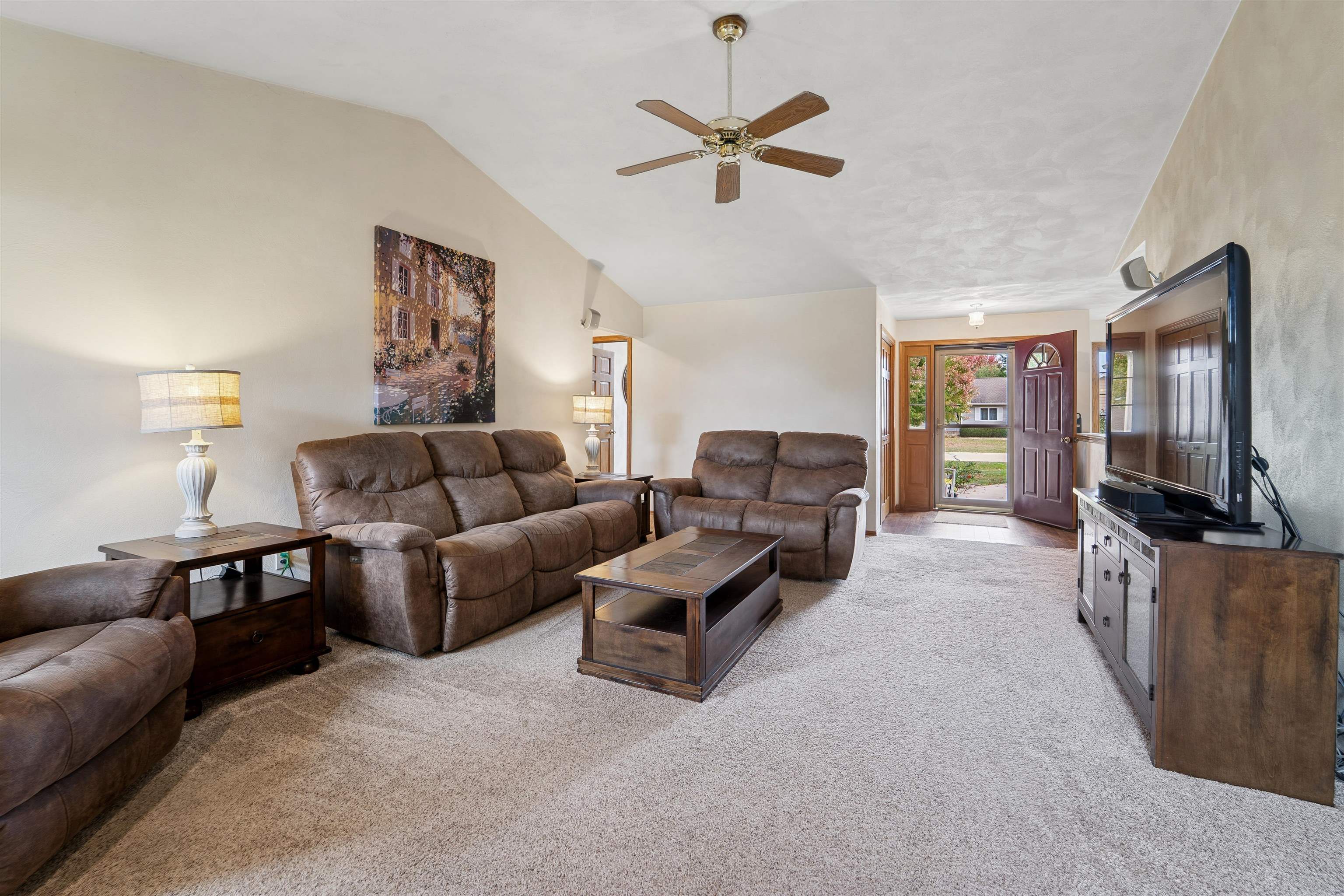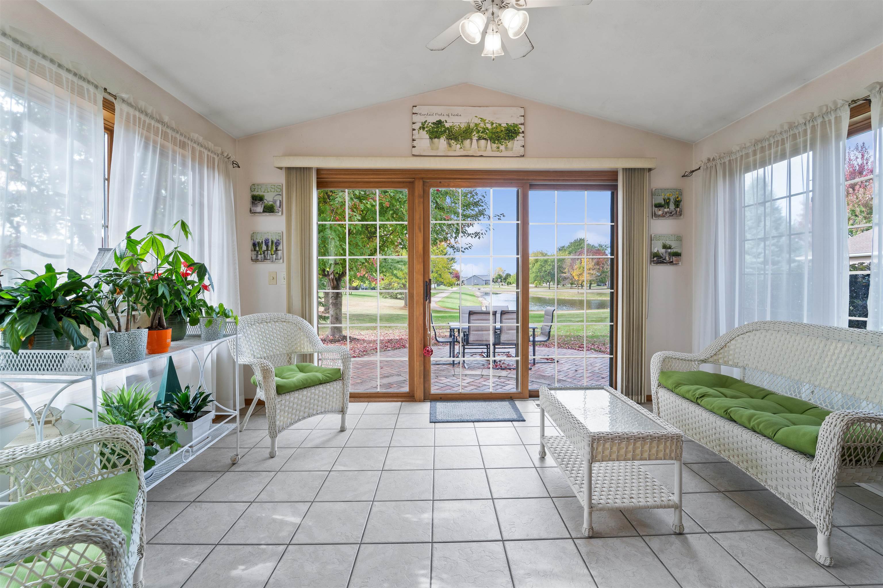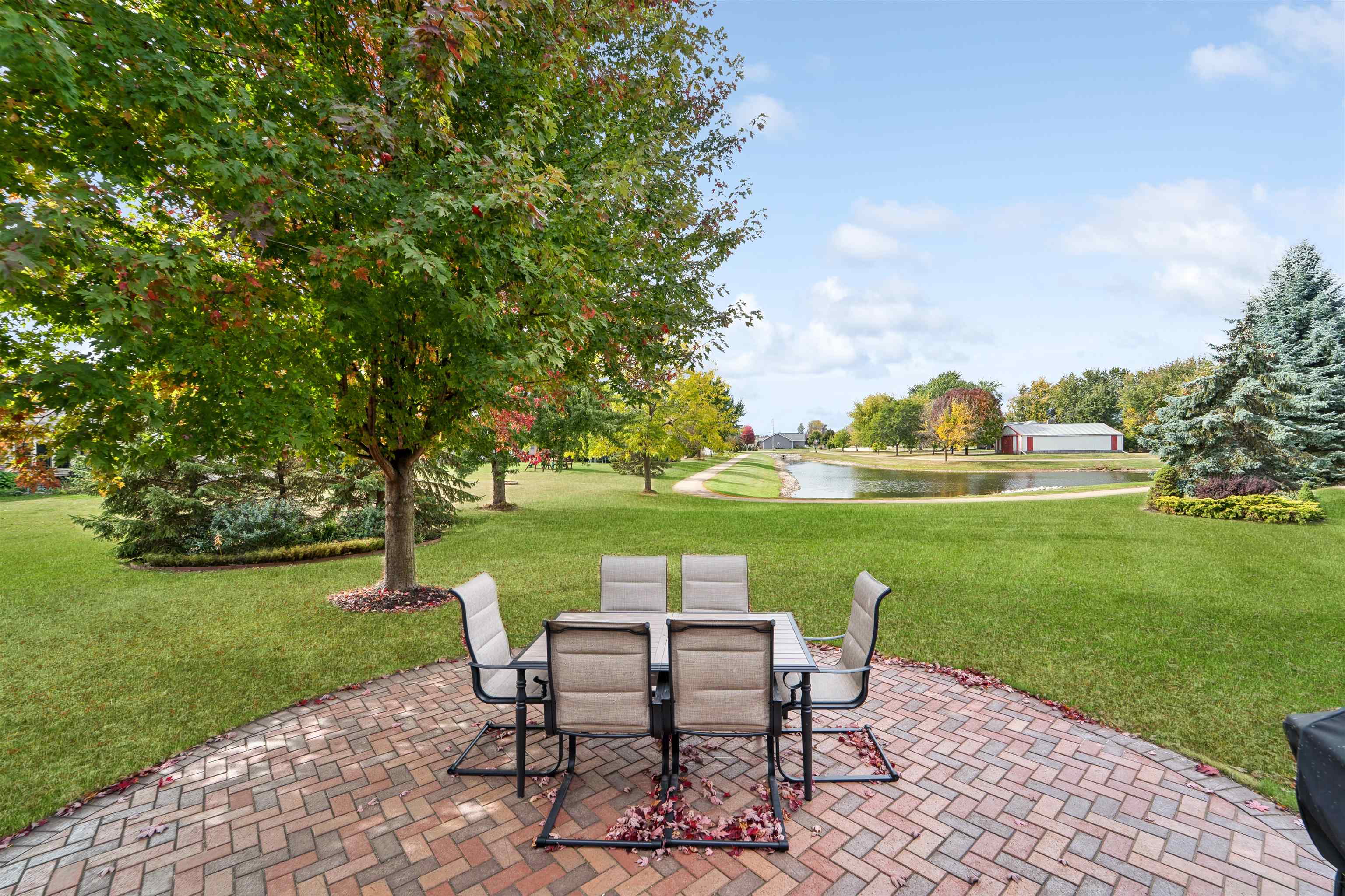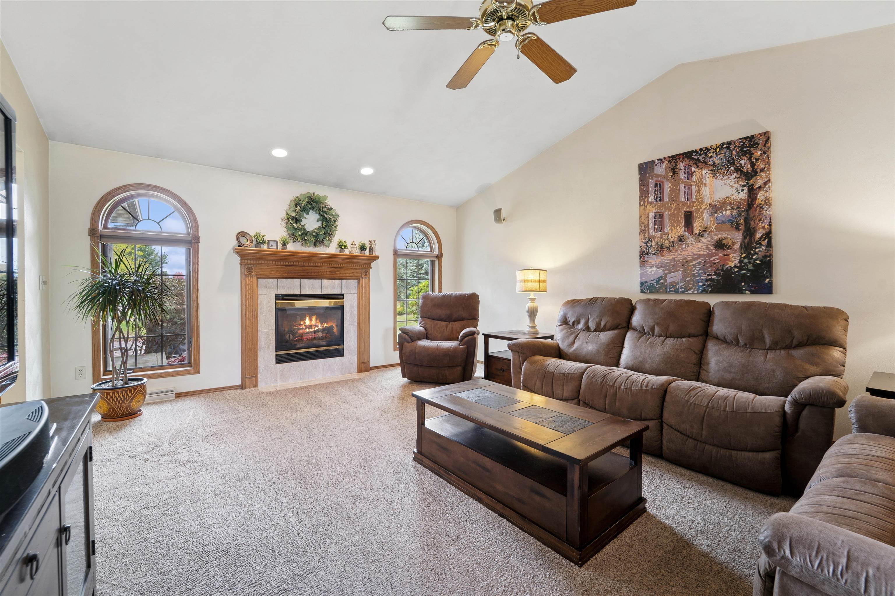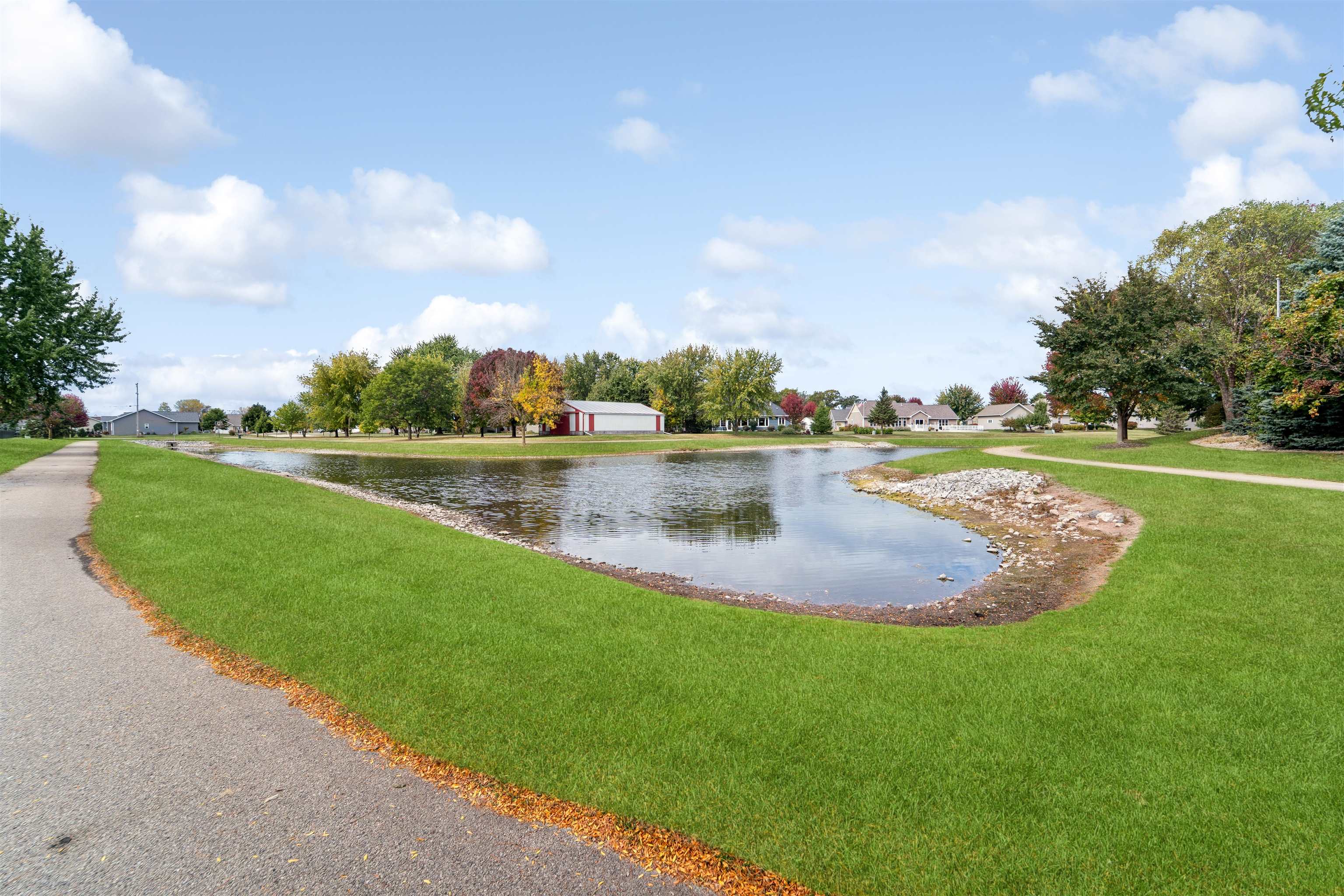Desirable split-bedroom ranch! As you enter the home, the living room greets you with a cathedral ceiling and a cozy gas fireplace. The open-concept design flows into the kitchen, featuring granite countertops, breakfast bar, and a full appliance package. Adjacent to the kitchen is the dining area with access to your four-season room and concrete patio overlooking the pond — perfect for relaxing or entertaining. The primary bedroom offers a walk-in closet and a private bath with a tile walk-in shower. Two additional bedrooms share the main bathroom. A spacious 3.5 attached garage with generator plug and includes stairs leading down to the basement. Steps away from High Cliff State Park and Lake Winnebago!