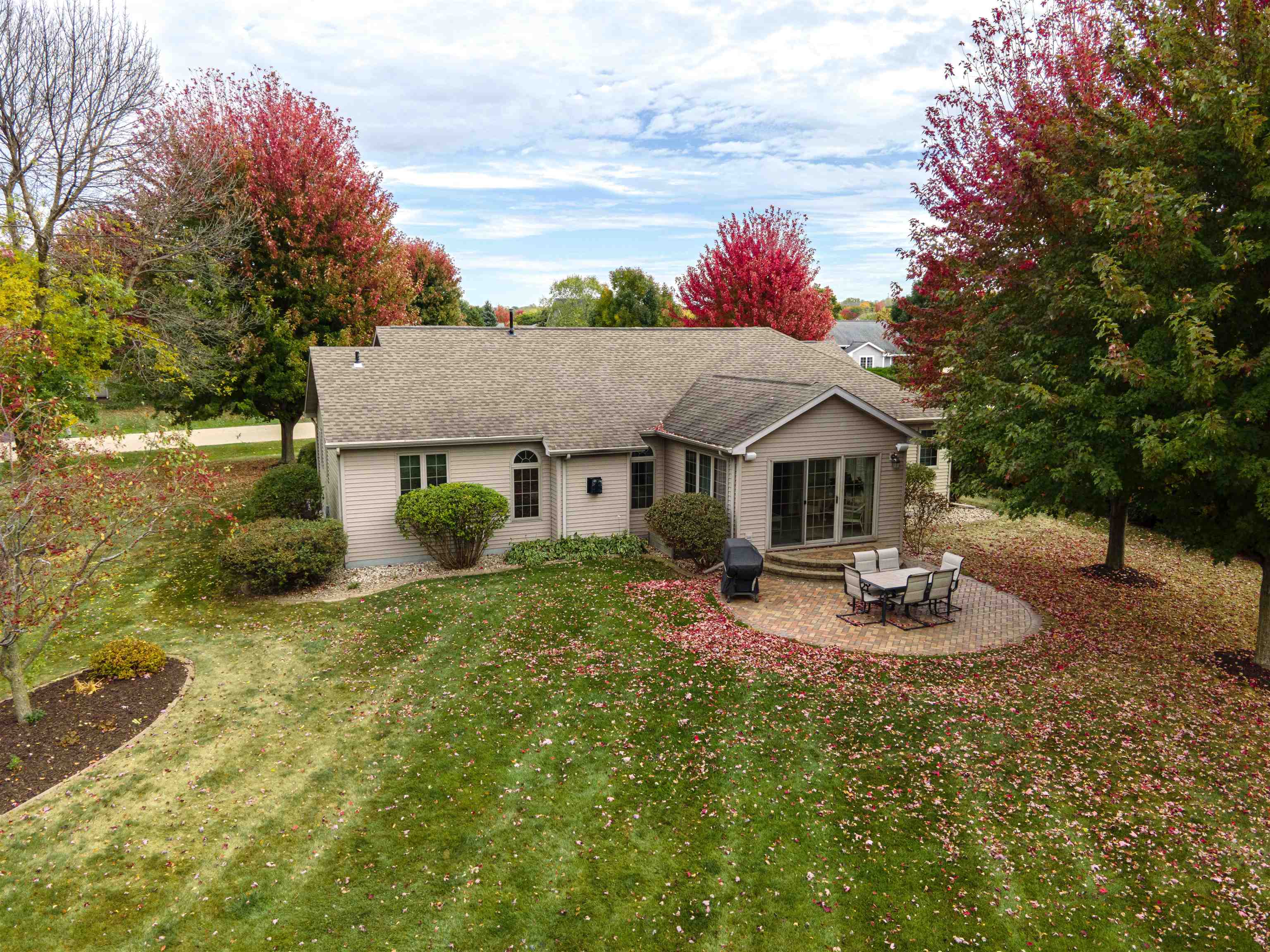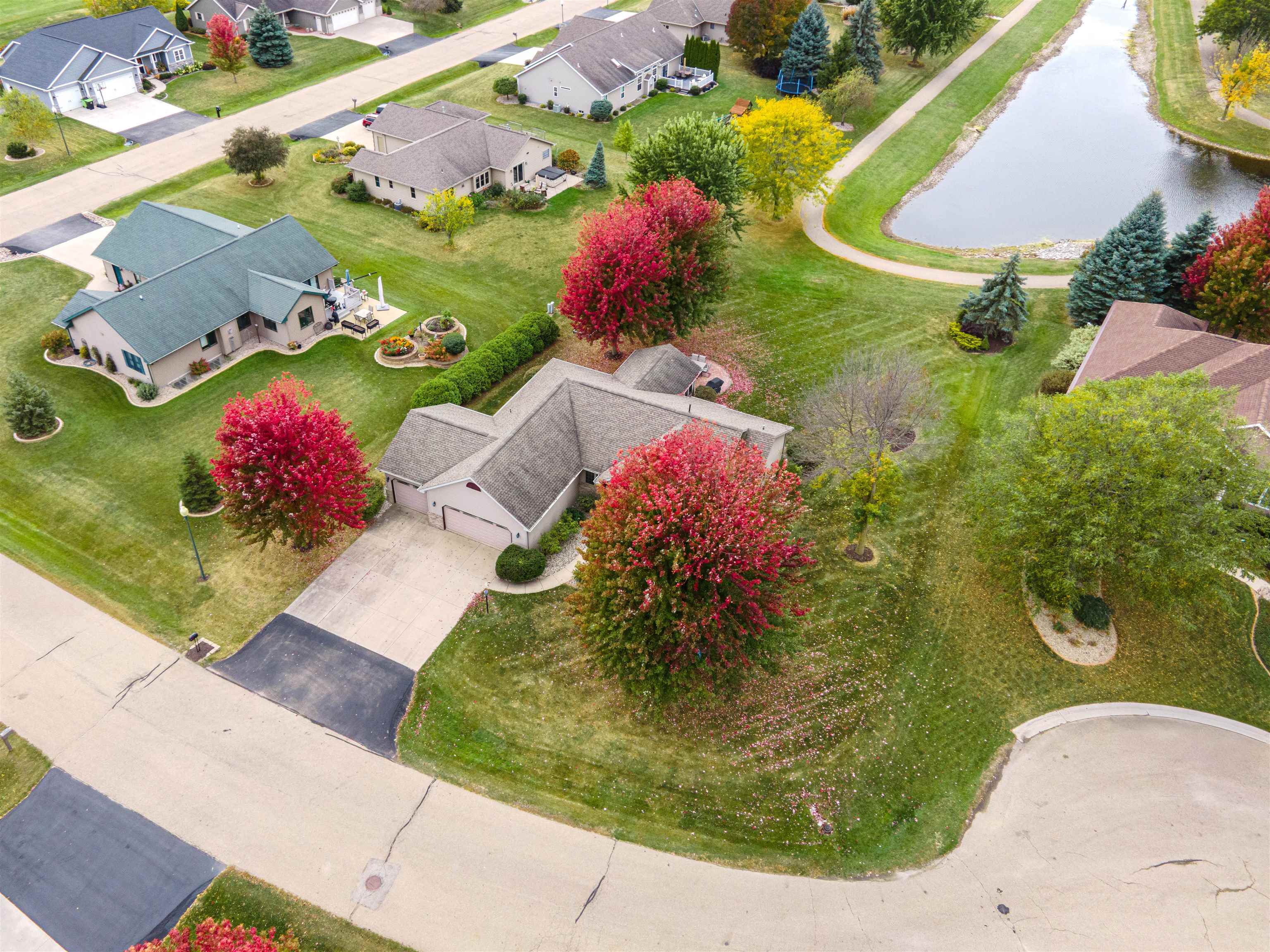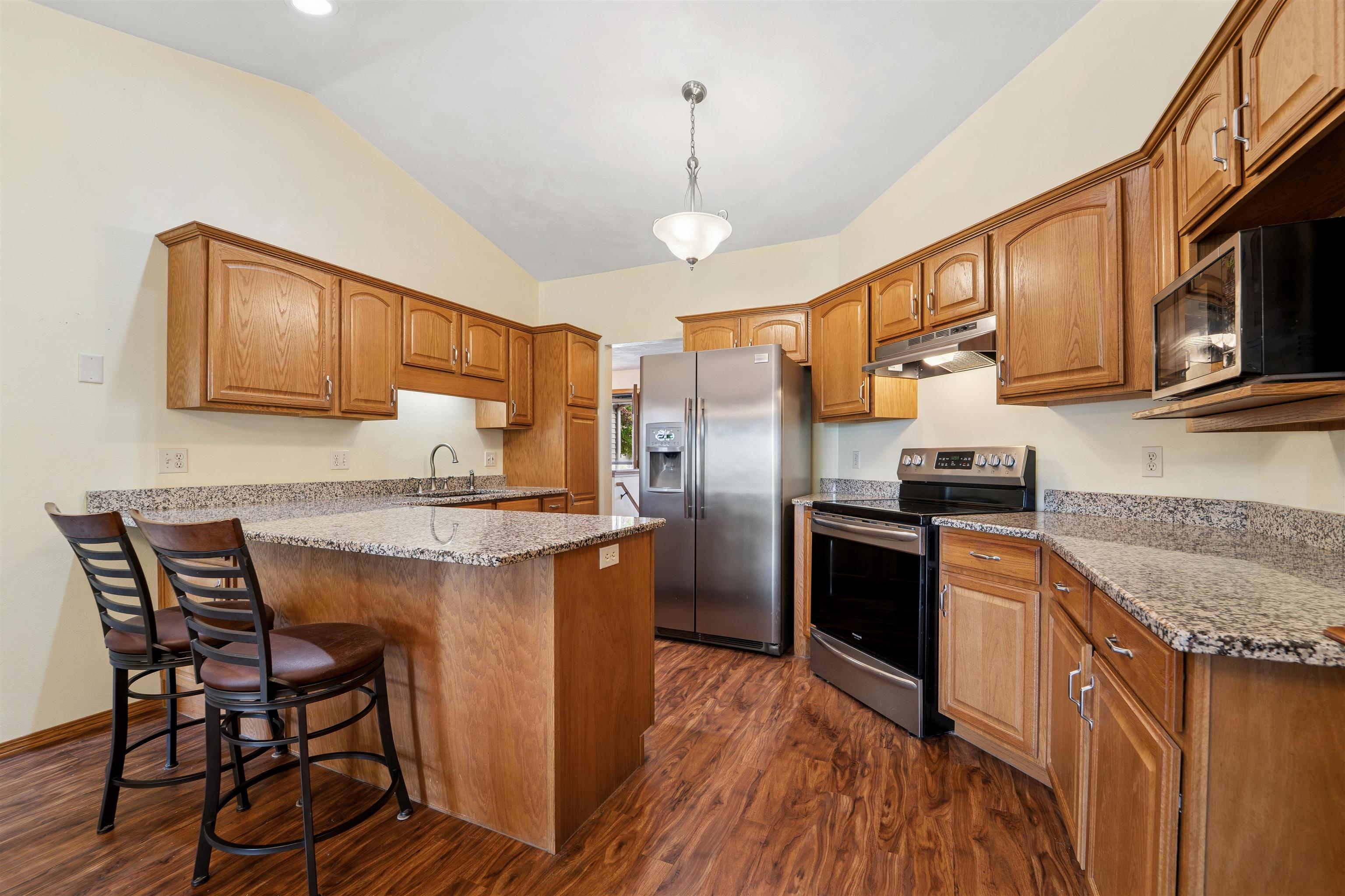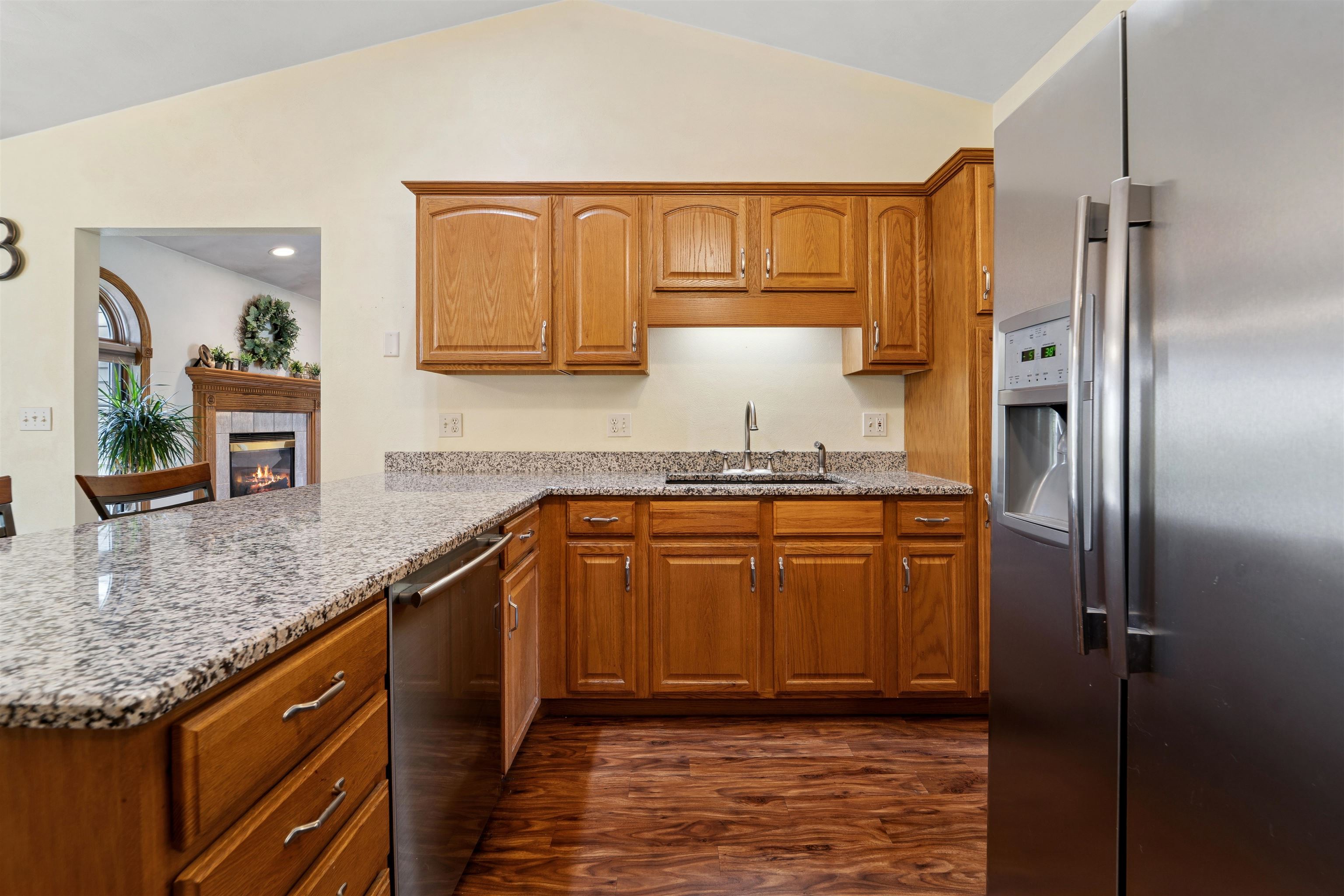 Desirable split-bedroom ranch! As you enter the home, the living room greets you with a cathedral ceiling and a cozy gas fireplace. The open-concept design flows into the kitchen, featuring granite countertops, breakfast bar, and a full appliance package. Adjacent to the kitchen is the dining area with access to your four-season room and concrete patio overlooking the pond — perfect for relaxing or entertaining. The primary bedroom offers a walk-in closet and a private bath with a tile walk-in shower. Two additional bedrooms share the main bathroom. A spacious 3.5 attached garage with generator plug and includes stairs leading down to the basement. Steps away from High Cliff State Park and Lake Winnebago!