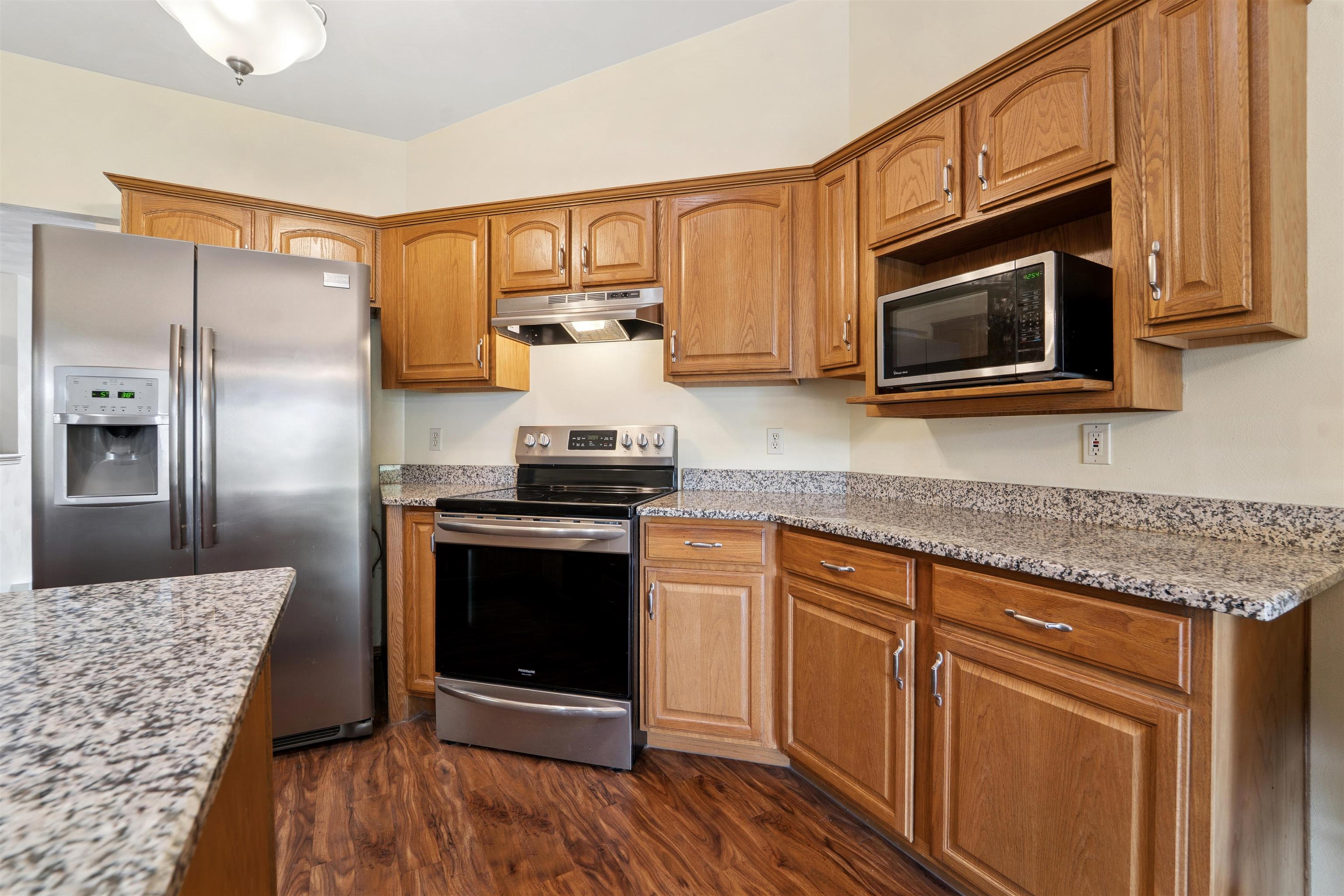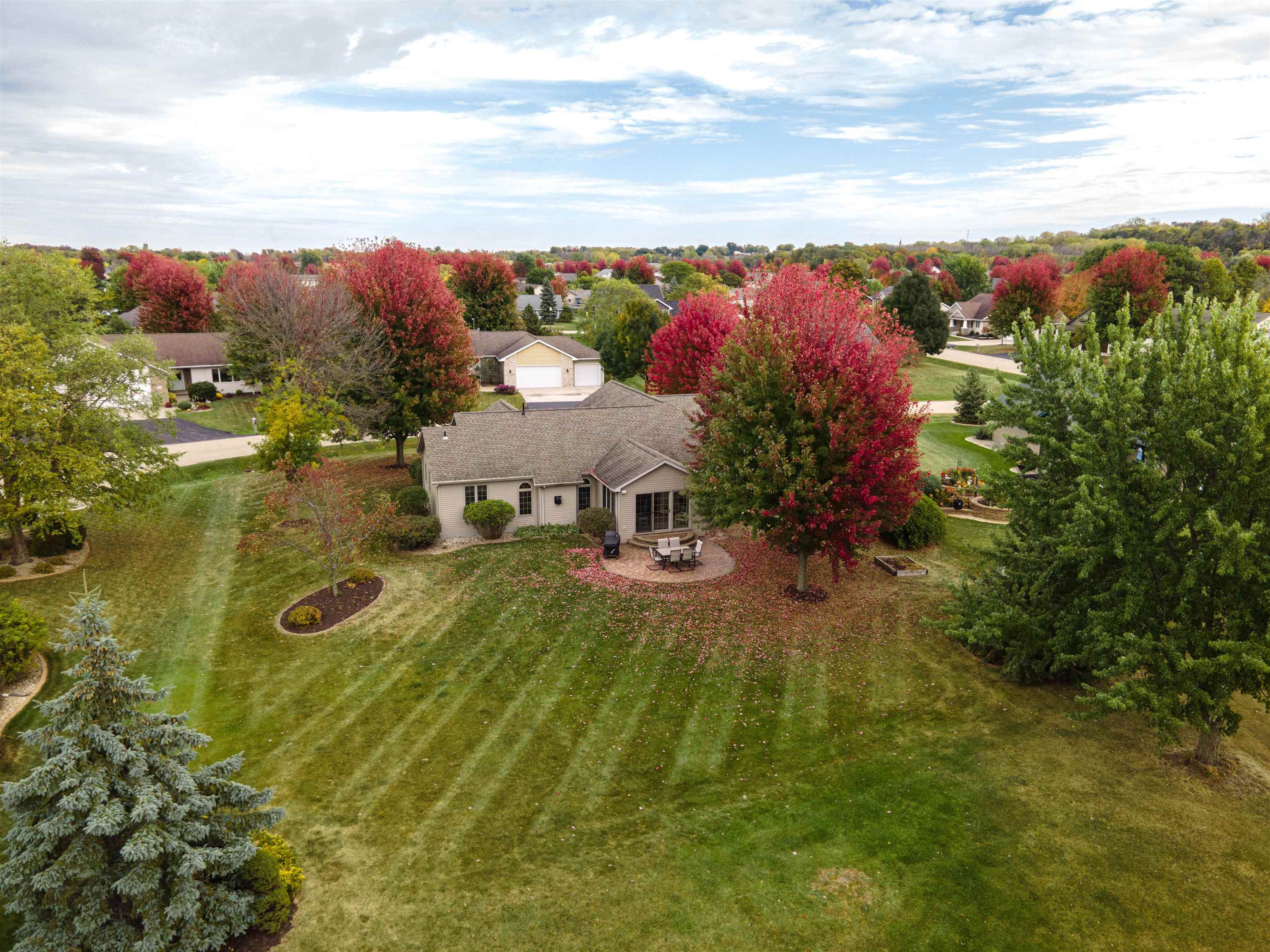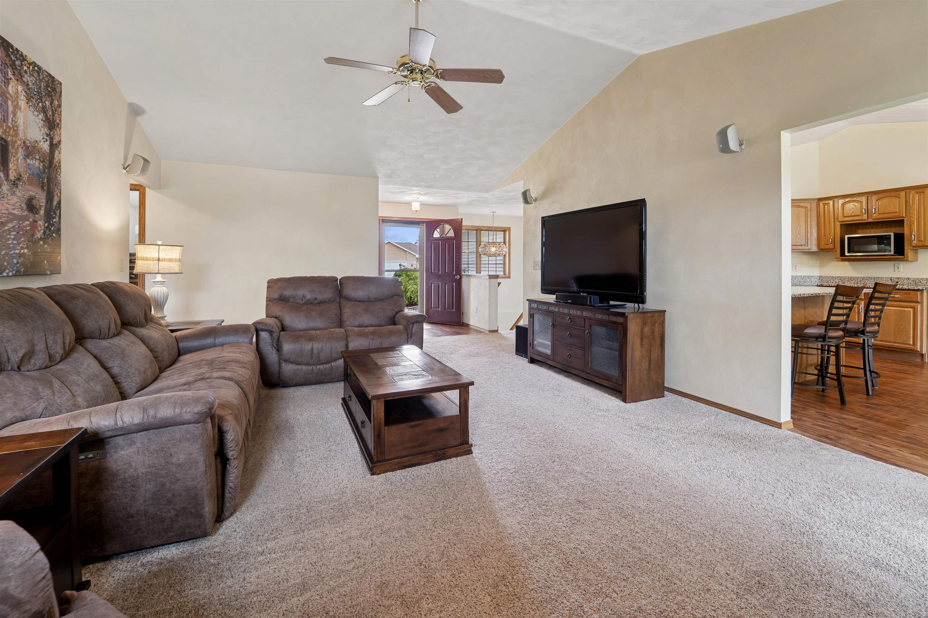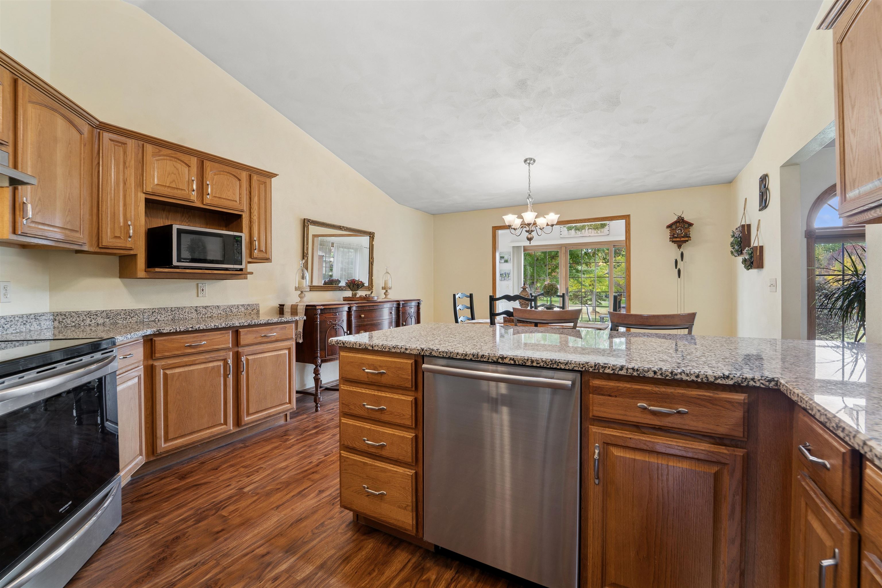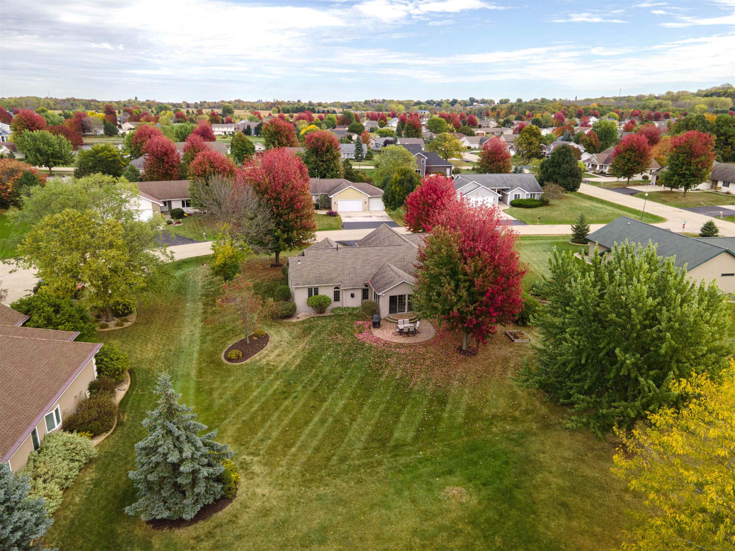 Desirable split-bedroom ranch! As you enter the home, the living room greets you with a cathedral ceiling and a cozy gas fireplace. The open-concept design flows into the kitchen, featuring granite countertops, breakfast bar, and a full appliance package. Adjacent to the kitchen is the dining area with access to your four-season room and concrete patio overlooking the pond — perfect for relaxing or entertaining. The primary bedroom offers a walk-in closet and a private bath with a tile walk-in shower. Two additional bedrooms share the main bathroom. A spacious 3.5 attached garage with generator plug and includes stairs leading down to the basement. Steps away from High Cliff State Park and Lake Winnebago!