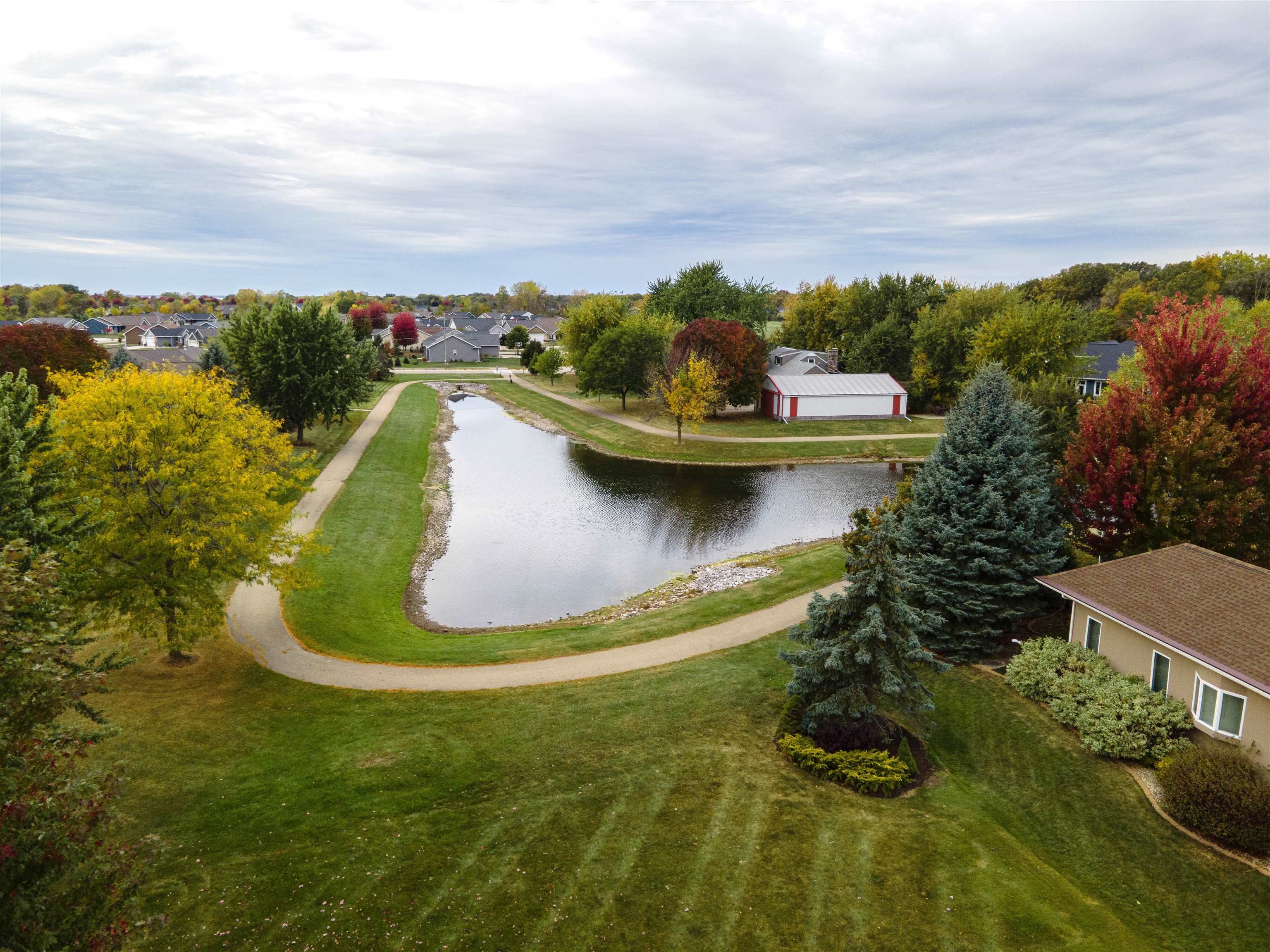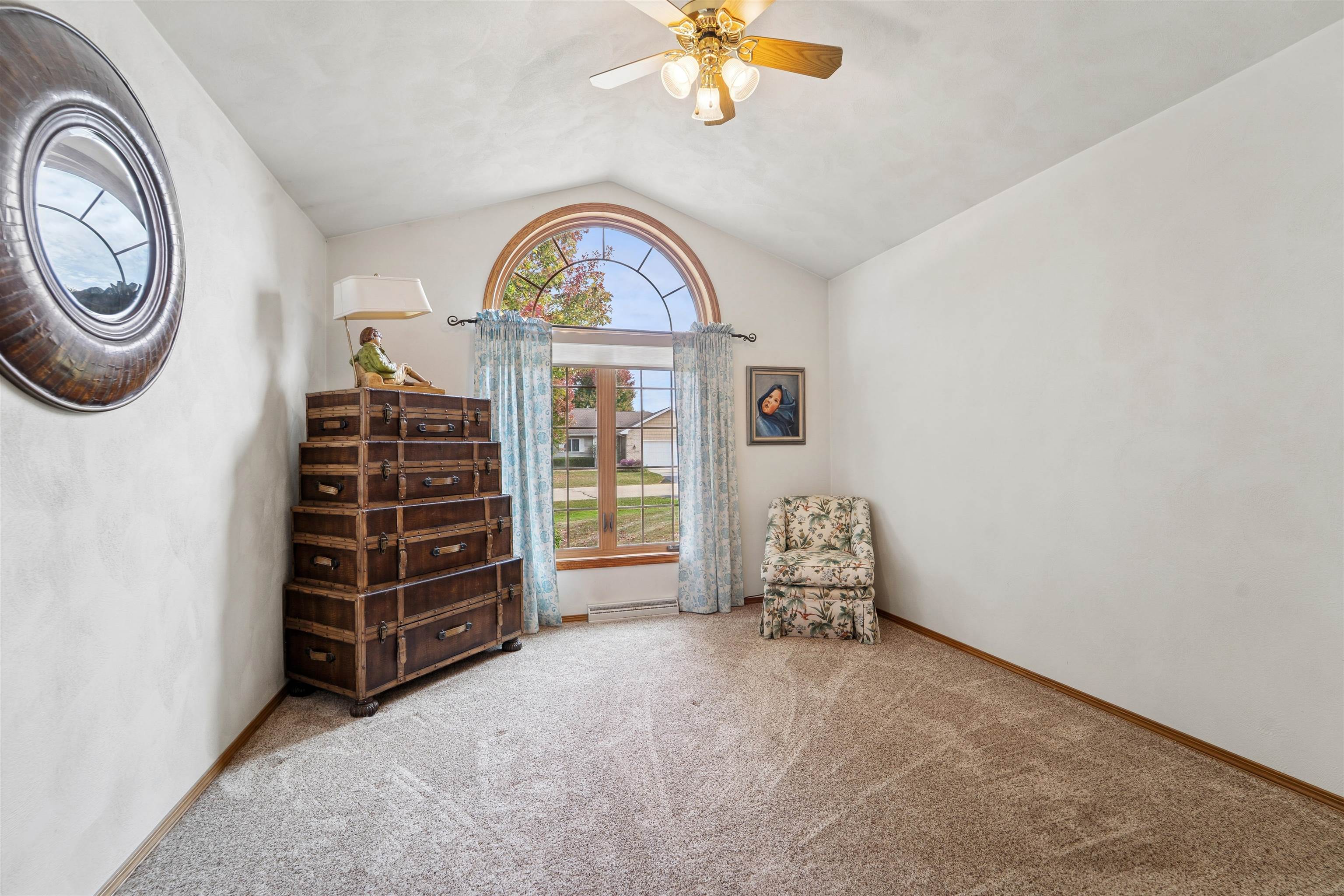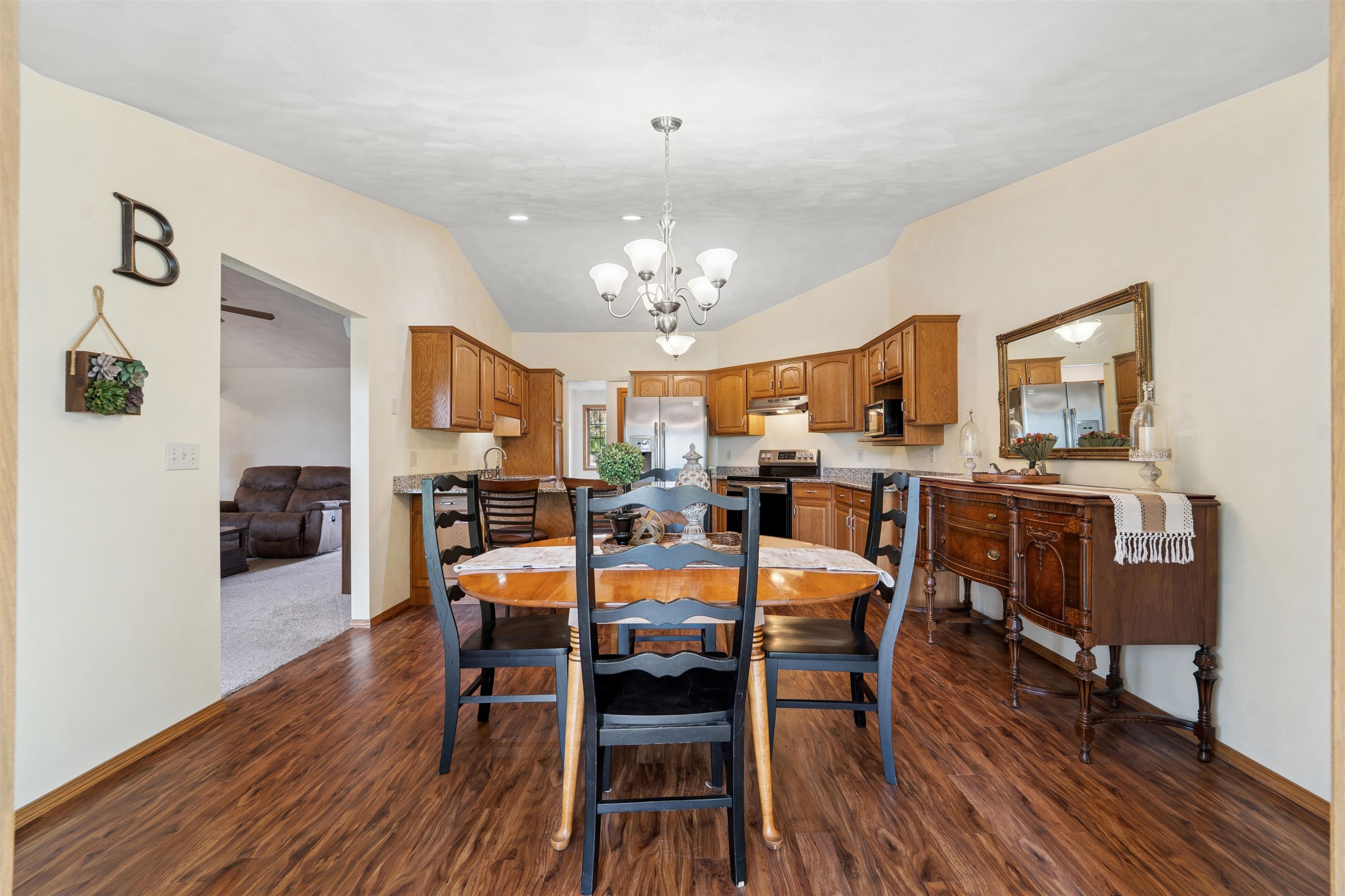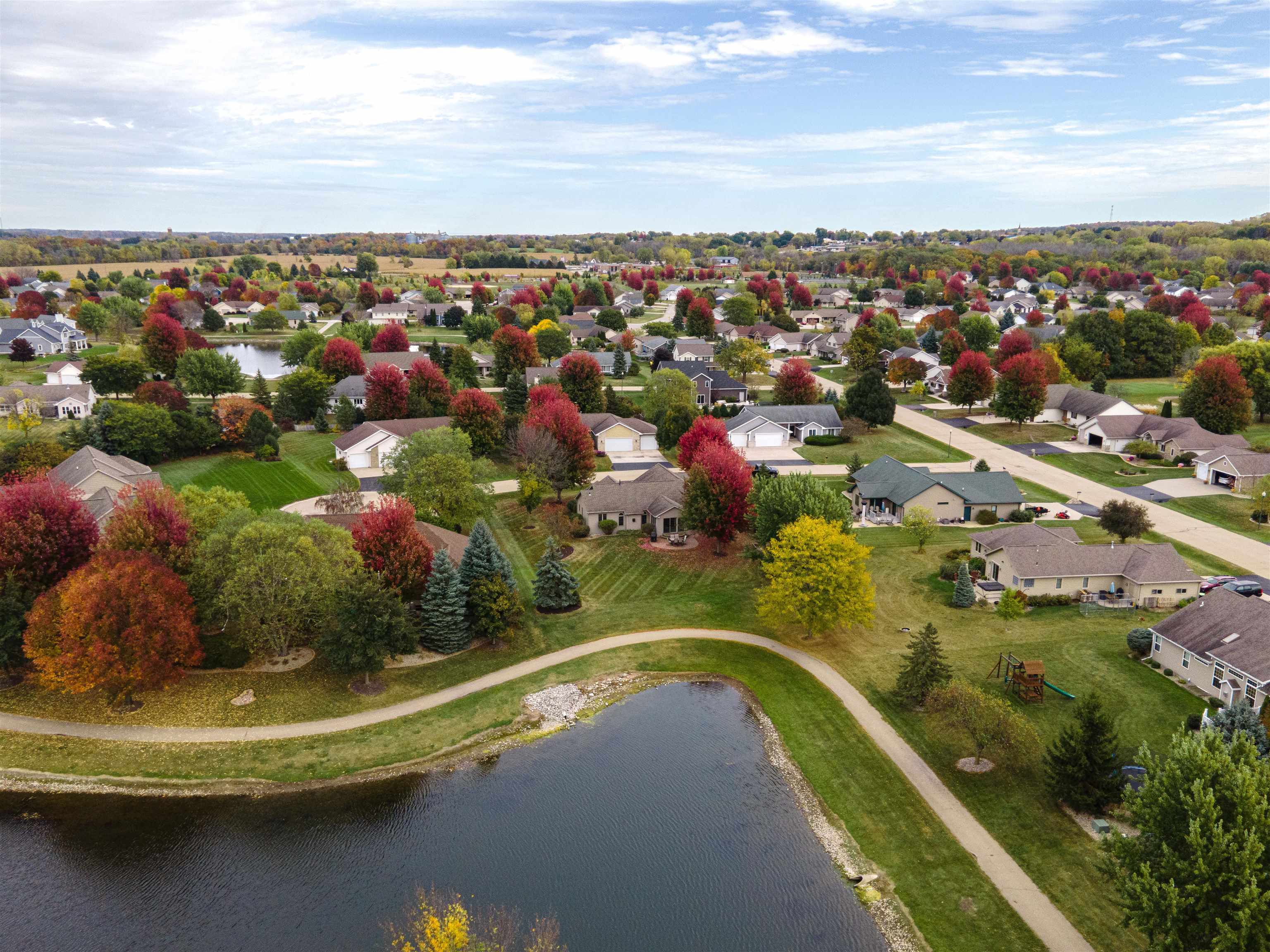 Desirable split-bedroom ranch! As you enter the home, the living room greets you with a cathedral ceiling and a cozy gas fireplace. The open-concept design flows into the kitchen, featuring granite countertops, breakfast bar, and a full appliance package. Adjacent to the kitchen is the dining area with access to your four-season room and concrete patio overlooking the pond — perfect for relaxing or entertaining. The primary bedroom offers a walk-in closet and a private bath with a tile walk-in shower. Two additional bedrooms share the main bathroom. A spacious 3.5 attached garage with generator plug and includes stairs leading down to the basement. Steps away from High Cliff State Park and Lake Winnebago!