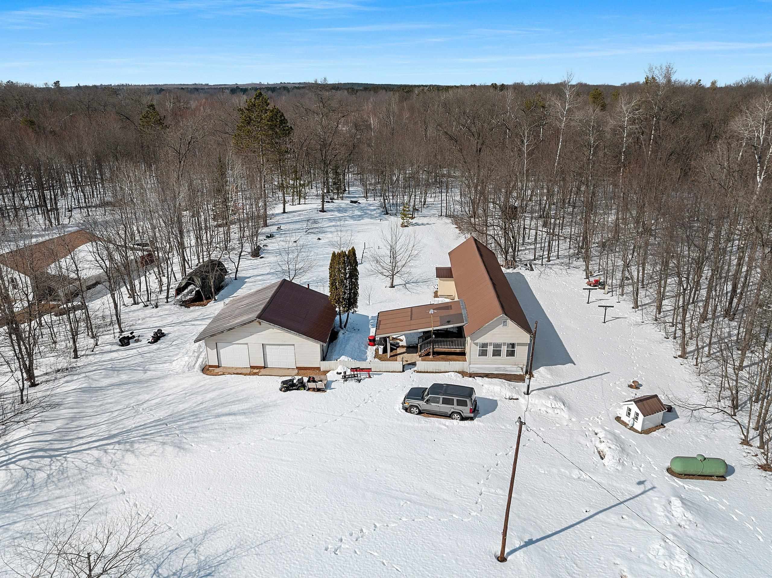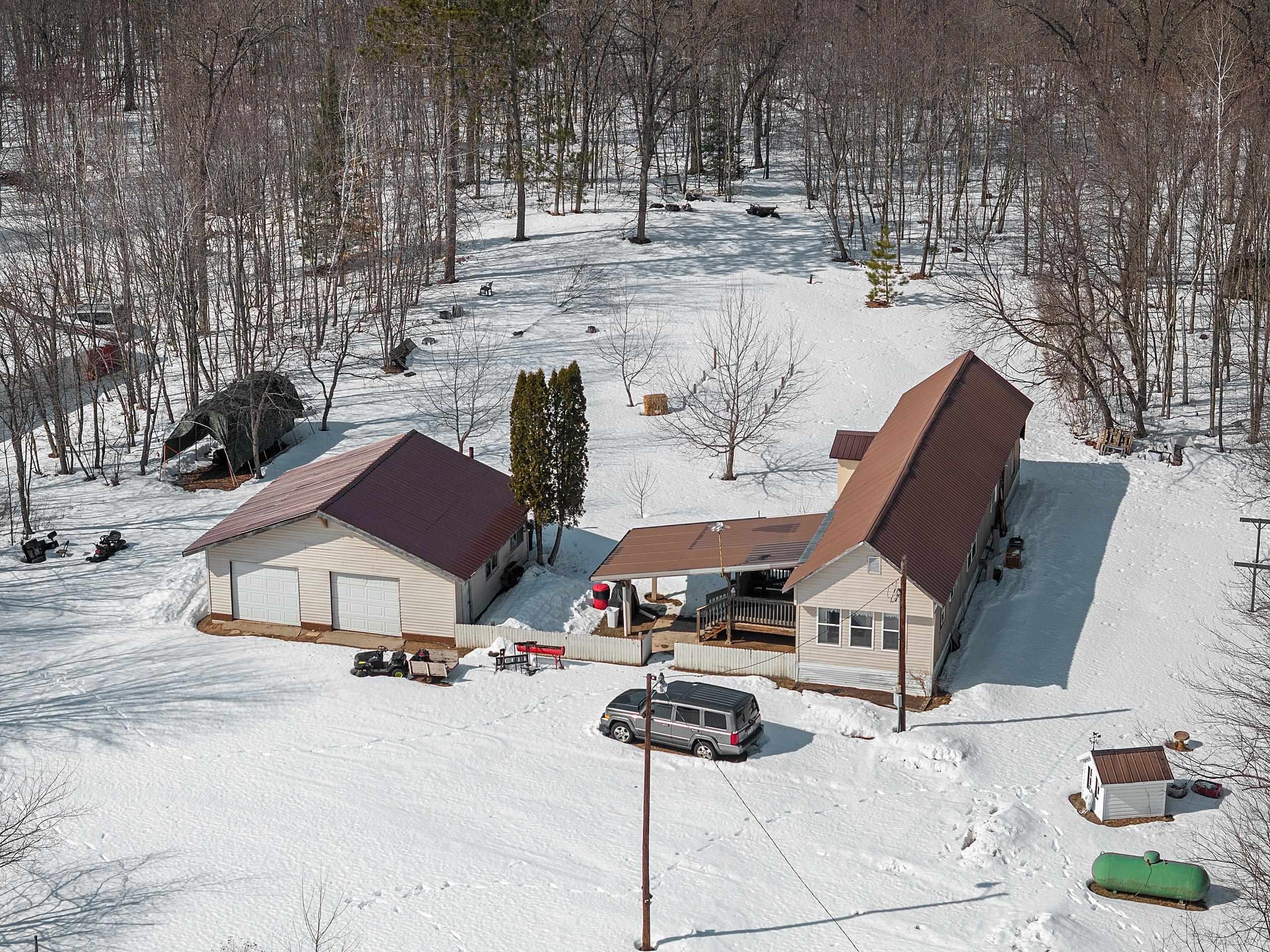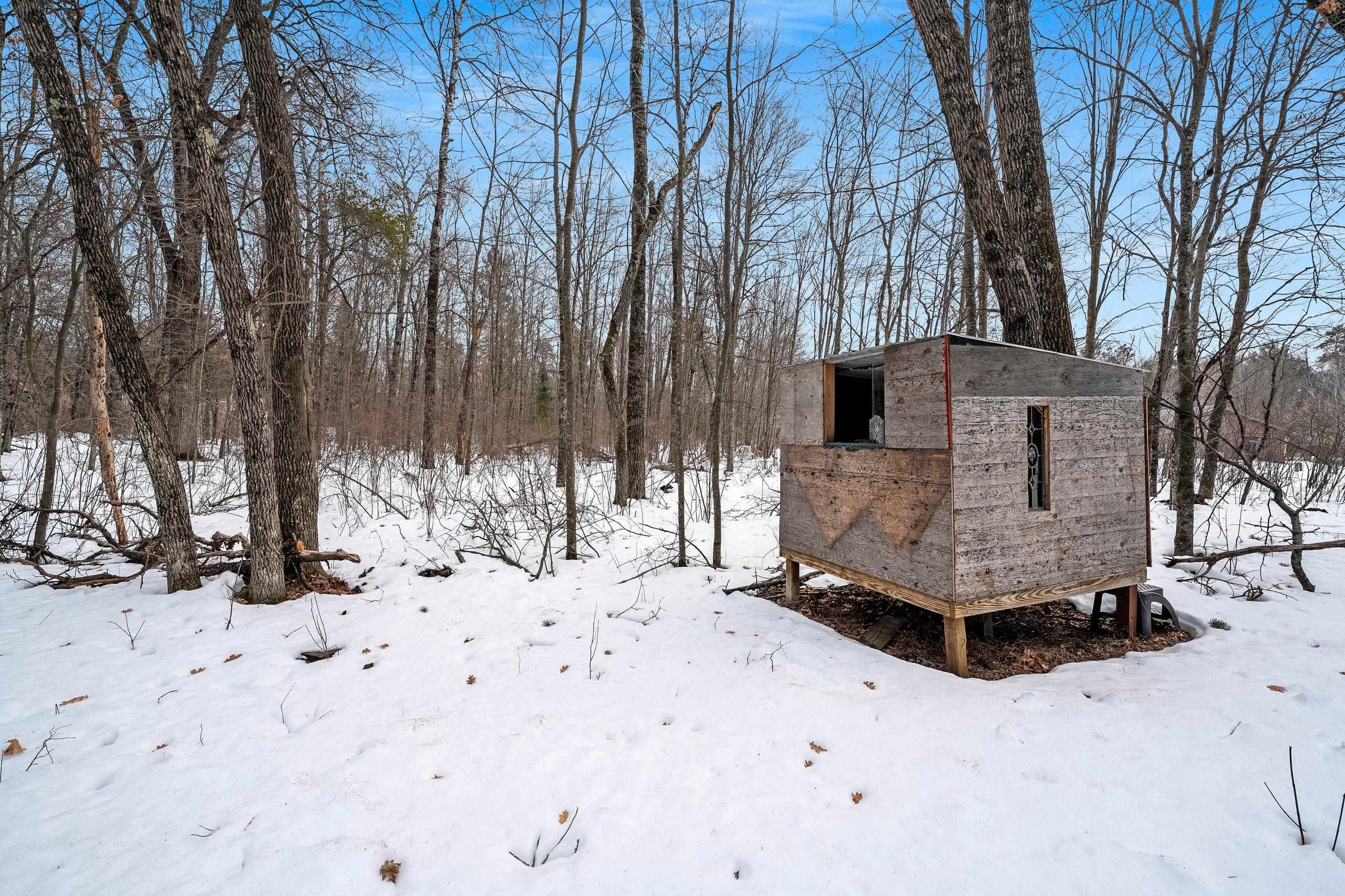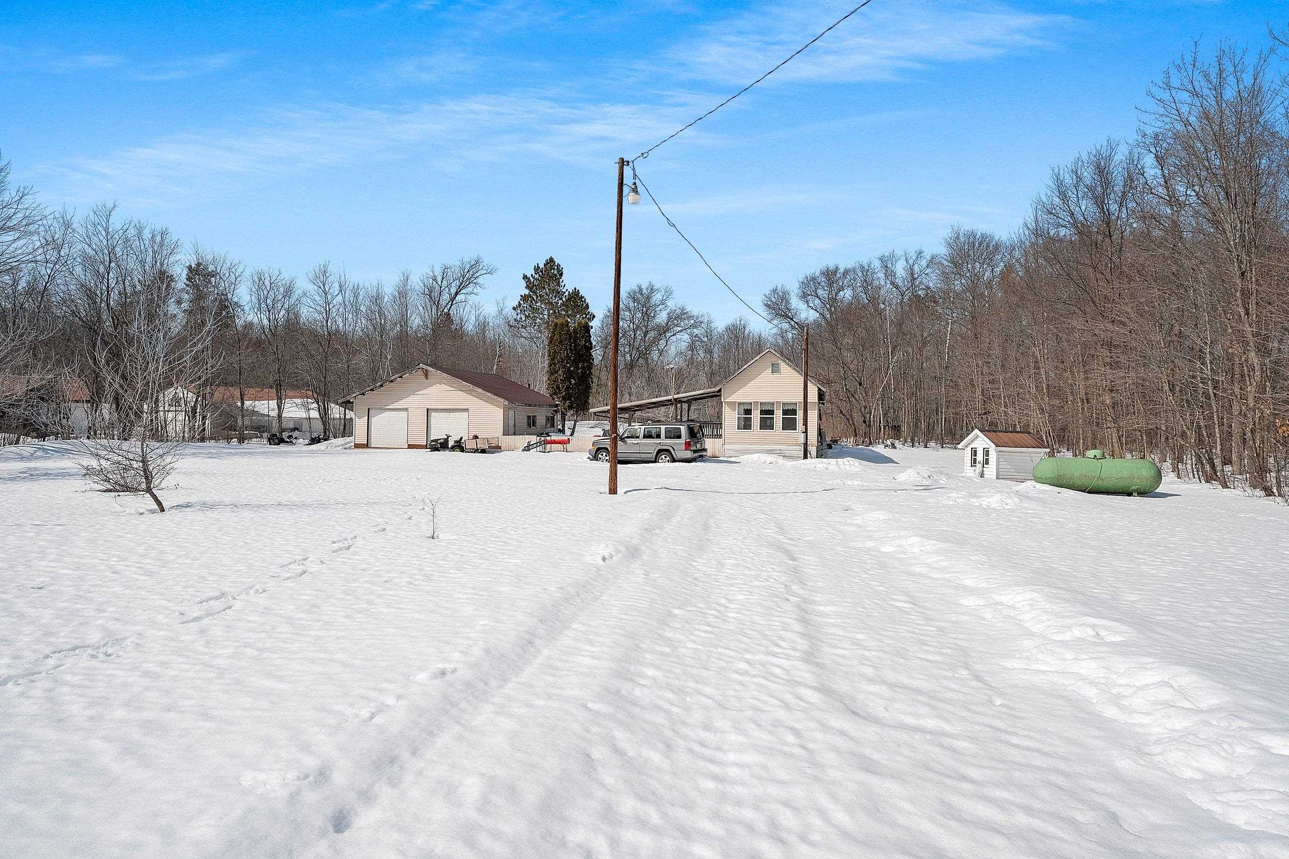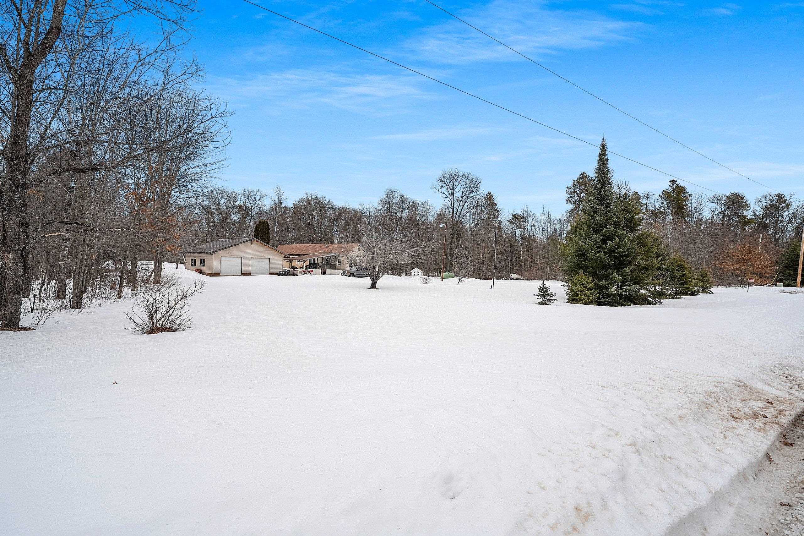 Excellent opportunity to own 3.46 acres in an outstanding location in the north woods! This parcel is situated on a quiet, dead end road near ATV/UTV trails as well as snowmobile trails, plenty of restaurants in the surrounding areas and many bodies of water to enjoy including but not limited to Big and Little Newton Lake, High Falls Flowage and Caldron Falls. Large garage, structure on site could make a great hunting cabin, or, tear it down, start fresh and build! Per Seller, there is a fully functioning conventional drilled well as well as conventional septic. Well was previously shared, however, there is no shared well agreement recorded. Well is owned by this Property. LP tank owned. Measurements are approximate, Buyer to verify. Property is being sold as-is to settle an estate.