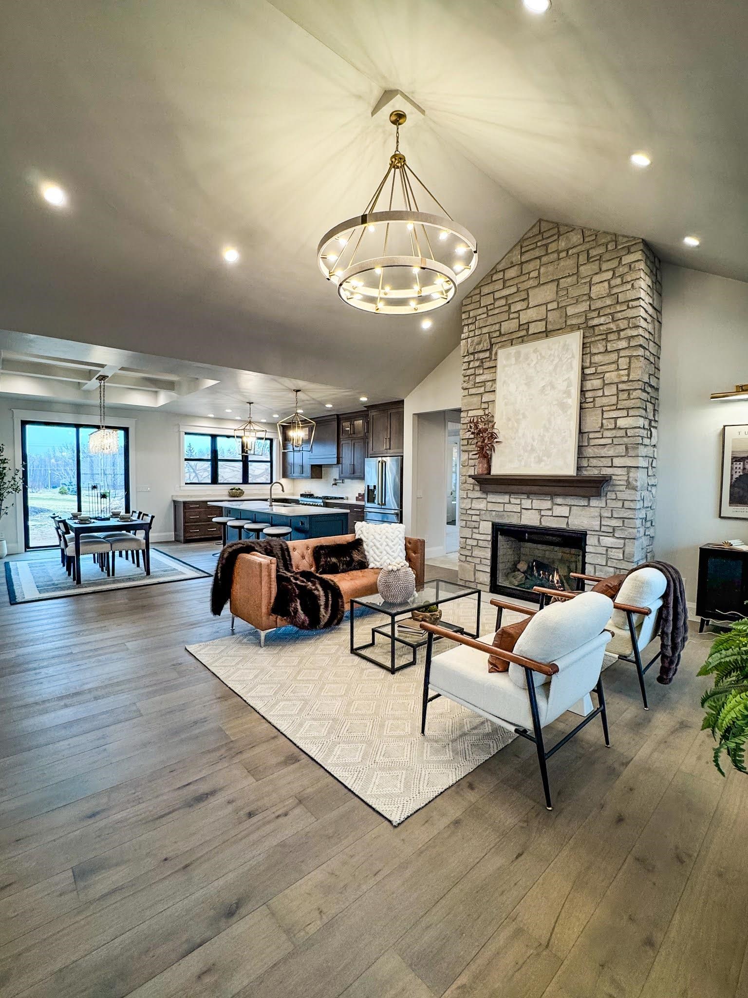 Welcome to this stunning 1,954 sq ft custom-built home, set on a 1/2 acre. This 3bd, 2.5-ba home blends elegance & comfort, feat wood floors, 8’ int doors, and 9’ ceilings with a breathtaking 14’ cathedral ceiling in the living room. The heart of the home centers around a floor-to-ceiling stone fireplace & an abundance of custom cabinetry & quartz tops extending throughout. The kitchen includes high-end appliances, quartz countertops, & a walk-in pantry designed for both beauty & function. The primary suite offers a walk-in tiled shower surrounded by floor-to-ceiling glass, a soaking tub, and luxury finishes. Heated and finished garage, 9' basement, ext gas lanterns, salt box lighting. Every detail has been thoughtfully crafted to create a home that defines luxury living at its finest.