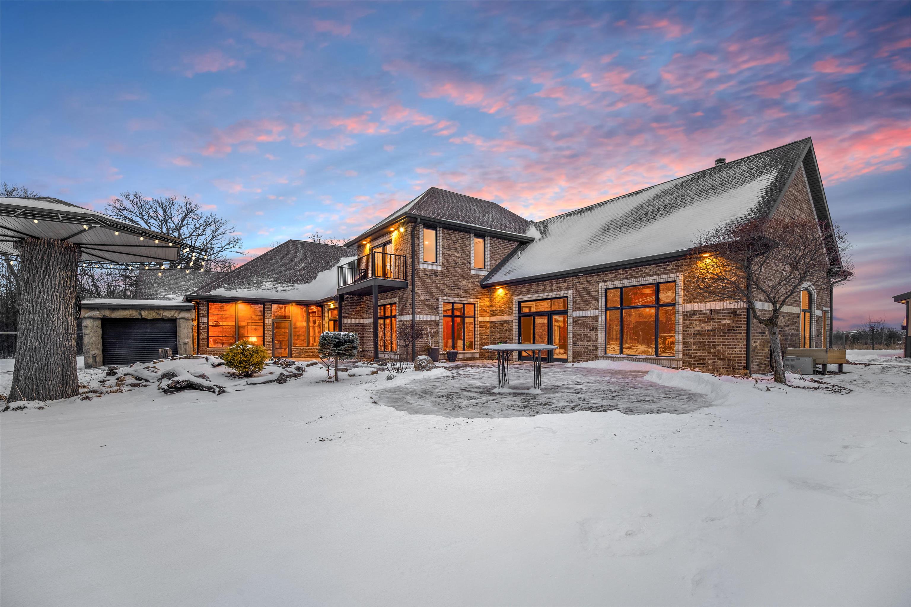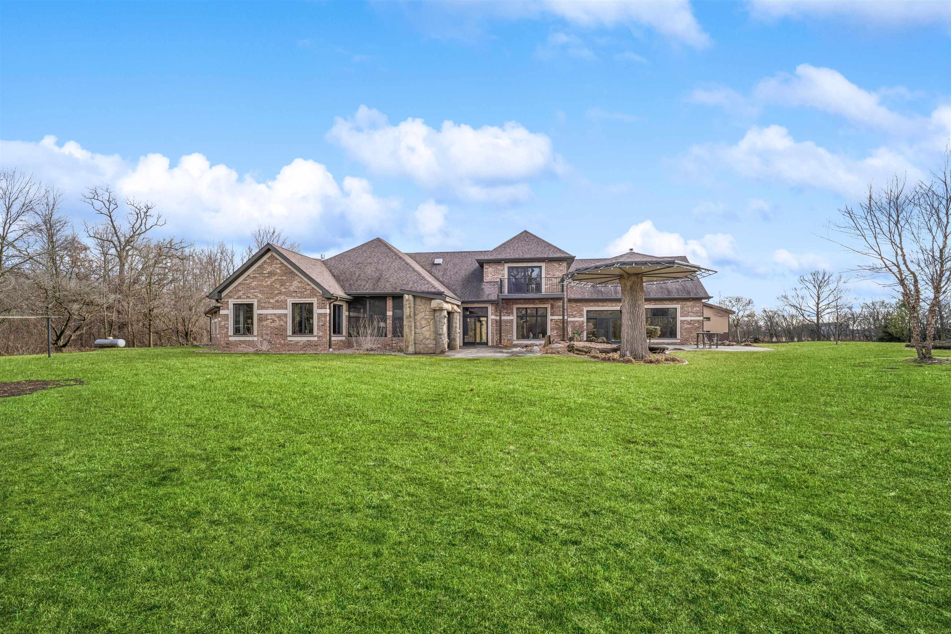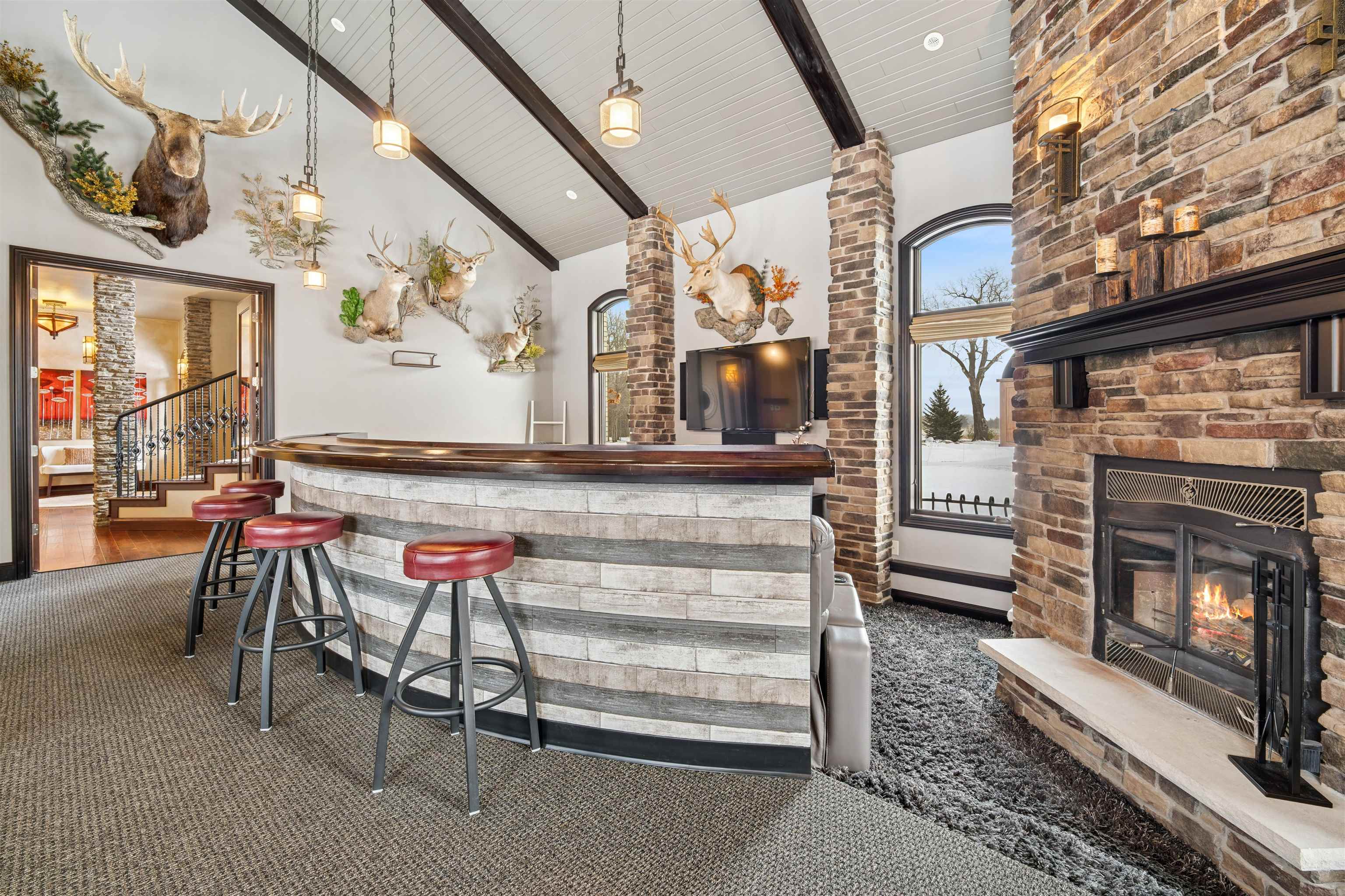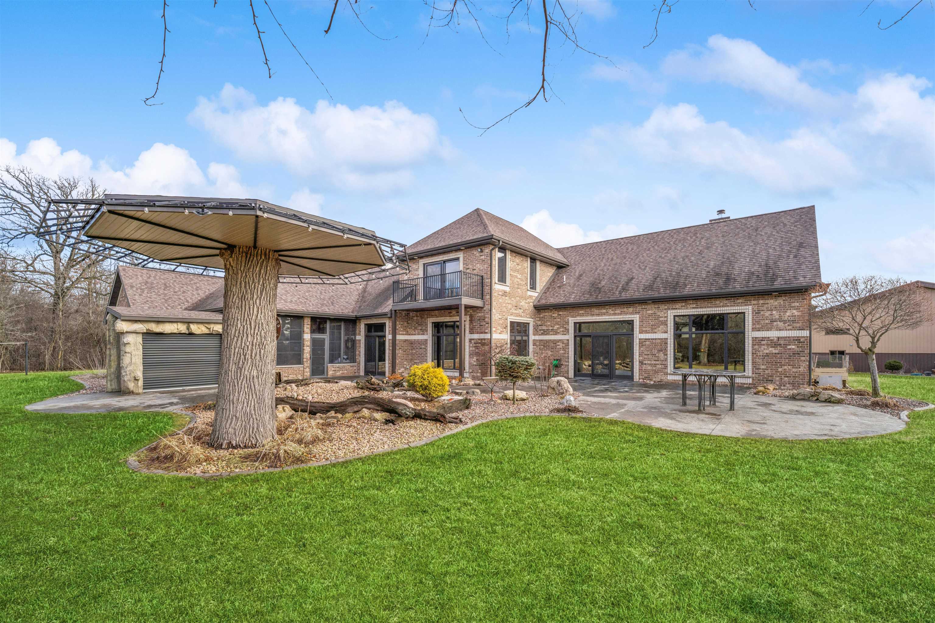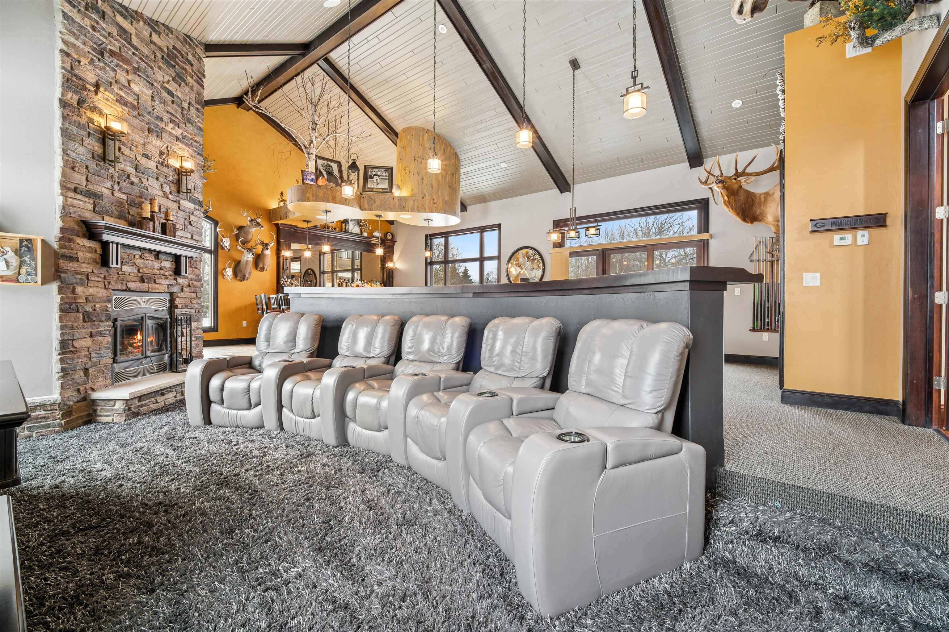 Experience refined living in this ENERGY EFFICIENT and luxury home featuring a timeless brick & stone exterior. Property includes a 60X80 dream workshop with office, hunting/game rm, heated shop with loft, & bathroom that is perfect for business, hobbies, or storage! Enjoy an elegant living space with gourmet kitchen that flows seamlessly to the adjacent living rm. Massive entertainment rm impresses with a wood-burning FP, custom bar, & theatre seating ideal for gatherings! Private primary suite is a true retreat with a cozy FP and spa inspired bath with tile shower & jetted tub! Large bedrooms, loads of storage space, finished attached garage, beautiful sunporch set up for hot tub, gorgeous yard w/ waterfalls & solar lighting! High efficiency with Geothermal system & 4 solar panels!