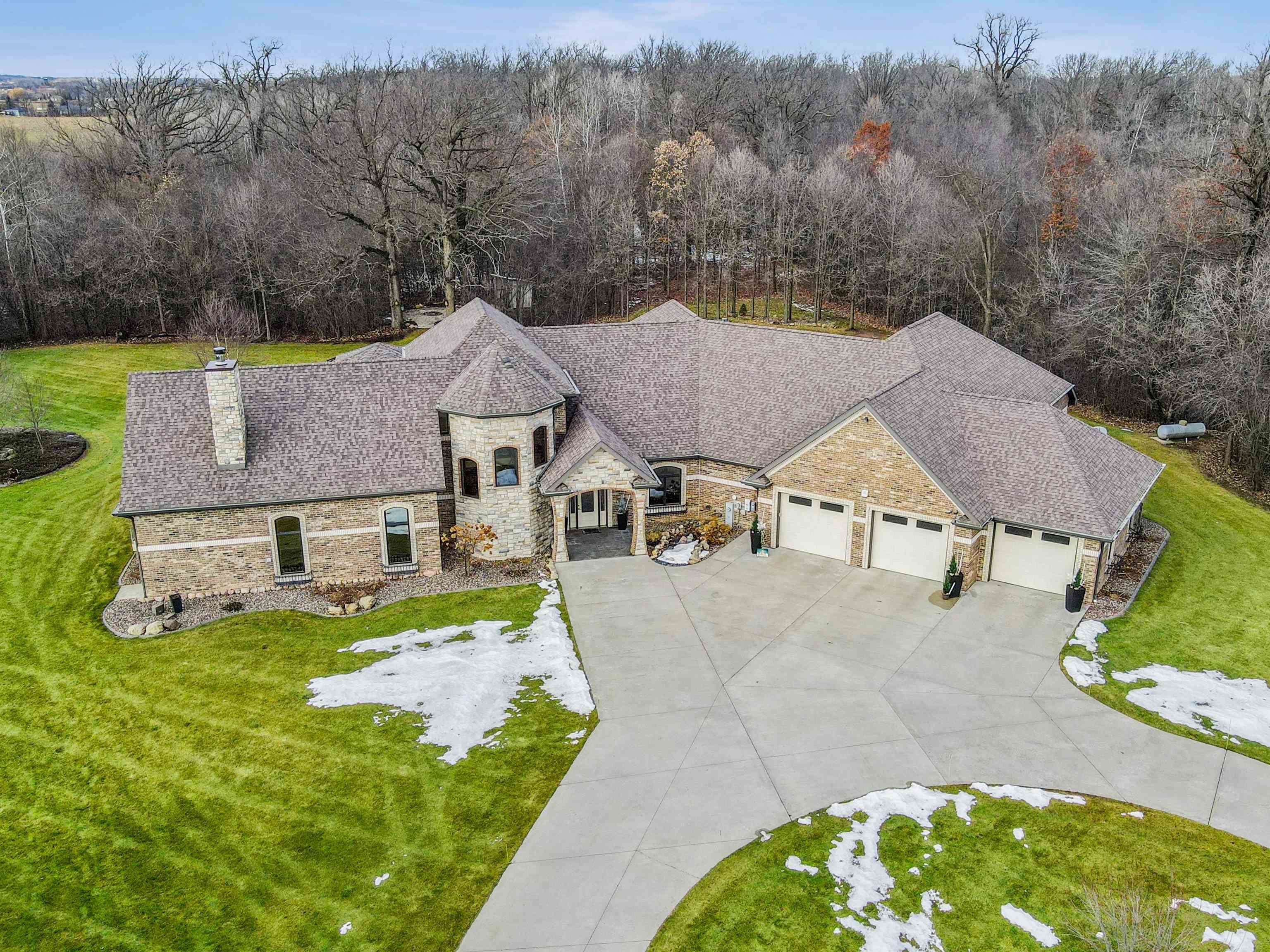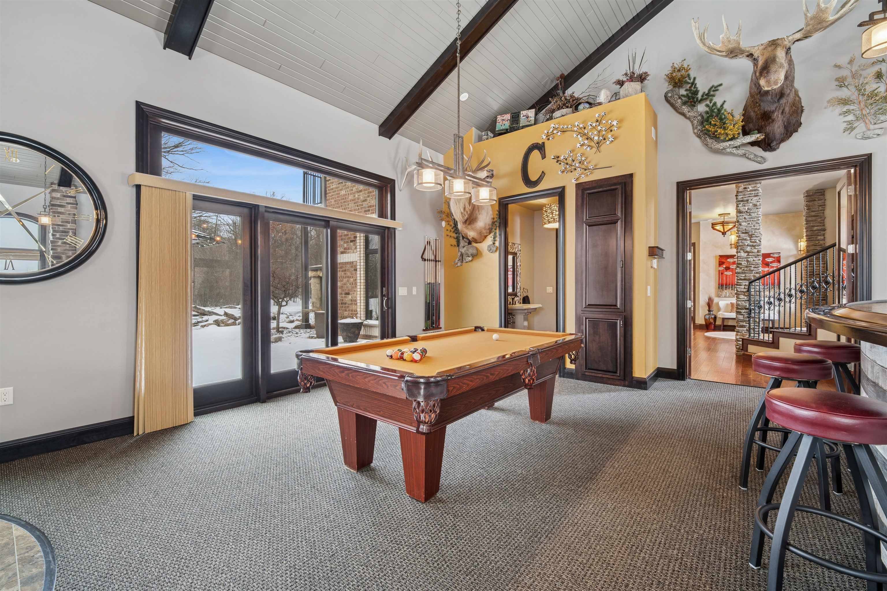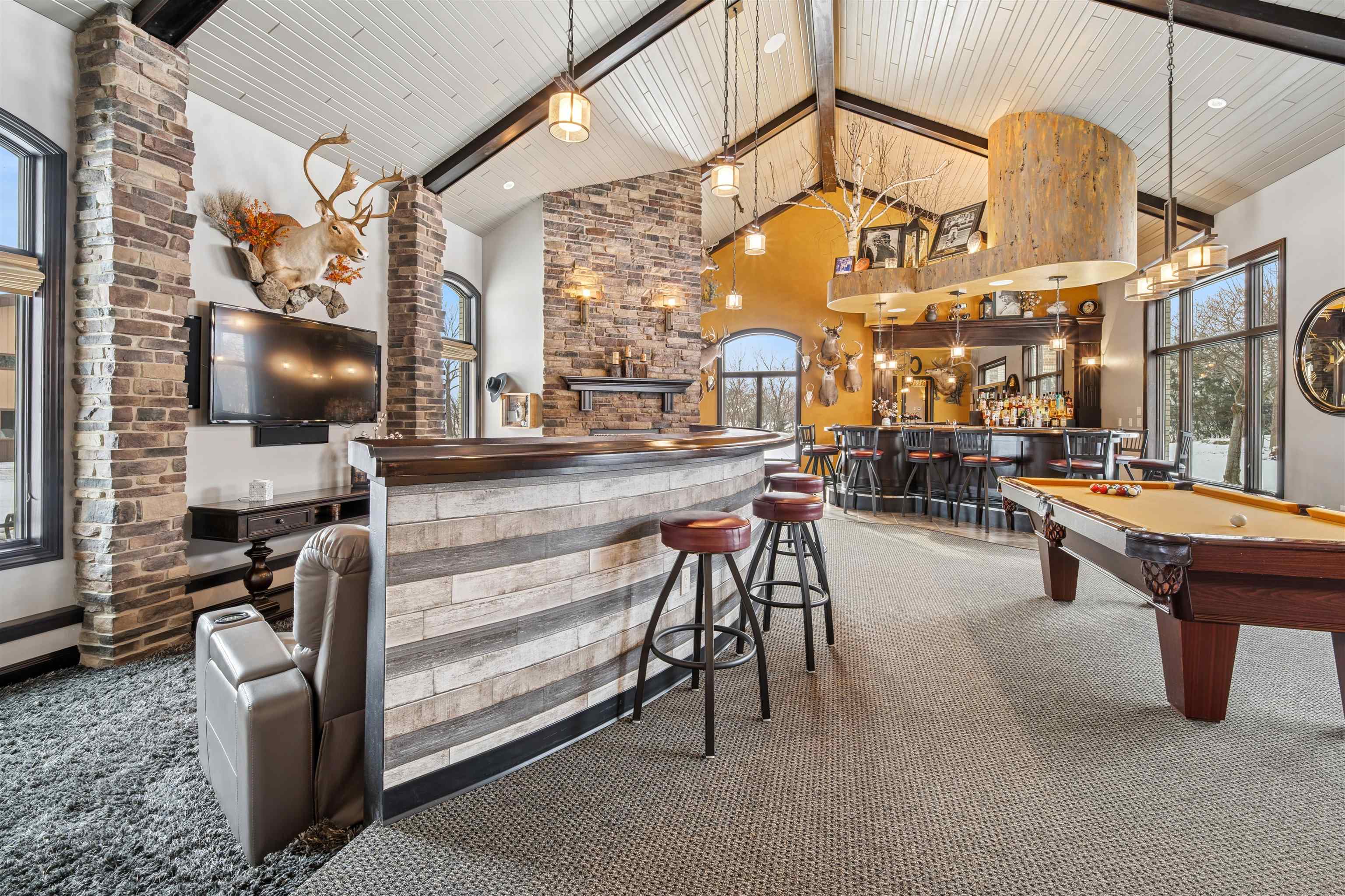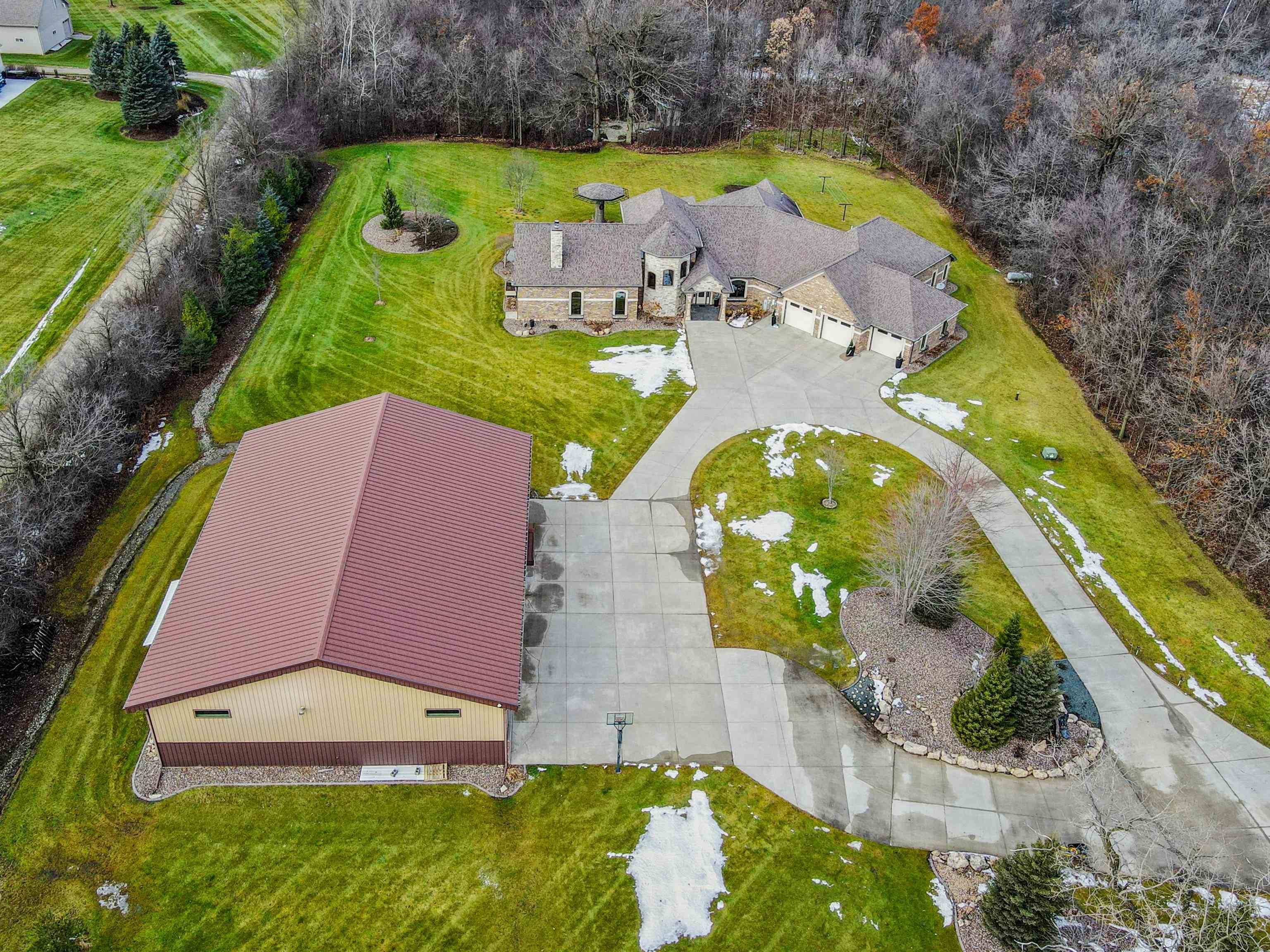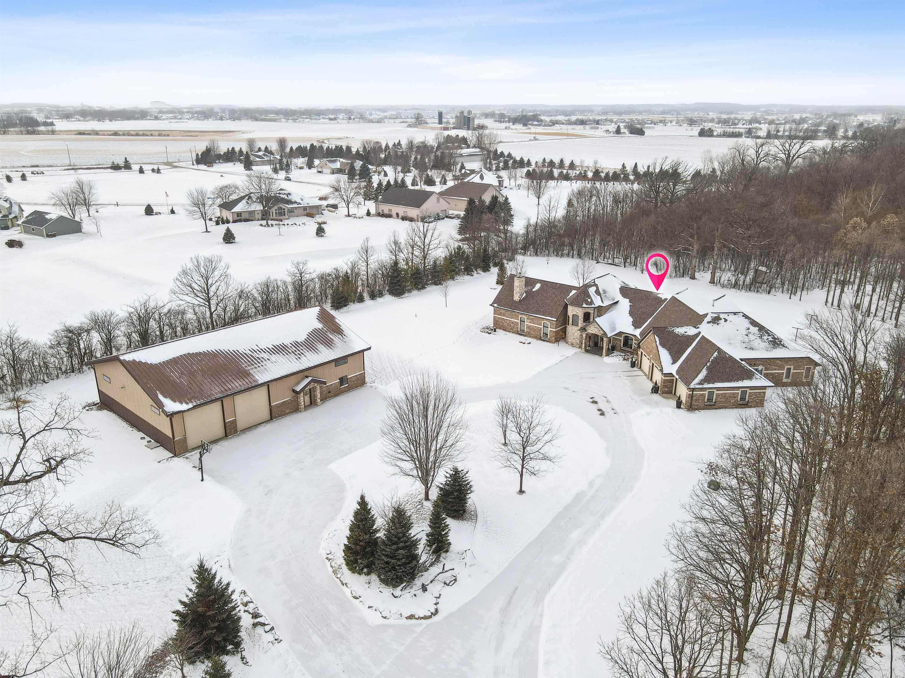 Experience refined living in this ENERGY EFFICIENT and luxury home featuring a timeless brick & stone exterior. Property includes a 60X80 dream workshop with office, hunting/game rm, heated shop with loft, & bathroom that is perfect for business, hobbies, or storage! Enjoy an elegant living space with gourmet kitchen that flows seamlessly to the adjacent living rm. Massive entertainment rm impresses with a wood-burning FP, custom bar, & theatre seating ideal for gatherings! Private primary suite is a true retreat with a cozy FP and spa inspired bath with tile shower & jetted tub! Large bedrooms, loads of storage space, finished attached garage, beautiful sunporch set up for hot tub, gorgeous yard w/ waterfalls & solar lighting! High efficiency with Geothermal system & 4 solar panels!