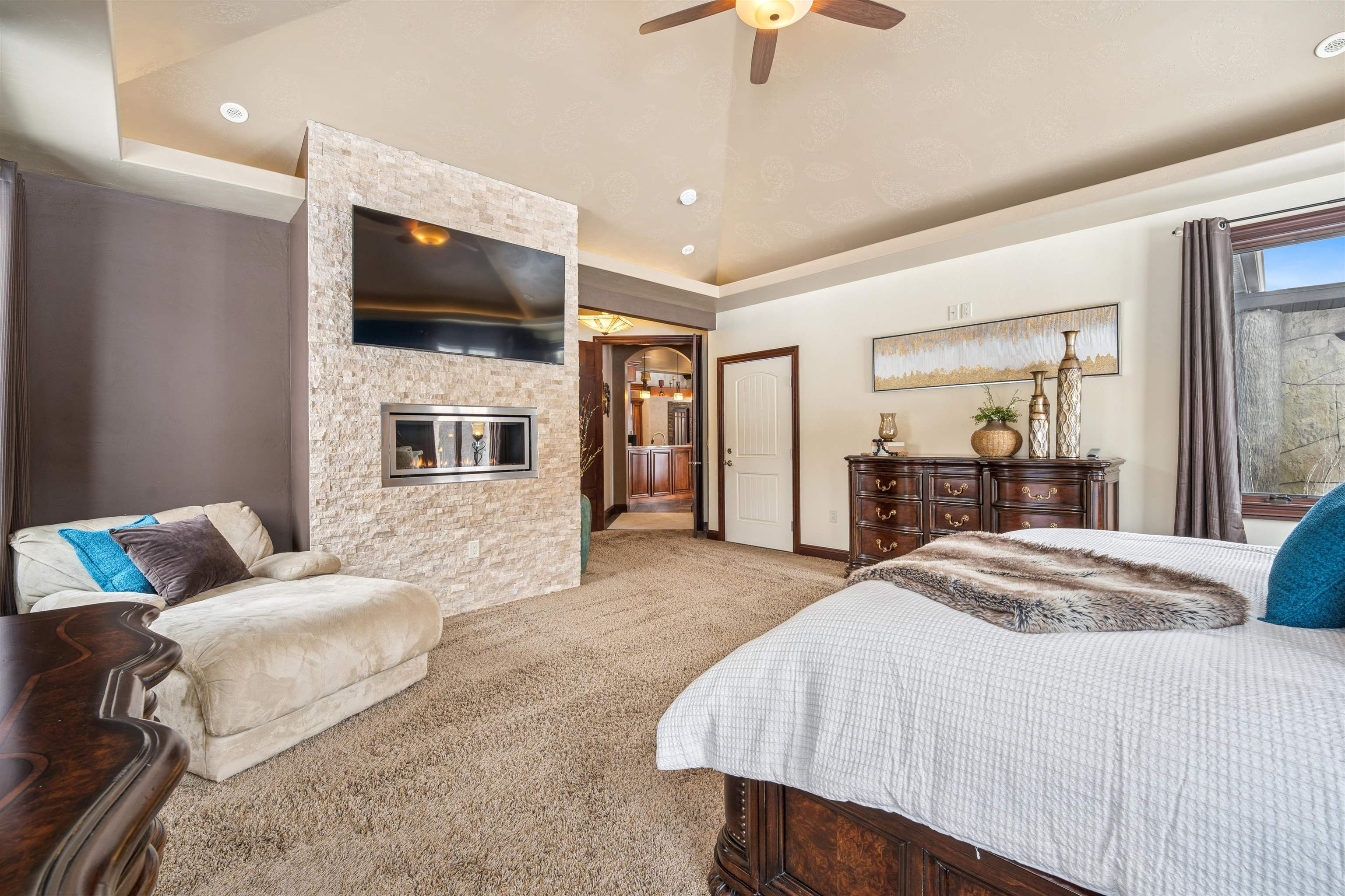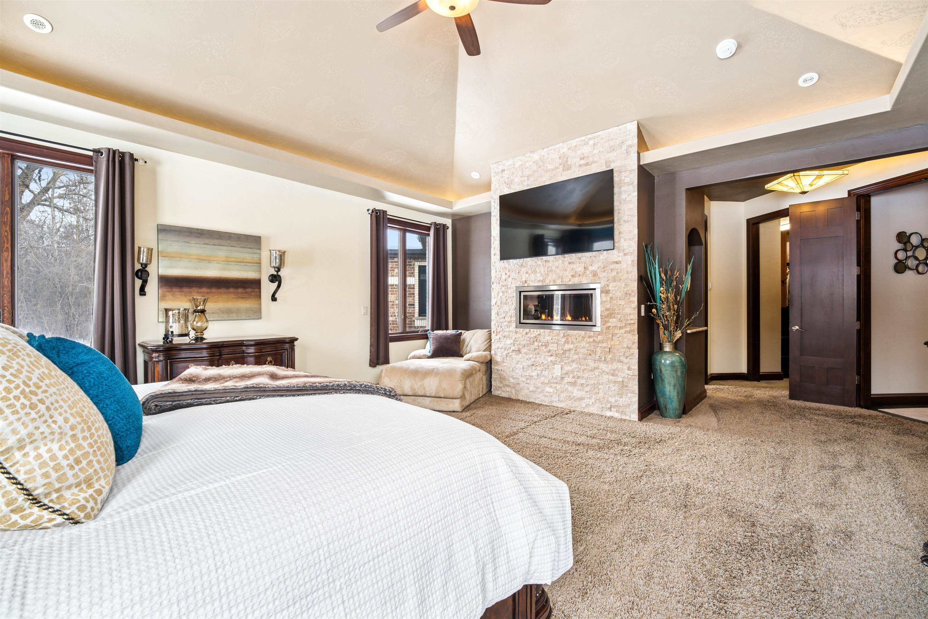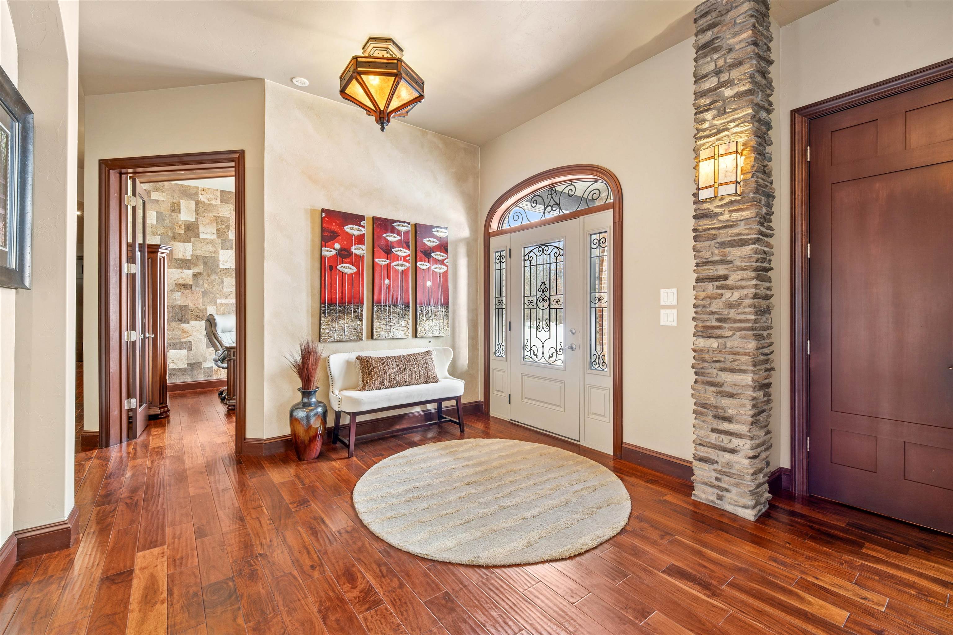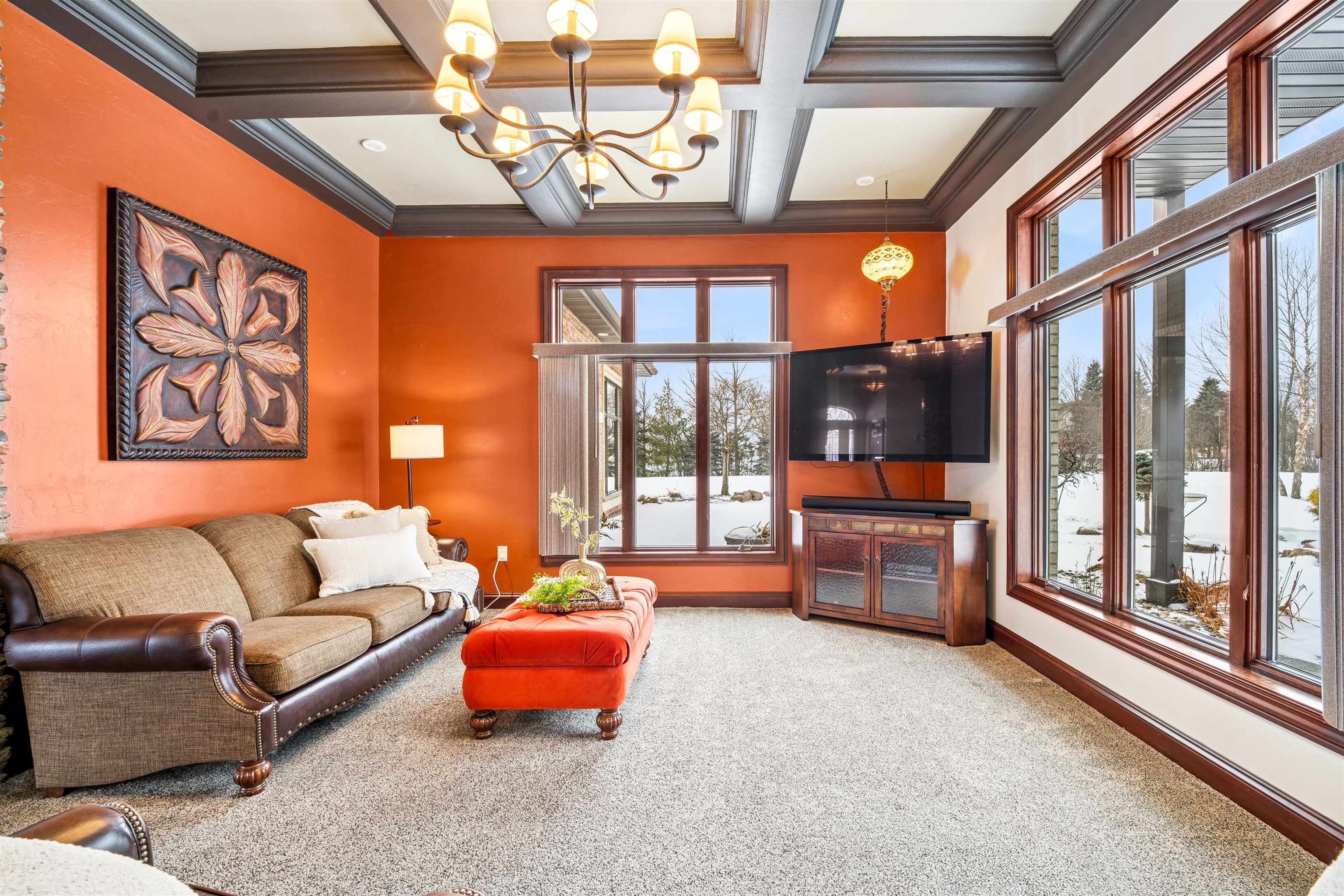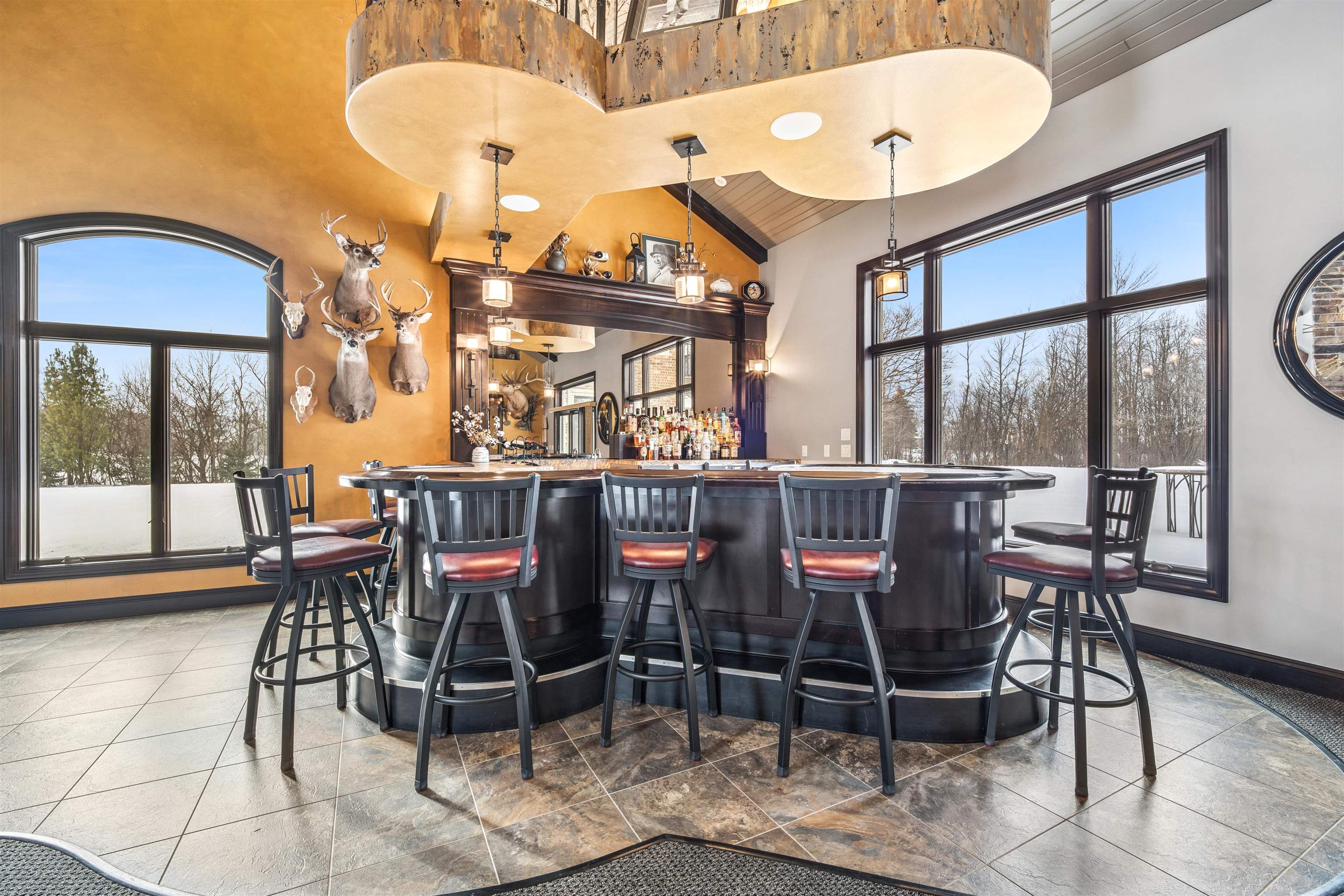 Experience refined living in this ENERGY EFFICIENT and luxury home featuring a timeless brick & stone exterior. Property includes a 60X80 dream workshop with office, hunting/game rm, heated shop with loft, & bathroom that is perfect for business, hobbies, or storage! Enjoy an elegant living space with gourmet kitchen that flows seamlessly to the adjacent living rm. Massive entertainment rm impresses with a wood-burning FP, custom bar, & theatre seating ideal for gatherings! Private primary suite is a true retreat with a cozy FP and spa inspired bath with tile shower & jetted tub! Large bedrooms, loads of storage space, finished attached garage, beautiful sunporch set up for hot tub, gorgeous yard w/ waterfalls & solar lighting! High efficiency with Geothermal system & 4 solar panels!