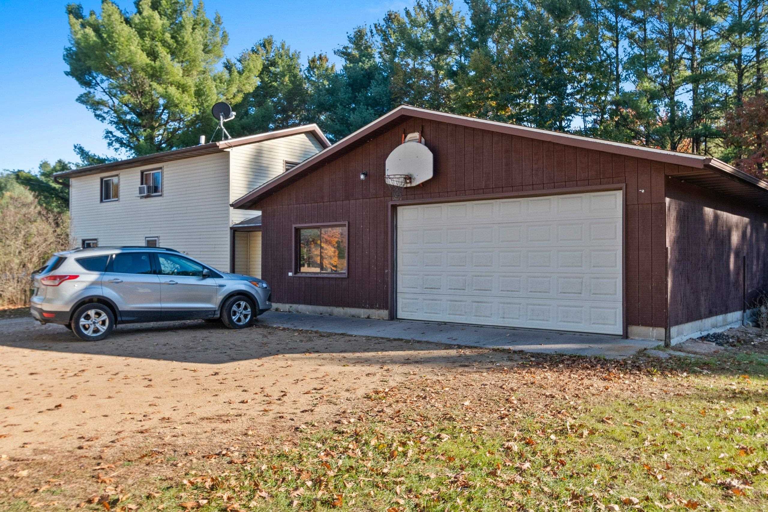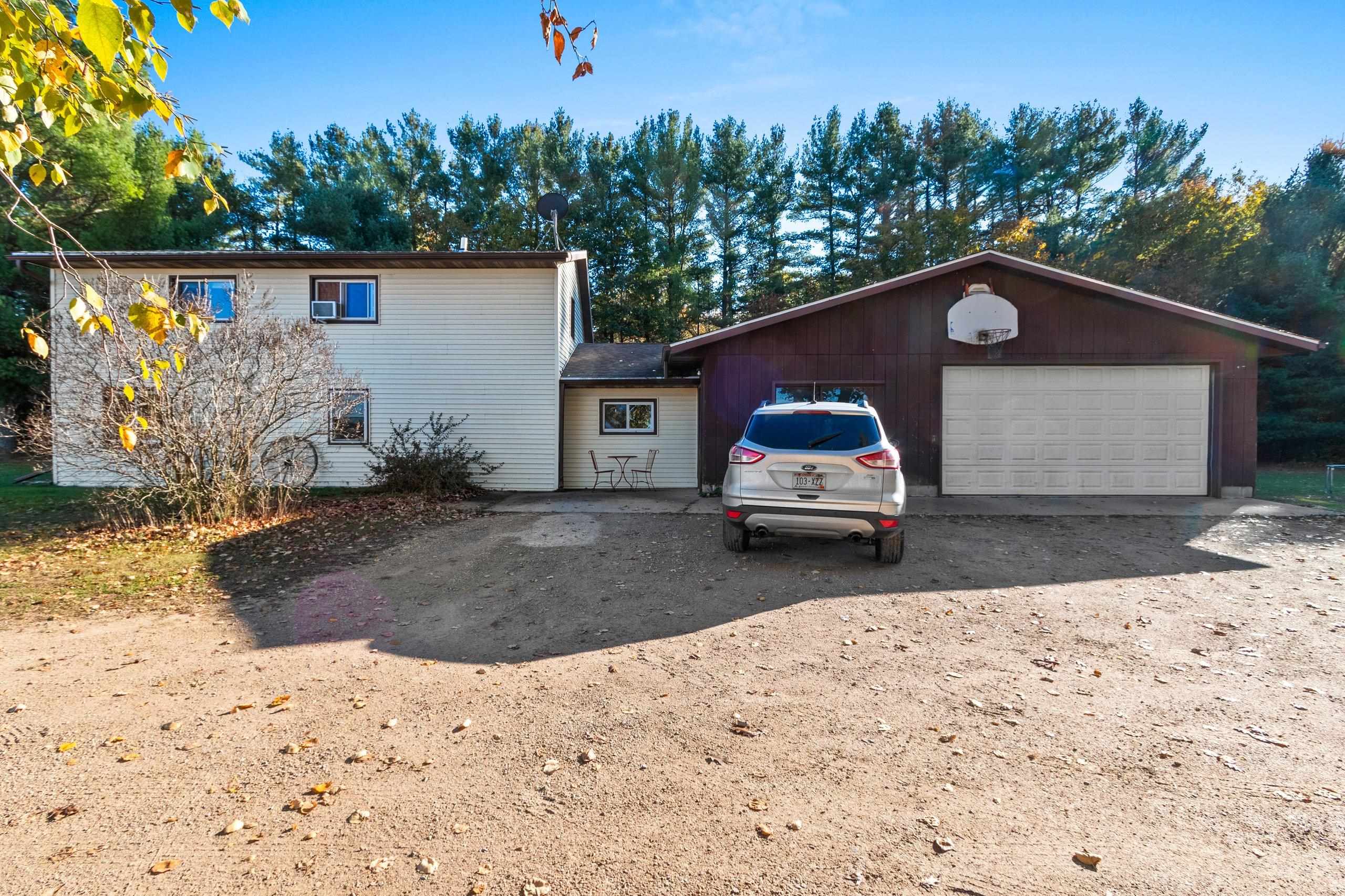 Welcome to your peaceful retreat nestled on 5 beautifully wooded acres just minutes from the scenic Wolf River. This well-maintained country home offers the perfect blend of privacy, comfort, and outdoor living. Step inside to find a thoughtfully designed layout with the convenience of first-floor laundry, making everyday living a breeze. Outside, enjoy your morning coffee or entertain guests on the spacious deck, or unwind on the patio while taking in the sights and sounds of nature. The fenced-in backyard provides a safe space for pets or play area, and the two-stall garage offers plenty of room for vehicles, tools, or outdoor gear. Nature lovers will appreciate the private walking trails that wind through the trees,